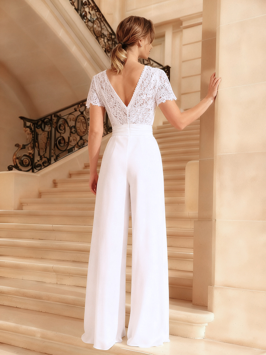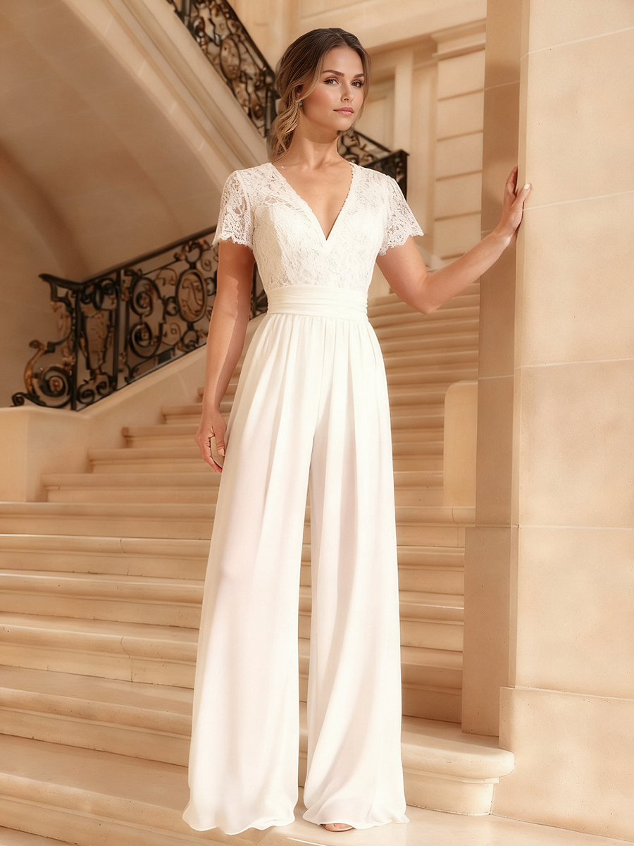 ブライダルジャンプスーツ レース プリーツ フロアレングス ジャンプスーツ Vネック 半袖 ナチュラルウエスト アイボリー