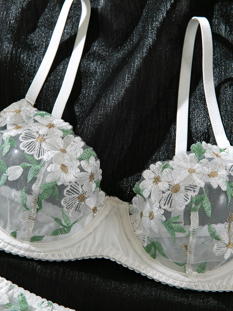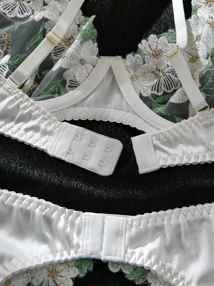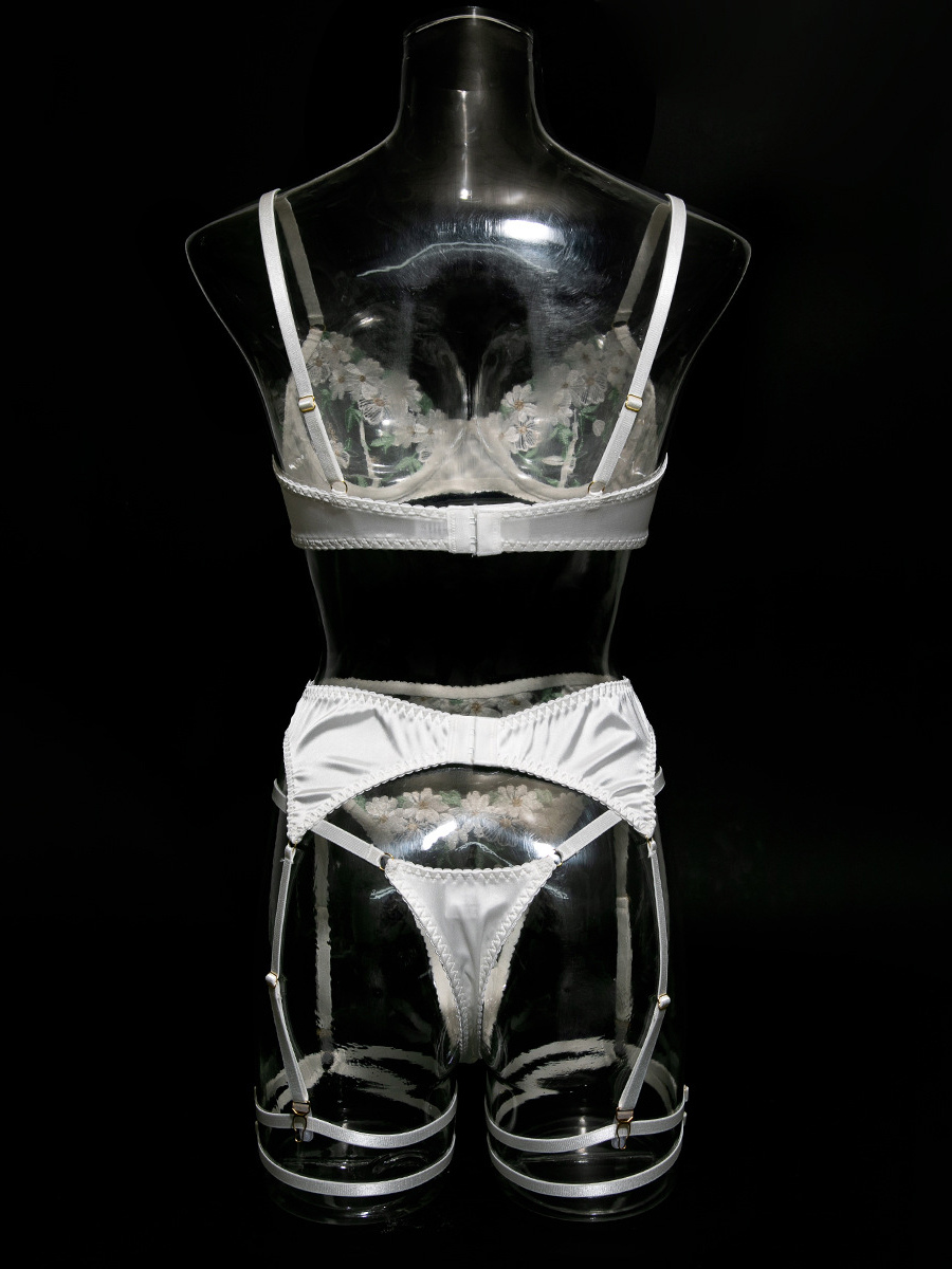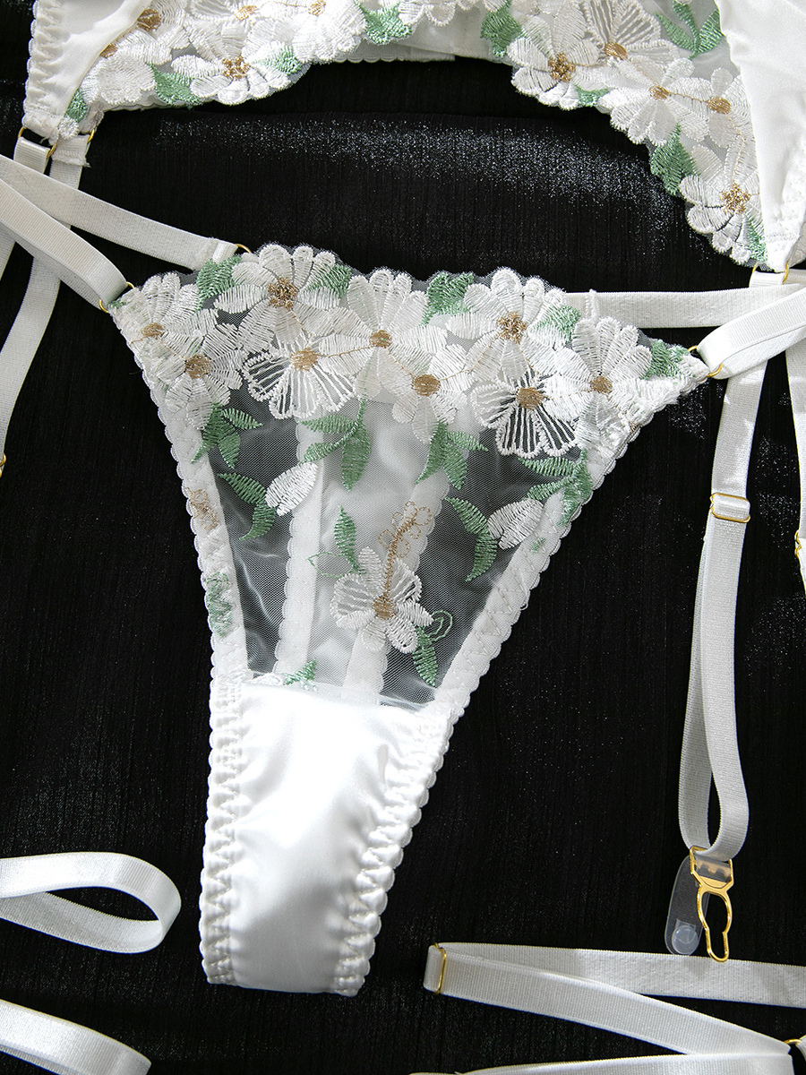 ブライダルランジェリー 花柄プリント シースルーネット ホワイト ブラジャー&ショーツ 4点セット