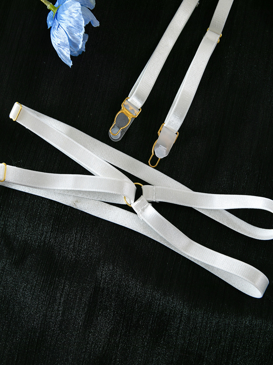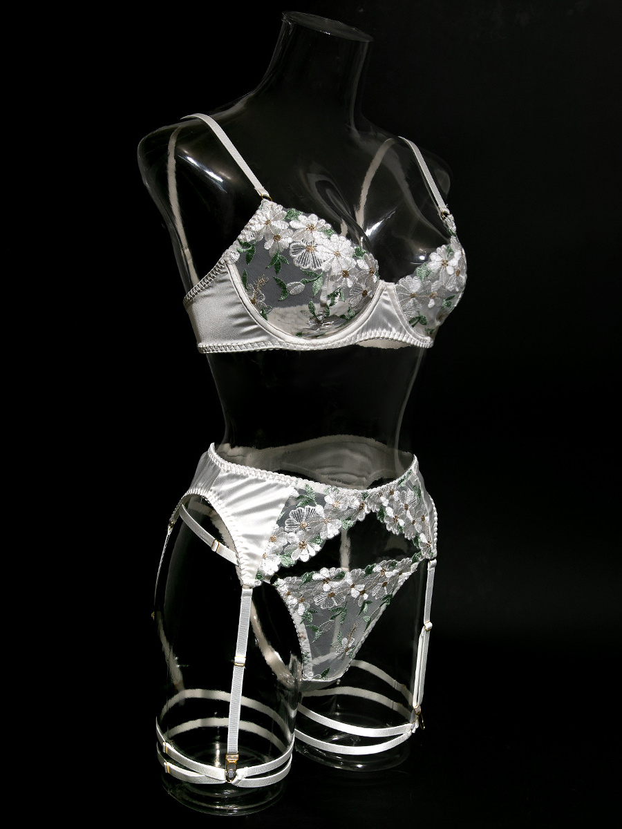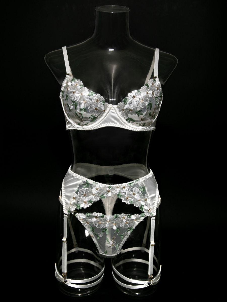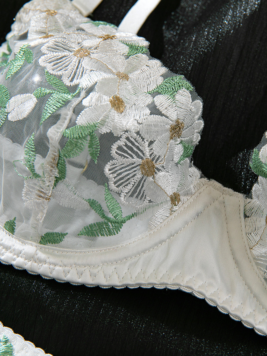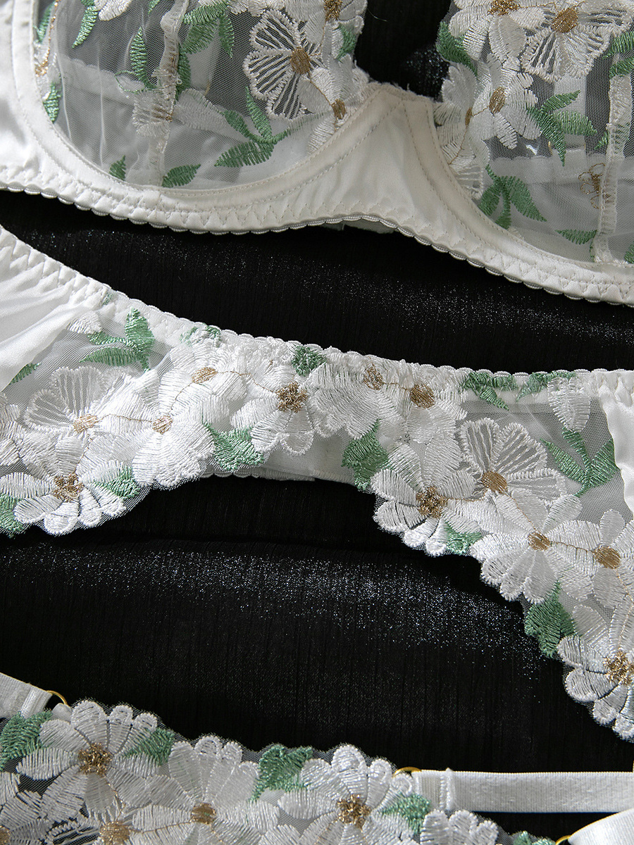 ブライダルランジェリー 花柄プリント シースルーネット ホワイト ブラジャー&ショーツ 4点セット