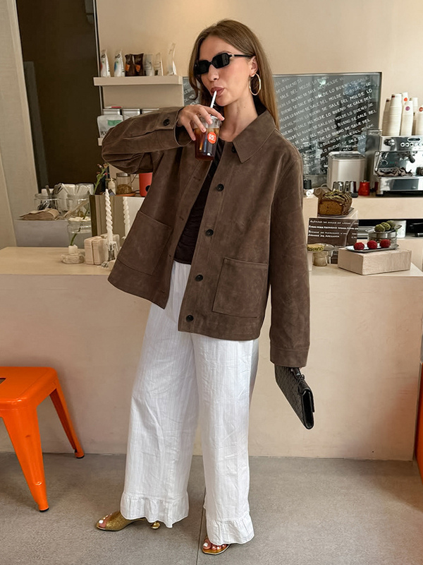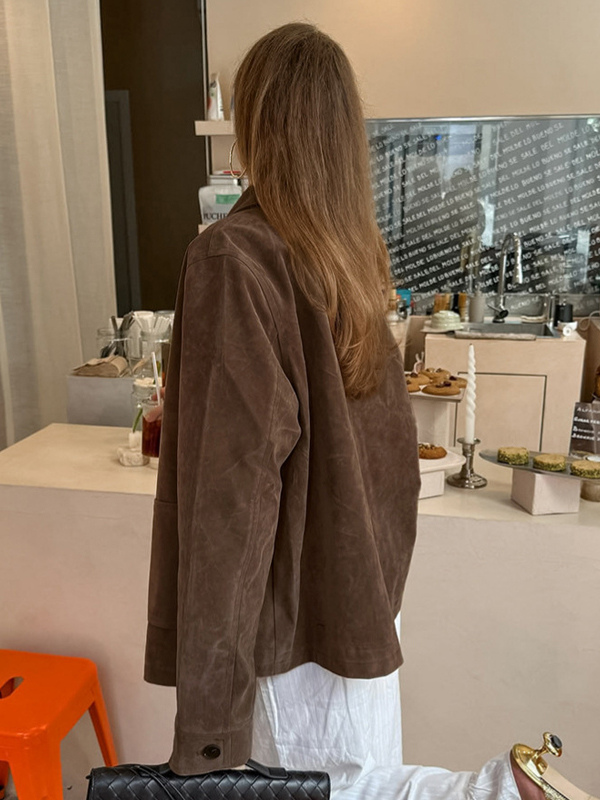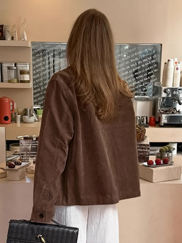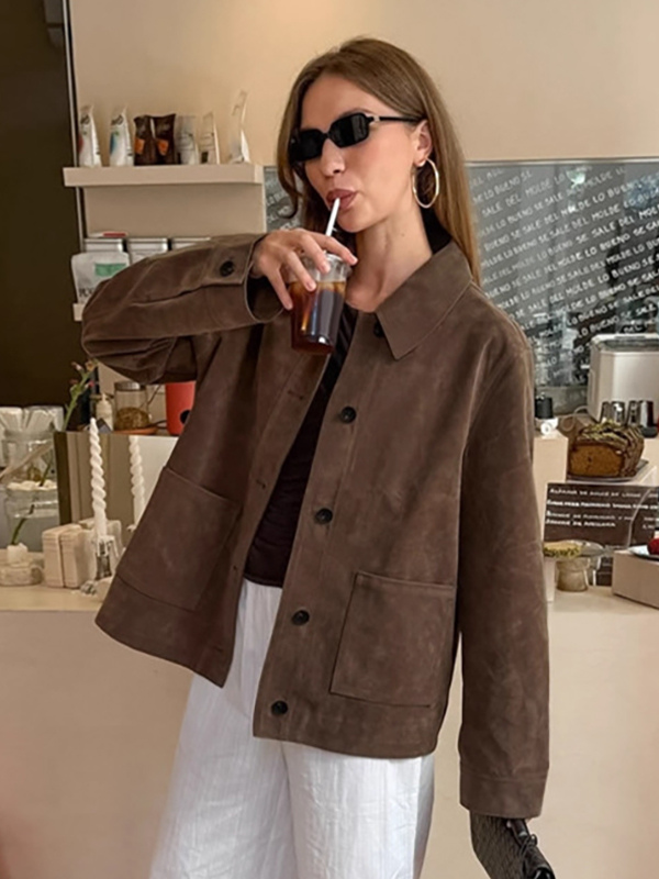 ブラウンのフェイクスエードレディースシャケット - ミニマルなターンカラーボタンアップジャケット(ポケット付き) - 2026年春のカジュアルストリートウェア