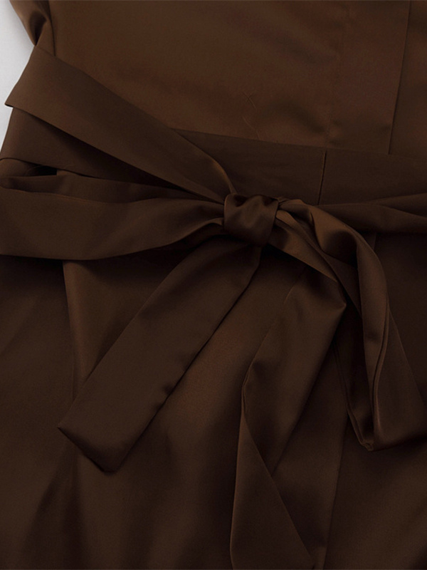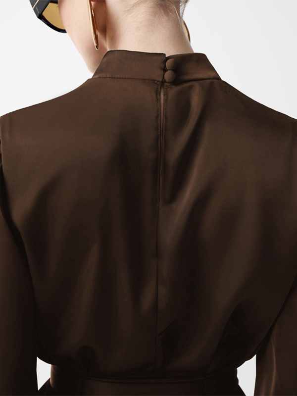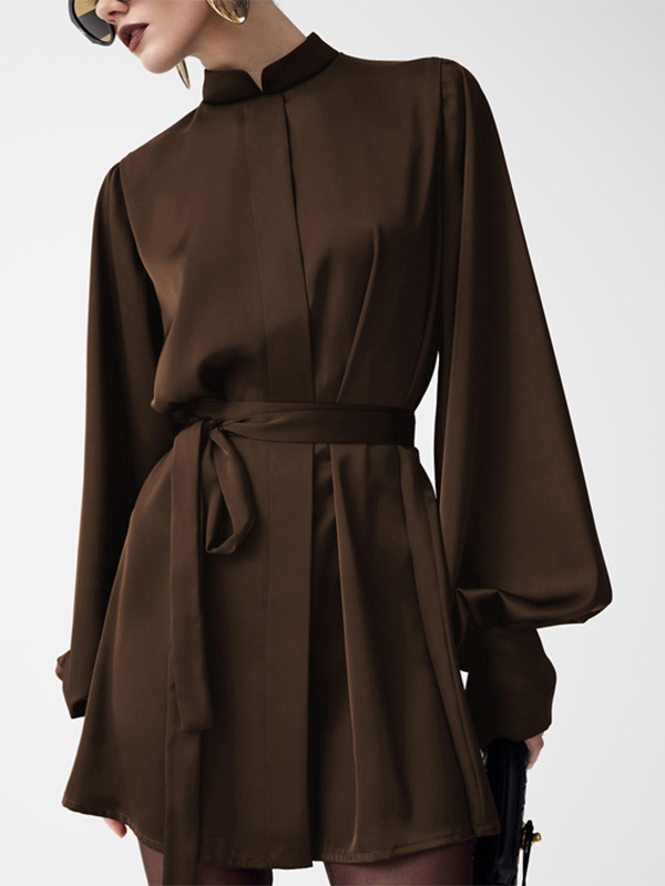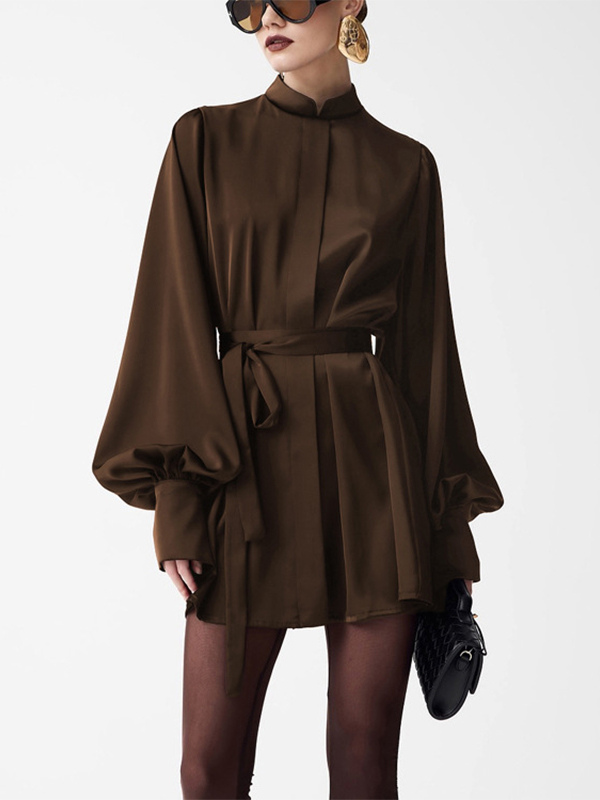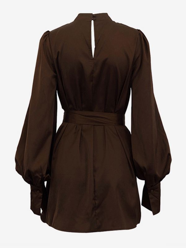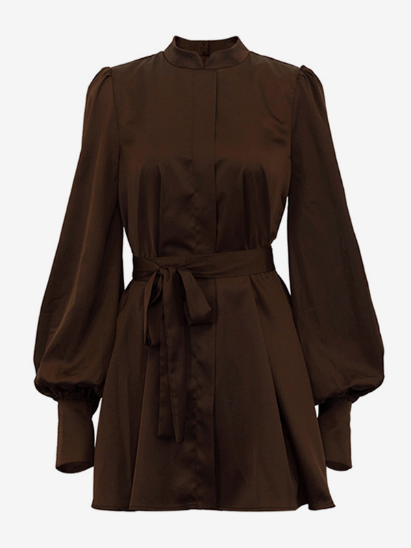 ハイネックとランタンスリーブのブラウンサテンミニシャツドレス(レディース 2025)