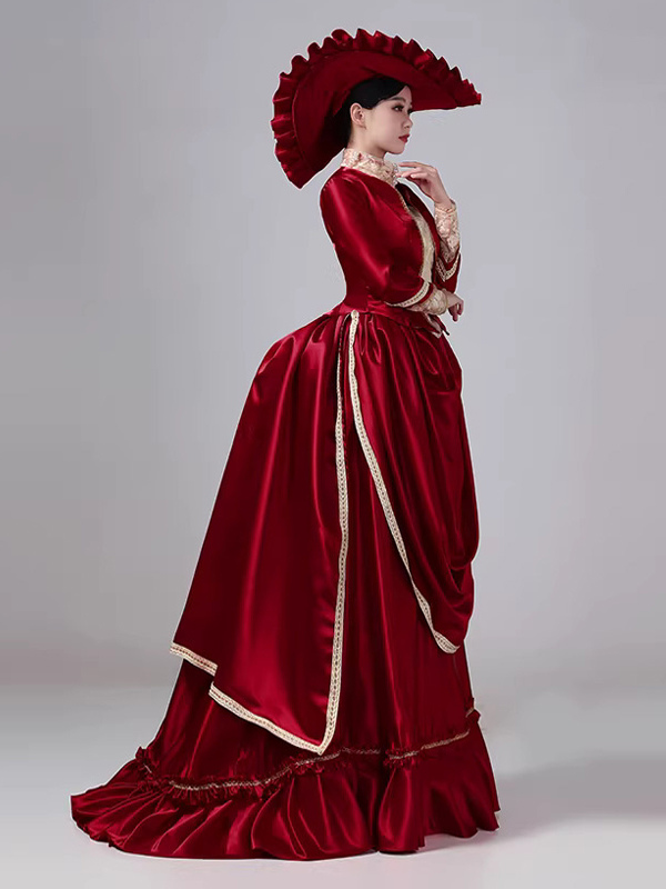 バーガンディ色のバスルビクトリアンドレス、長袖マキシ丈ポリエステルマキシ丈レトロドレス、帽子付き
