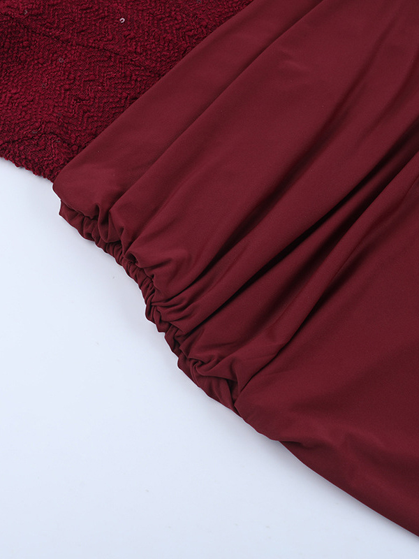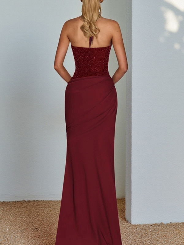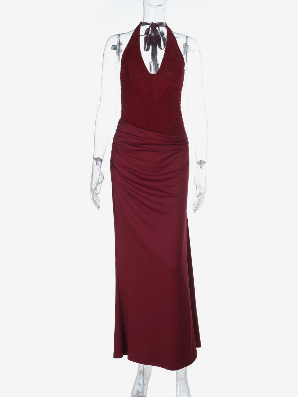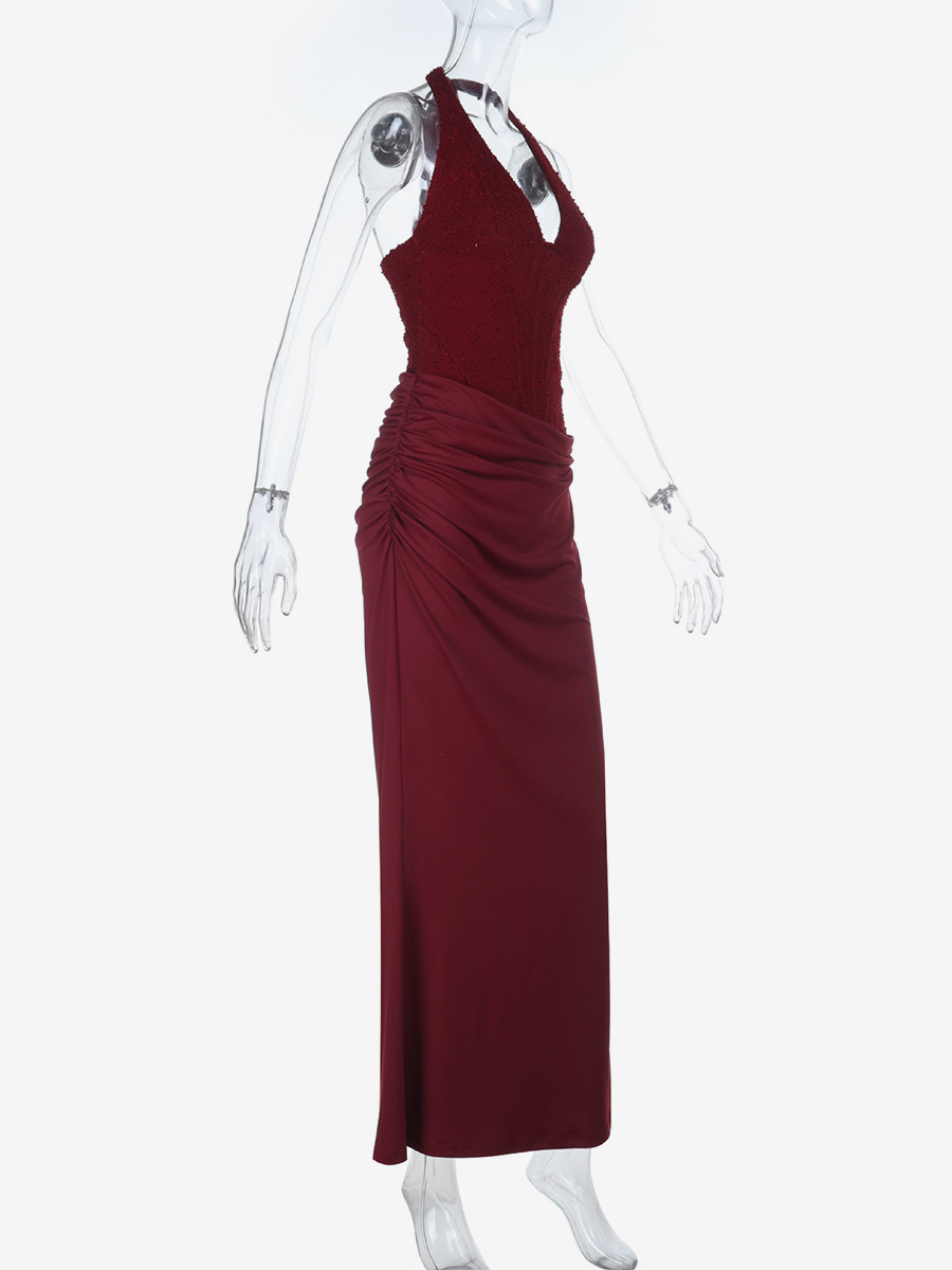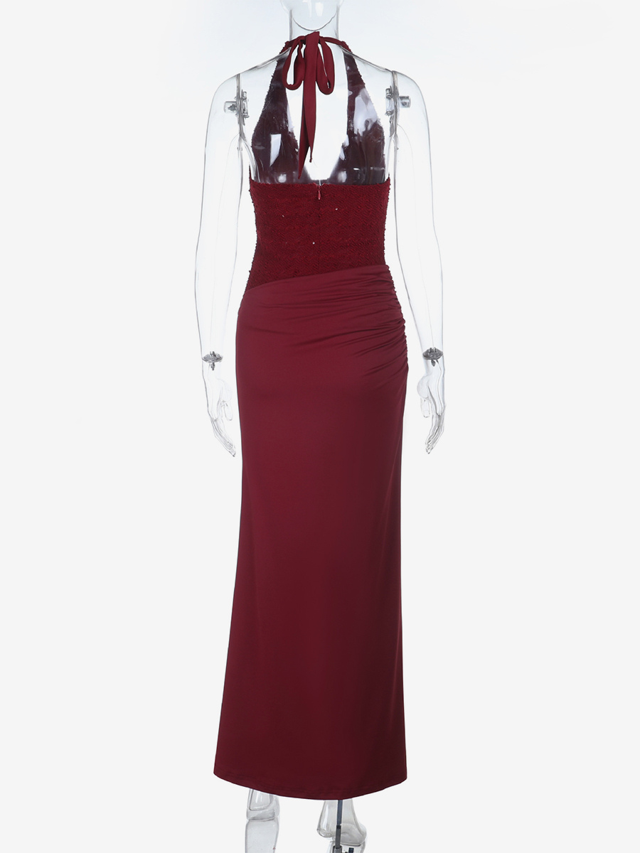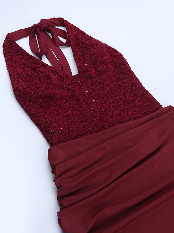バーガンディ スパンコール レディース ホルターネック マキシドレス - エレガントなギャザー入りボディコン バックレス マーメイドガウン - プロム パーティー衣装 2026