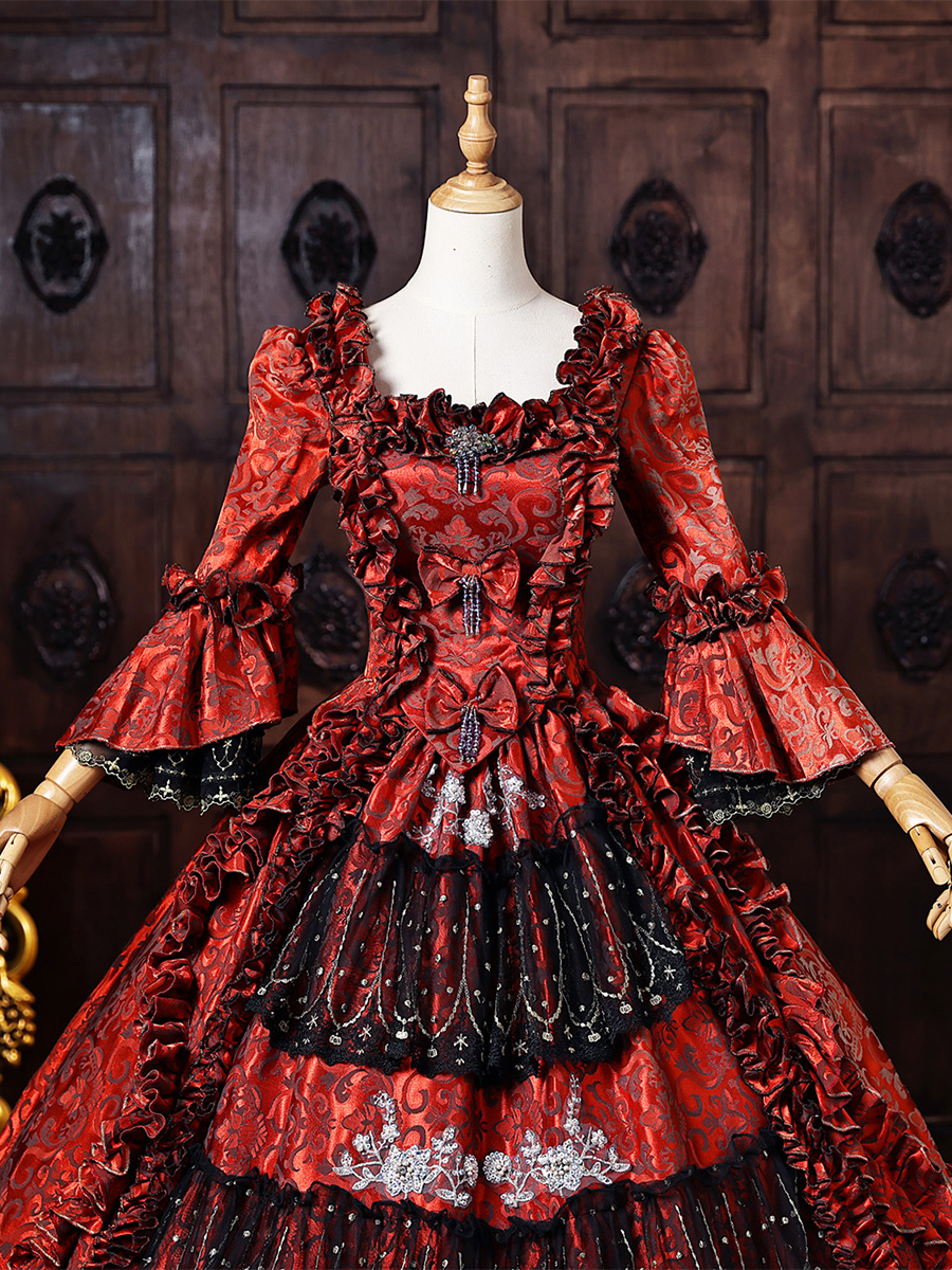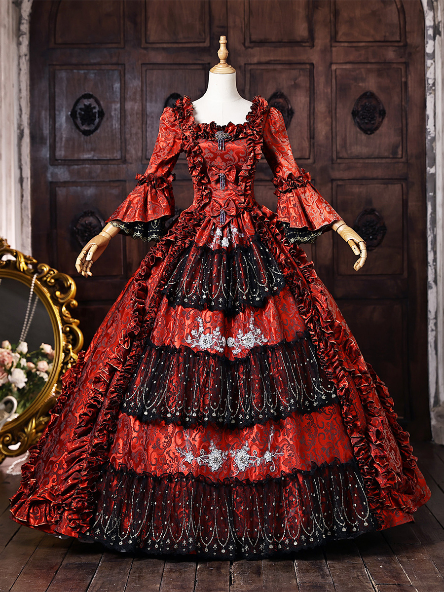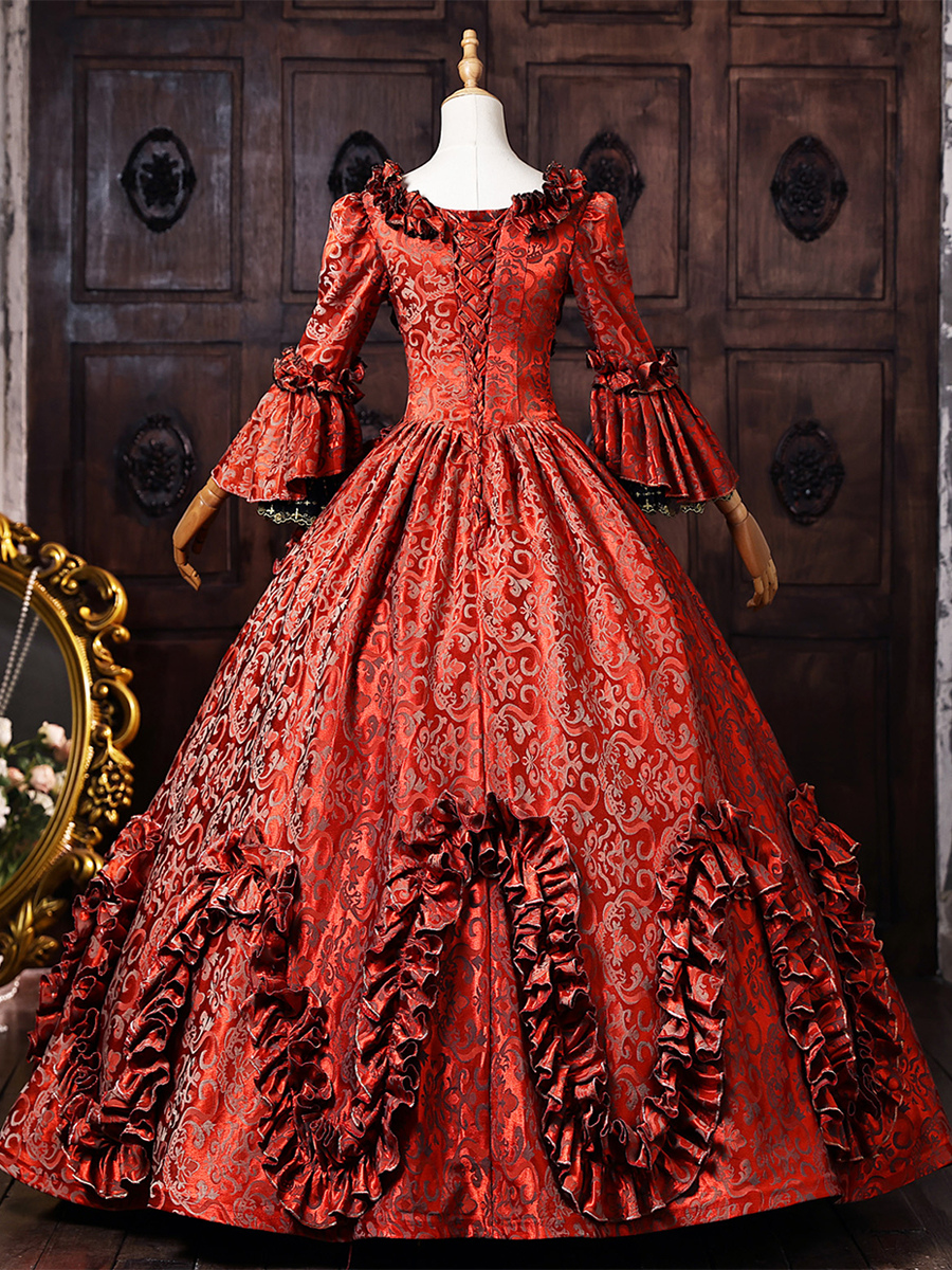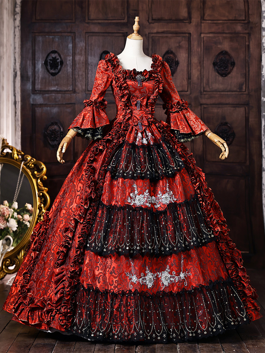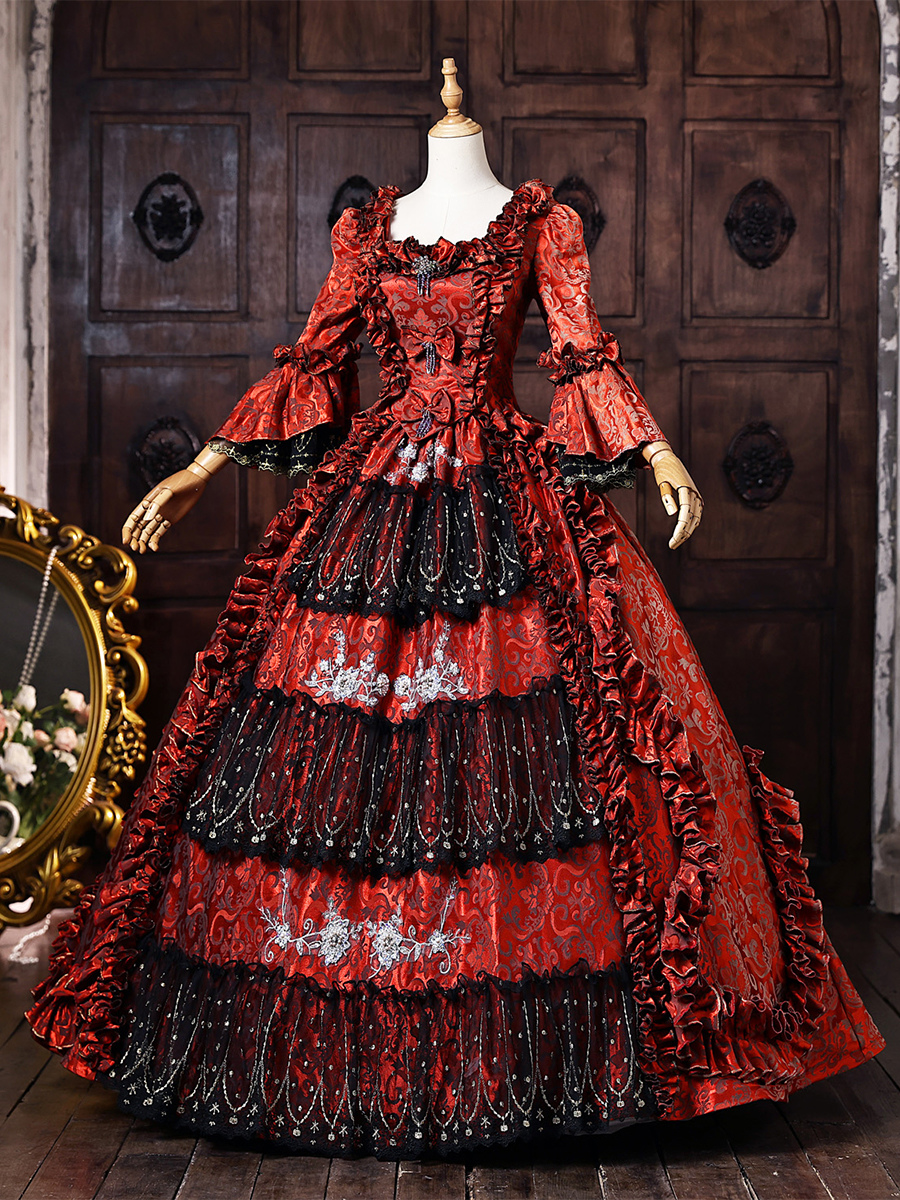 バーガンディ色のヴィクトリアン・ロココ調ドレス、フレア袖、刺繍入りボールガウン、歴史的なドレス
