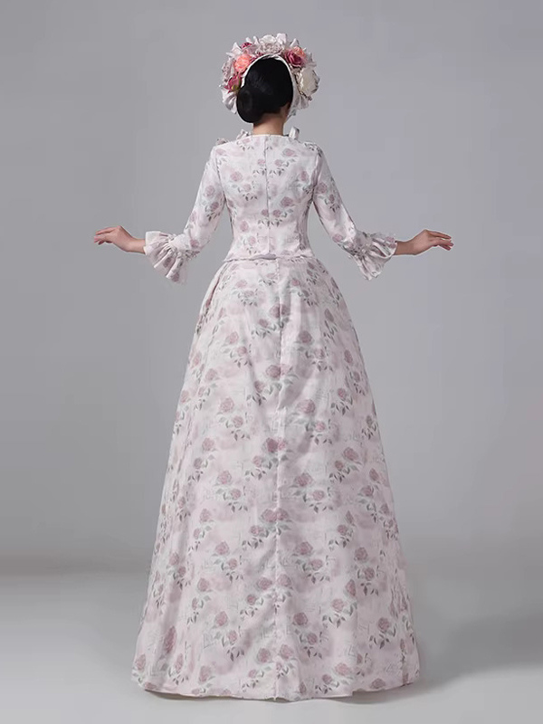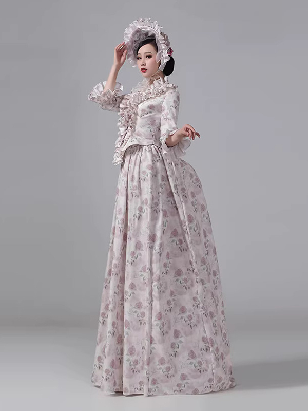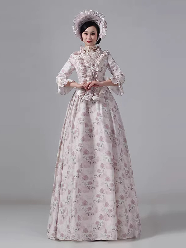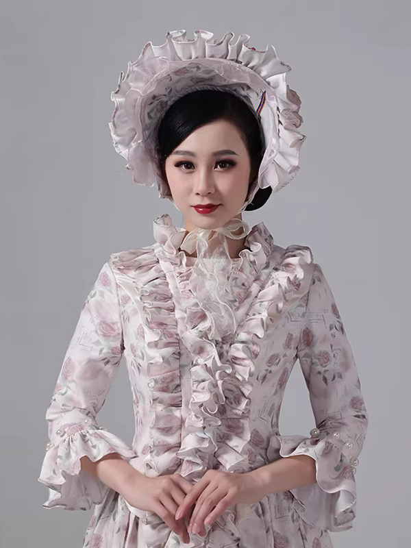 バッスルビクトリアドレス 花柄 田舎風 エレガント 長袖 舞踏会 マキシ丈 レトロドレス 帽子付き