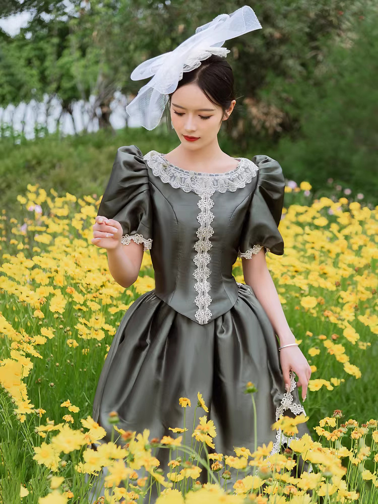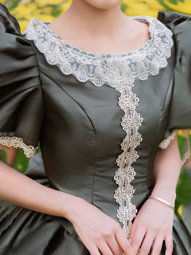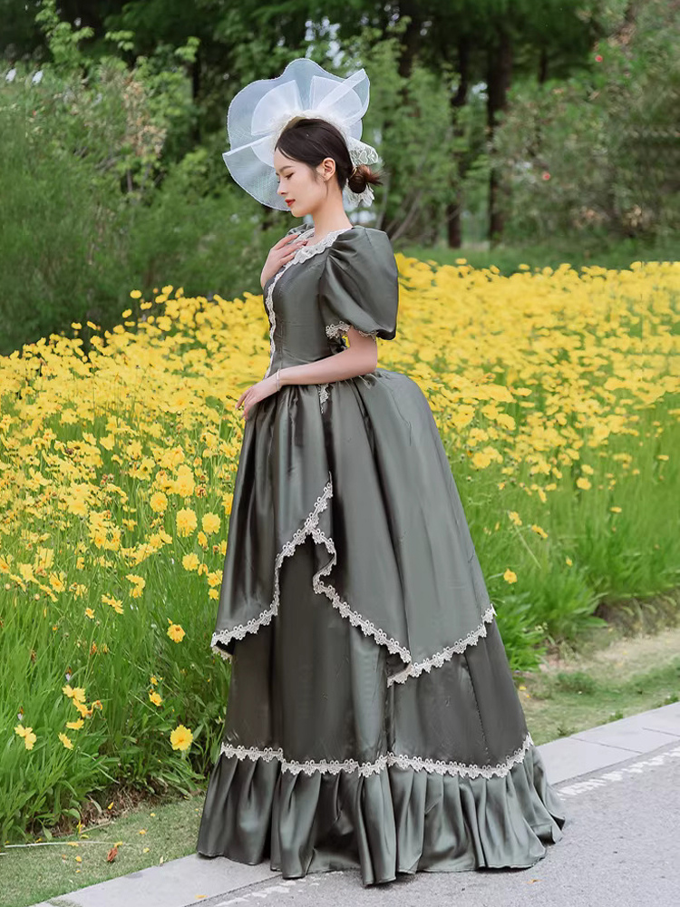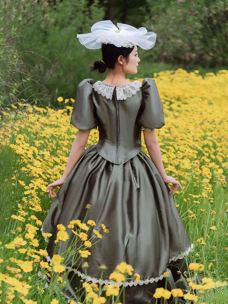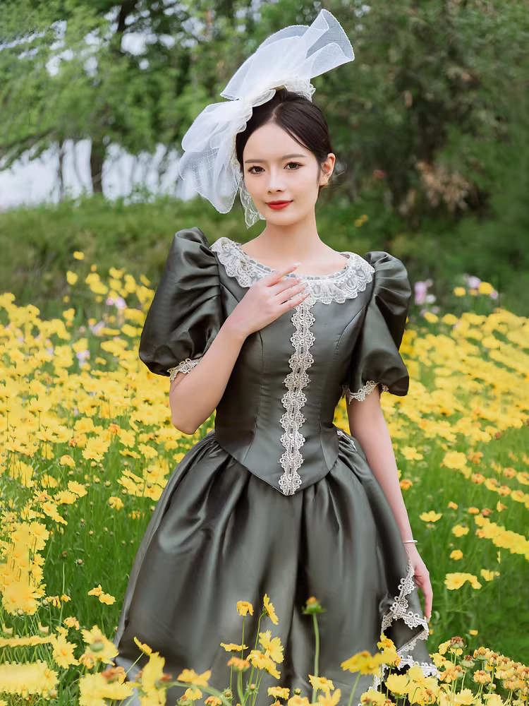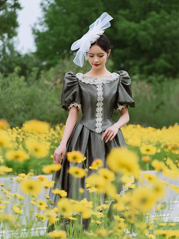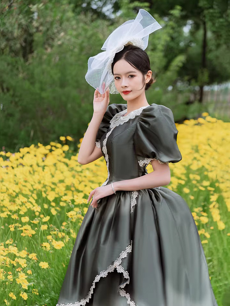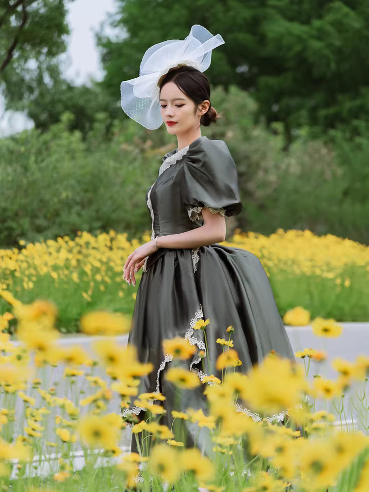 バッスル ビクトリアンドレス パフスリーブ レース フリル マキシ丈 レトロドレス 帽子付き