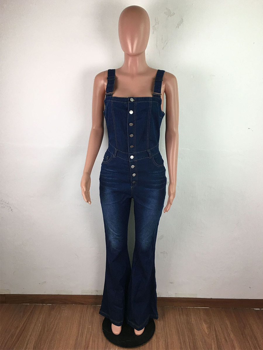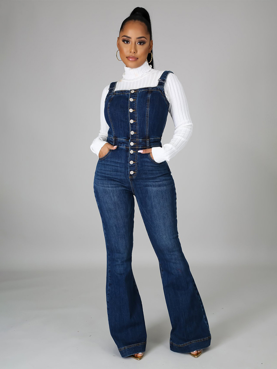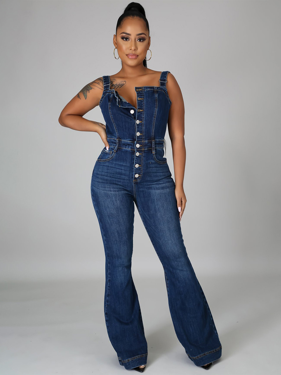 ボタンアップ ウォッシュドデニム ジャンプスーツ レディース - ダークブルー レトロ ボディコン フレアレッグ オーバーオール - サマーシック ストリートウェア 2026