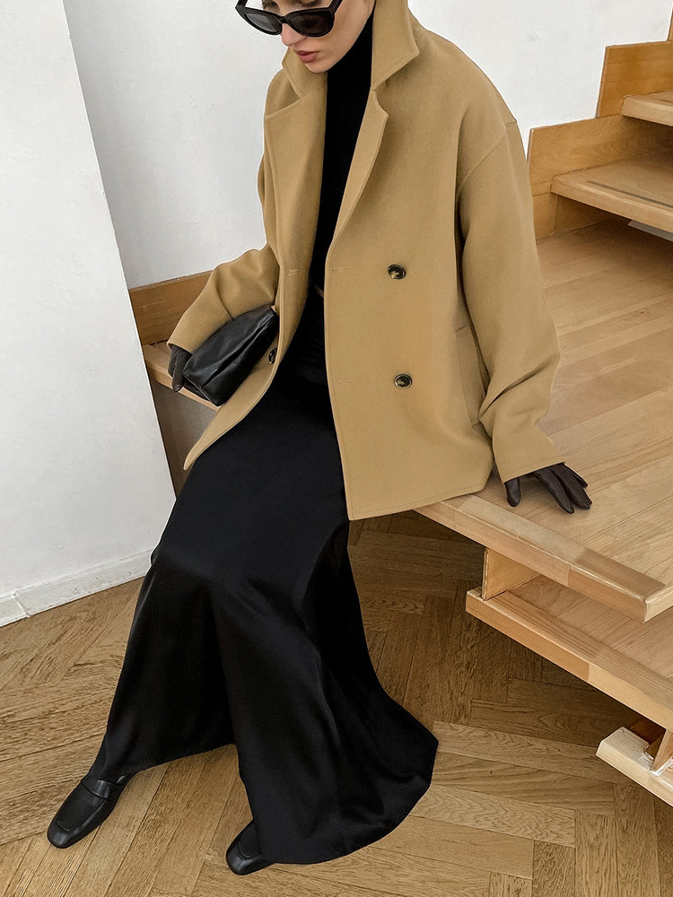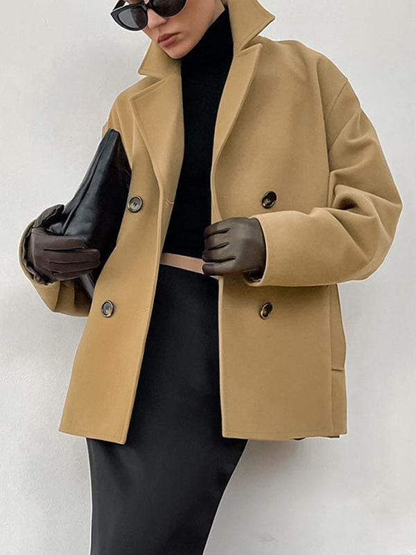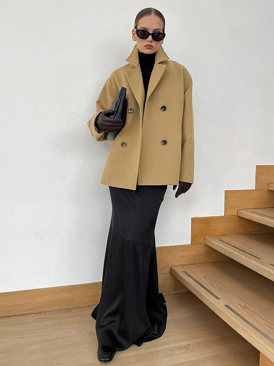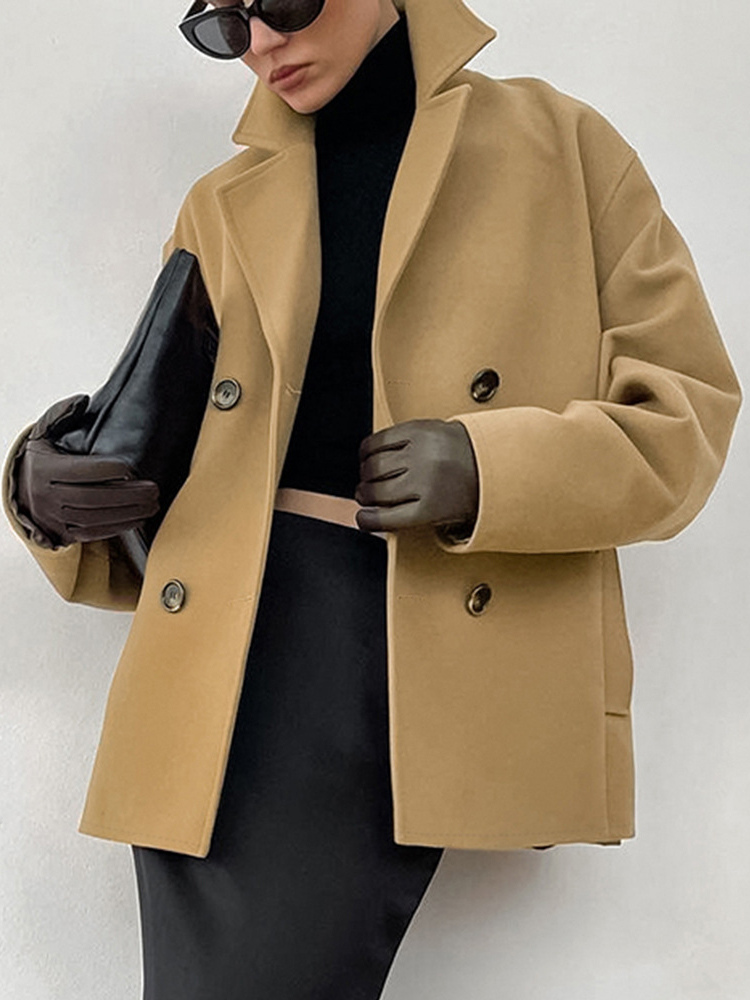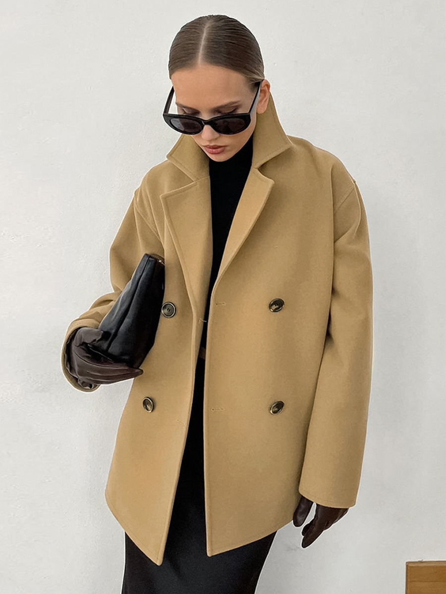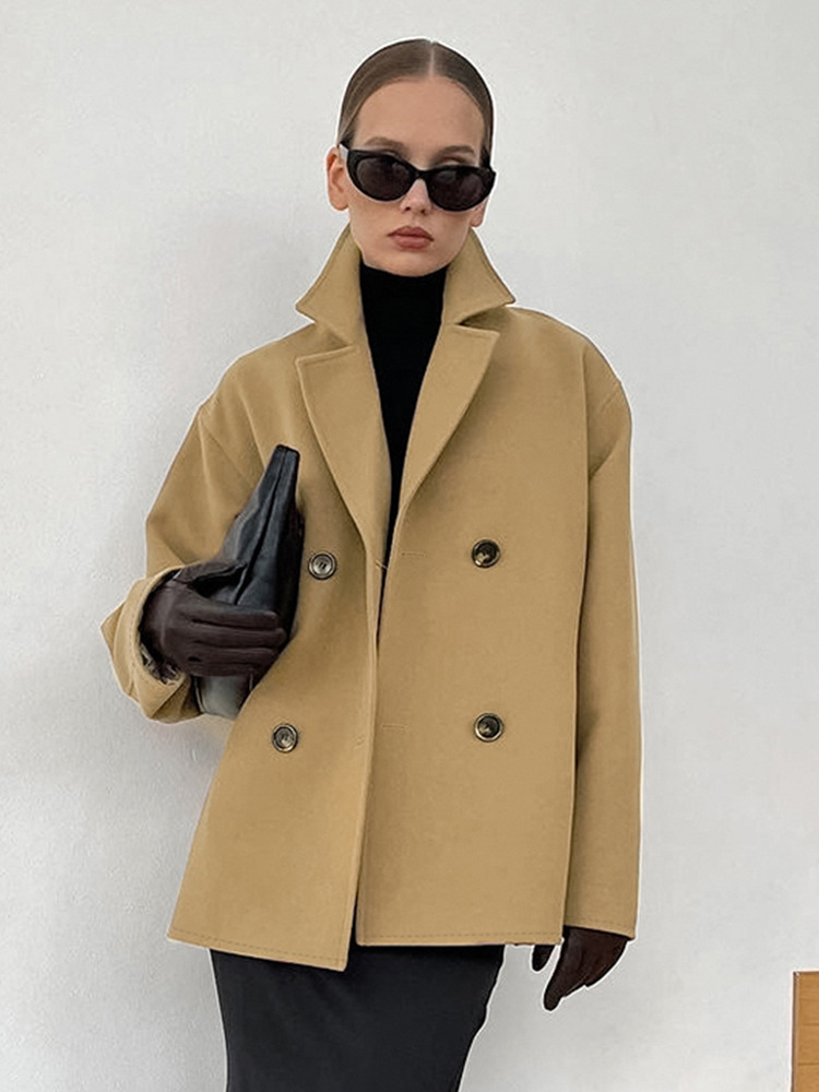 キャメルダブルブレストレディースピーコート - ミニマルなノッチドラペル、ボックスシルエット - 2026年春のさりげないラグジュアリーストリートウェア