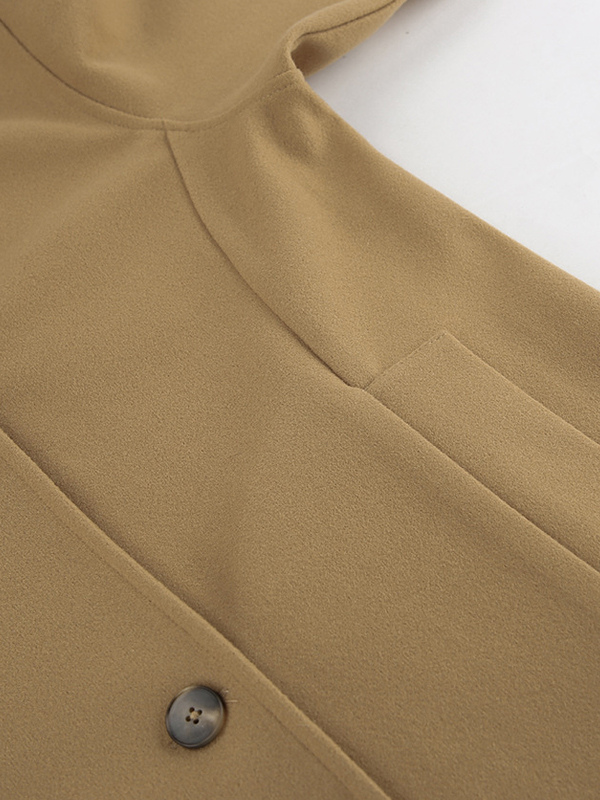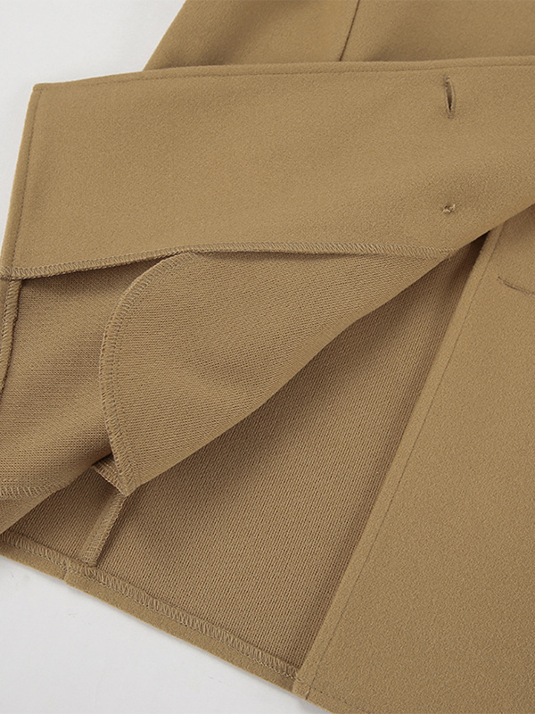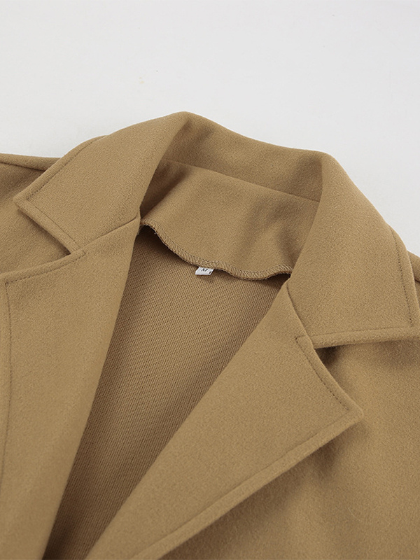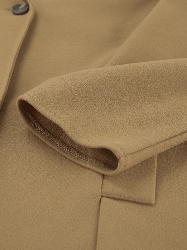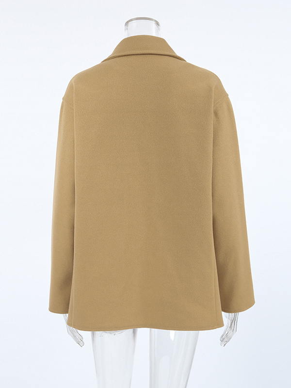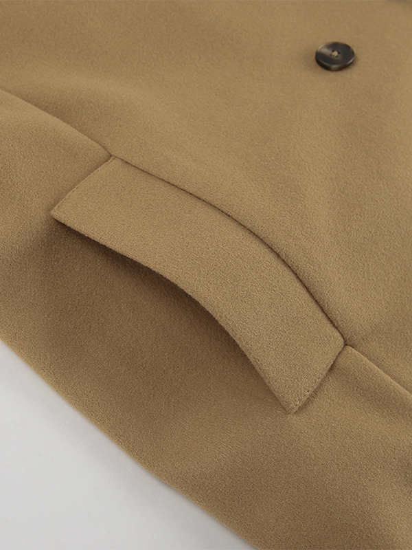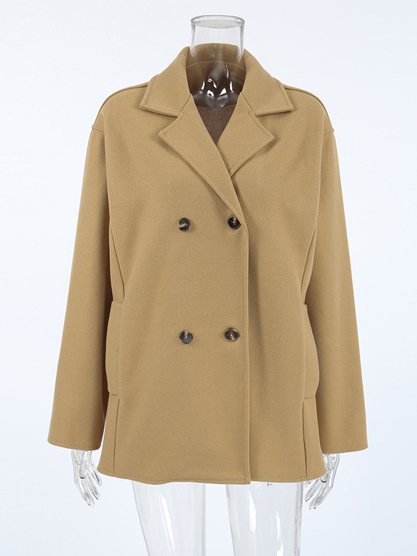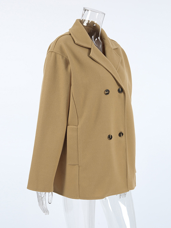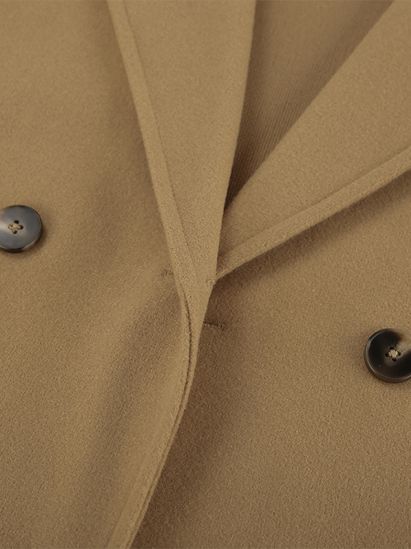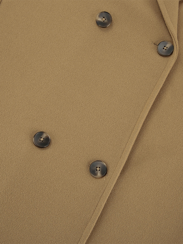 キャメルダブルブレストレディースピーコート - ミニマルなノッチドラペル、ボックスシルエット - 2026年春のさりげないラグジュアリーストリートウェア