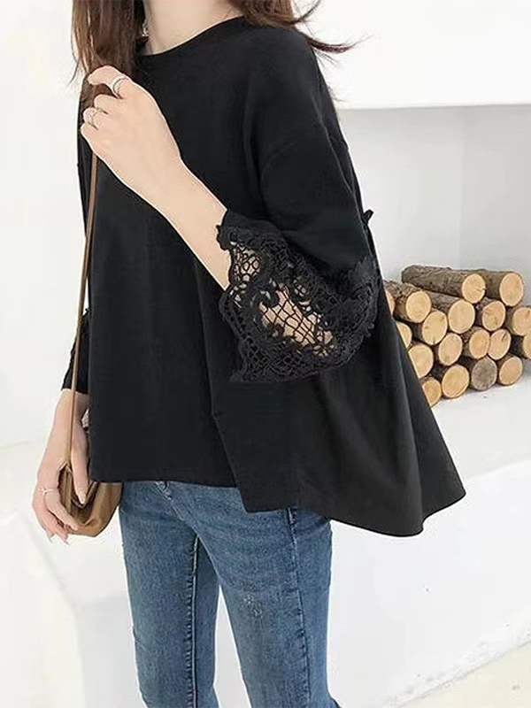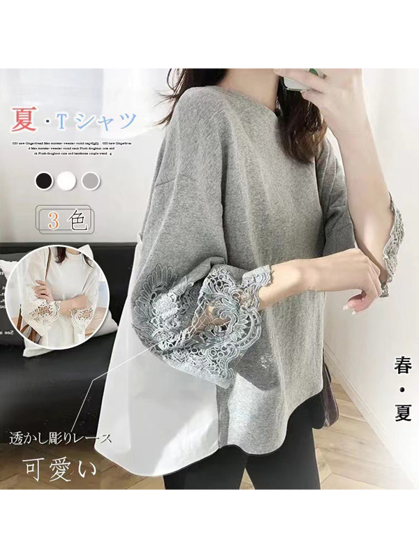 カジュアル ジュエルネック ブラック 7分袖 カラーブロック レーストップ Tシャツ トップス レディース ファッション
