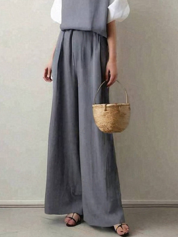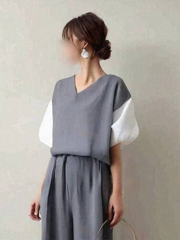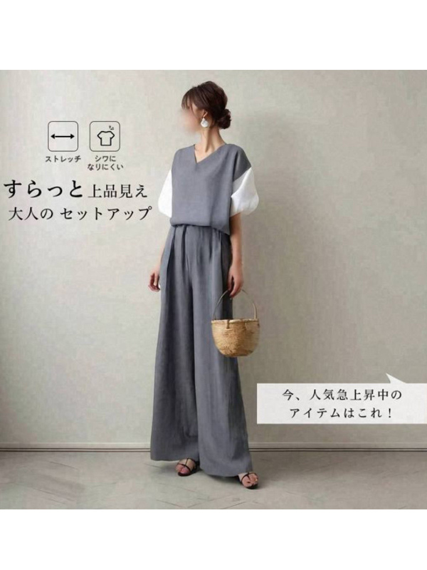 カジュアル セットアップ Vネック グレイ 五分袖 ワイドレッグ バイカラー シンプル レディースファッション