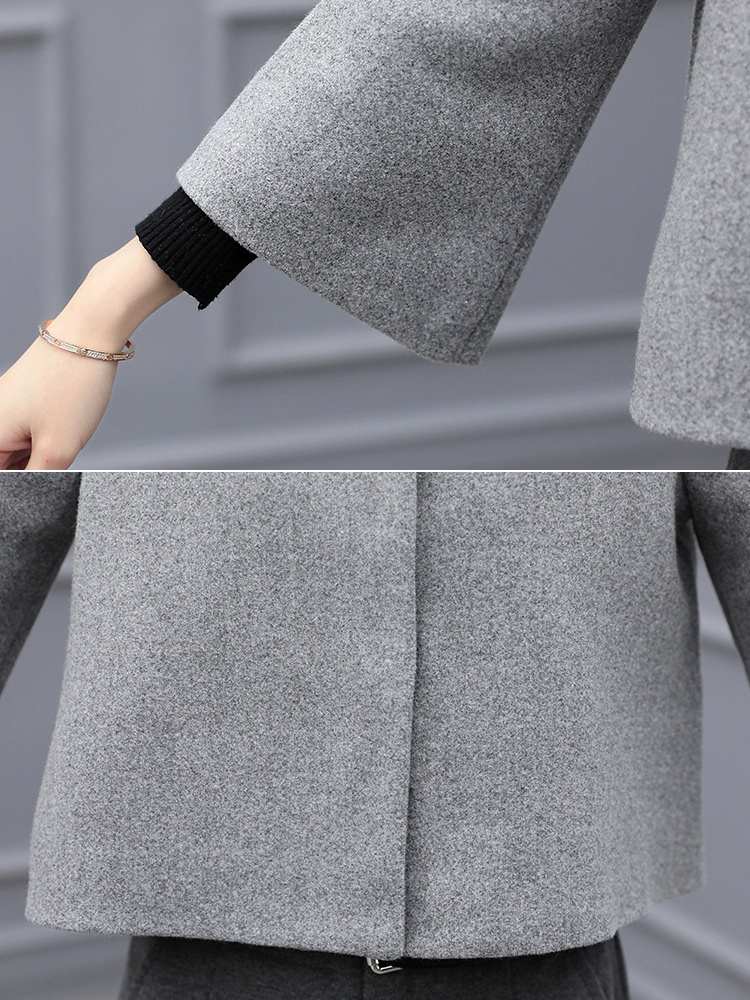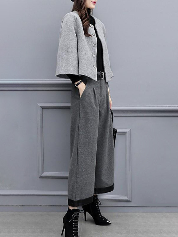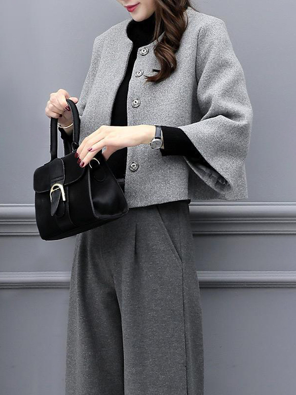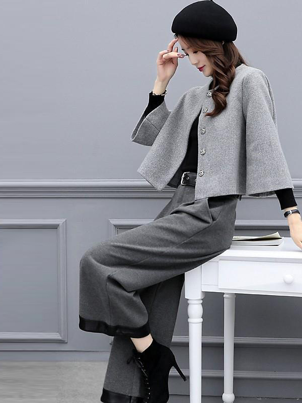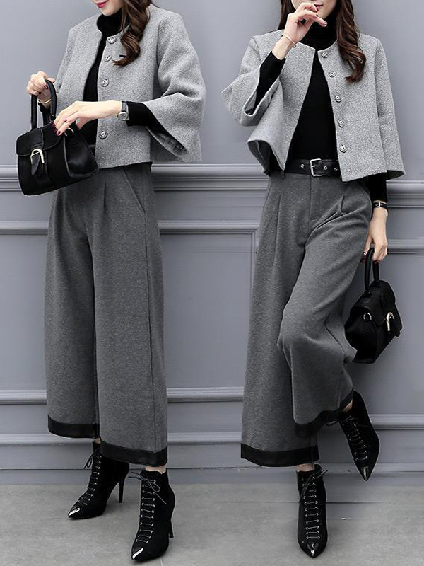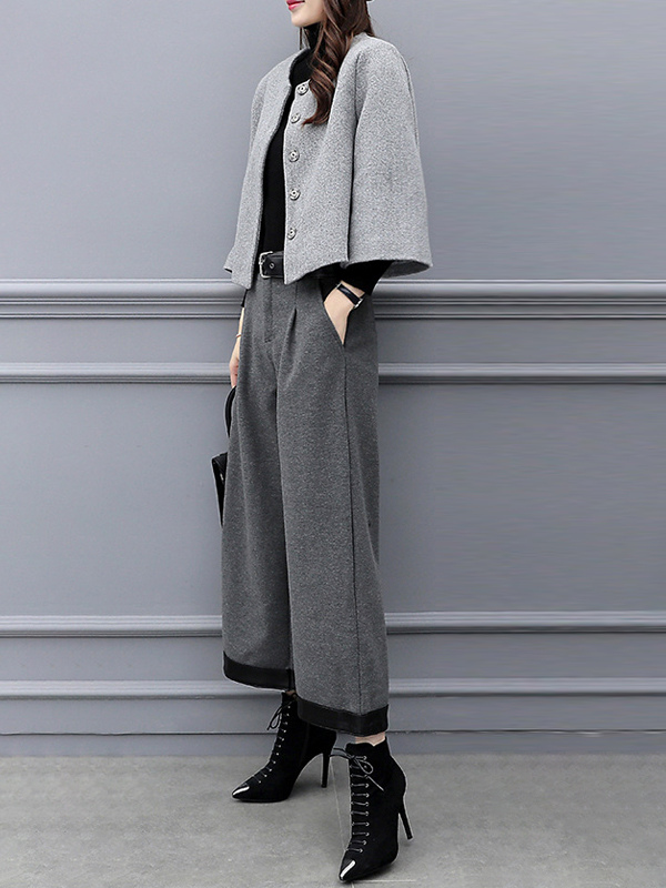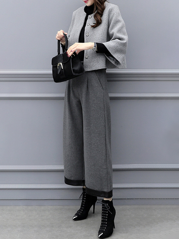 カジュアル セットアップ ラウンドネック グレイ 長袖 セット バイカラー カジュアル ボタン レディースファッション