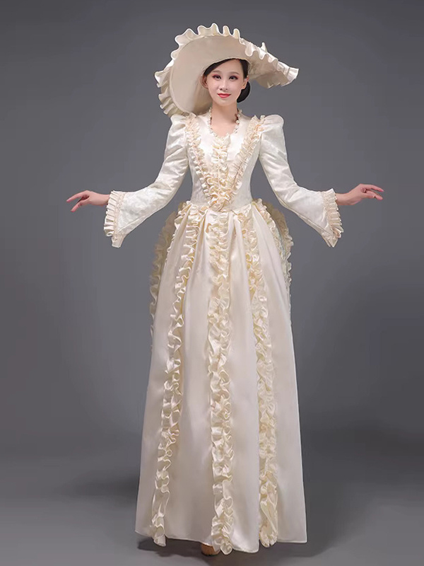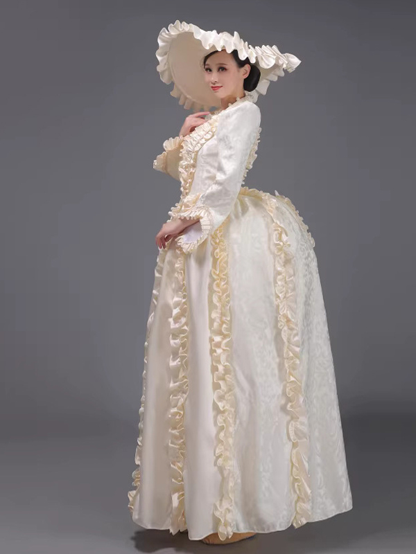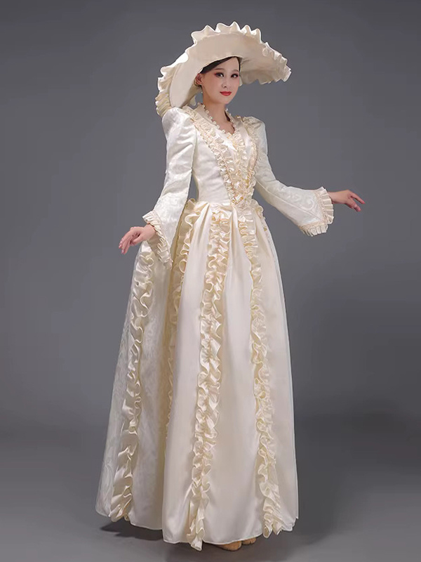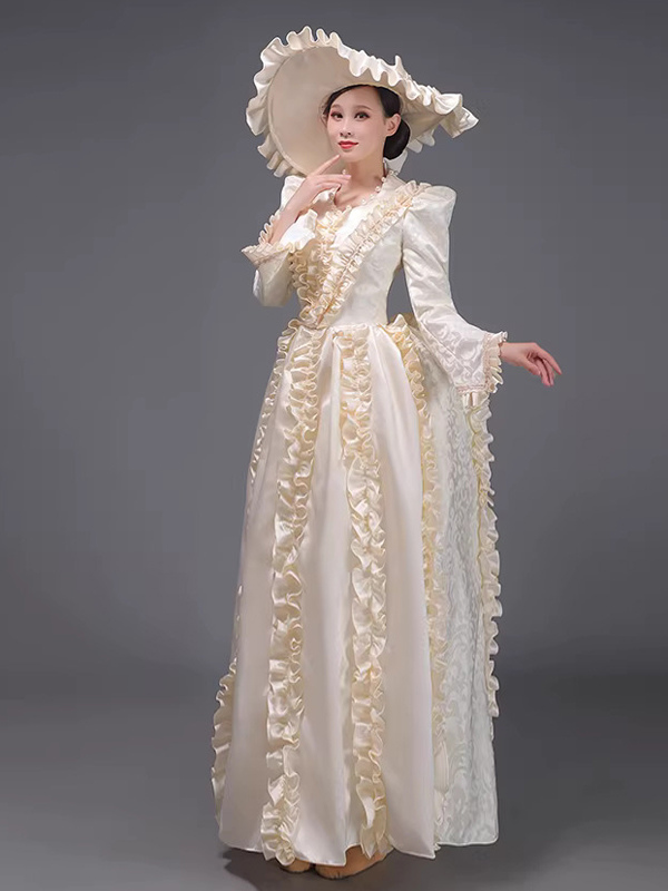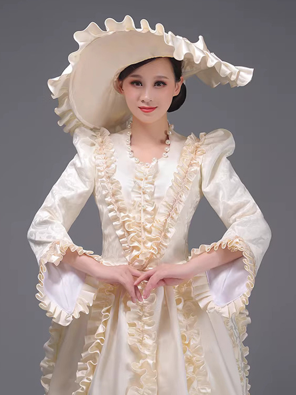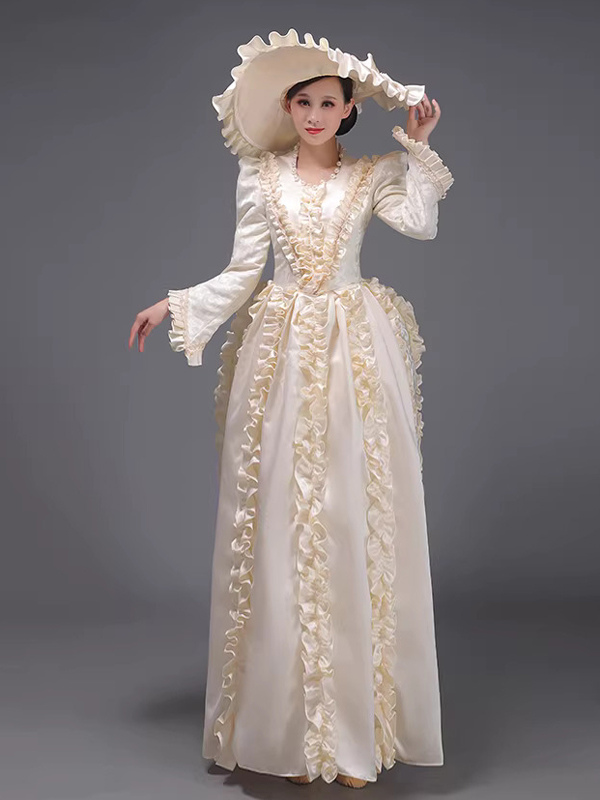 シャンパン バッスル ヴィクトリアン ドレス パッド入り ショルダー 長袖 ポリエステル エレガント ボール レトロ ドレス 帽子付き