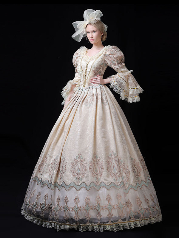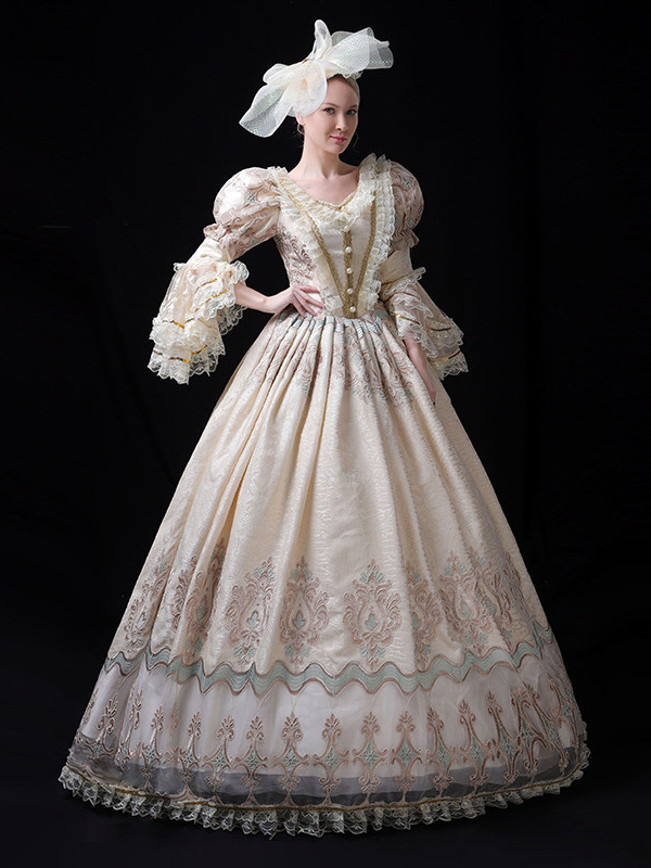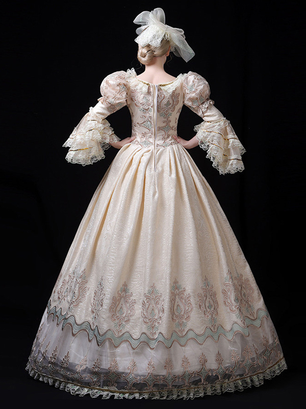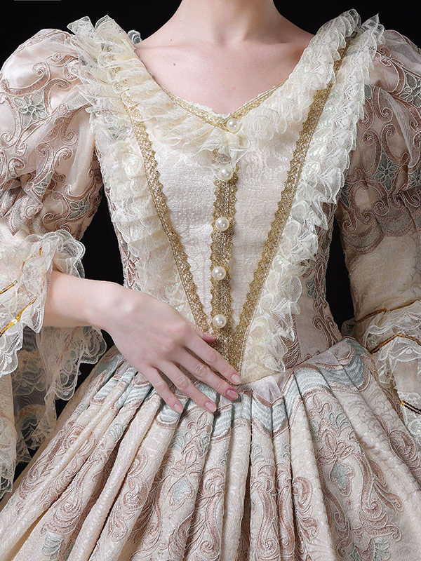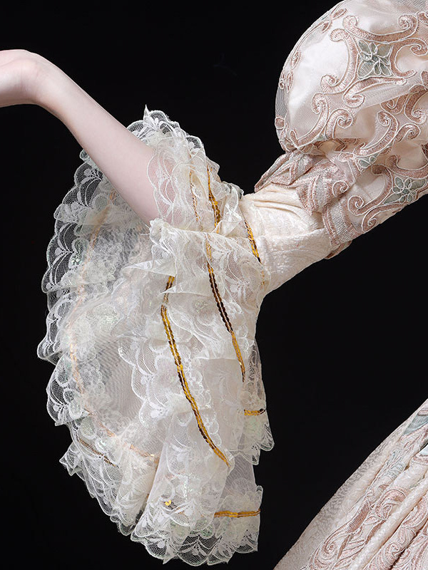 シャンパンカラーのヴィクトリアンロココ調ドレス、レーストリム、フレアスリーブ、花柄プリントのロングボールガウンドレス