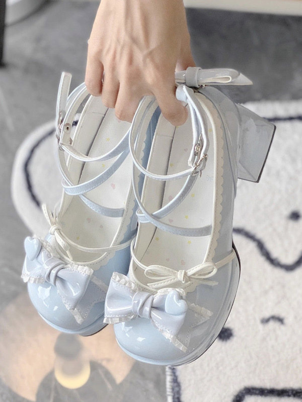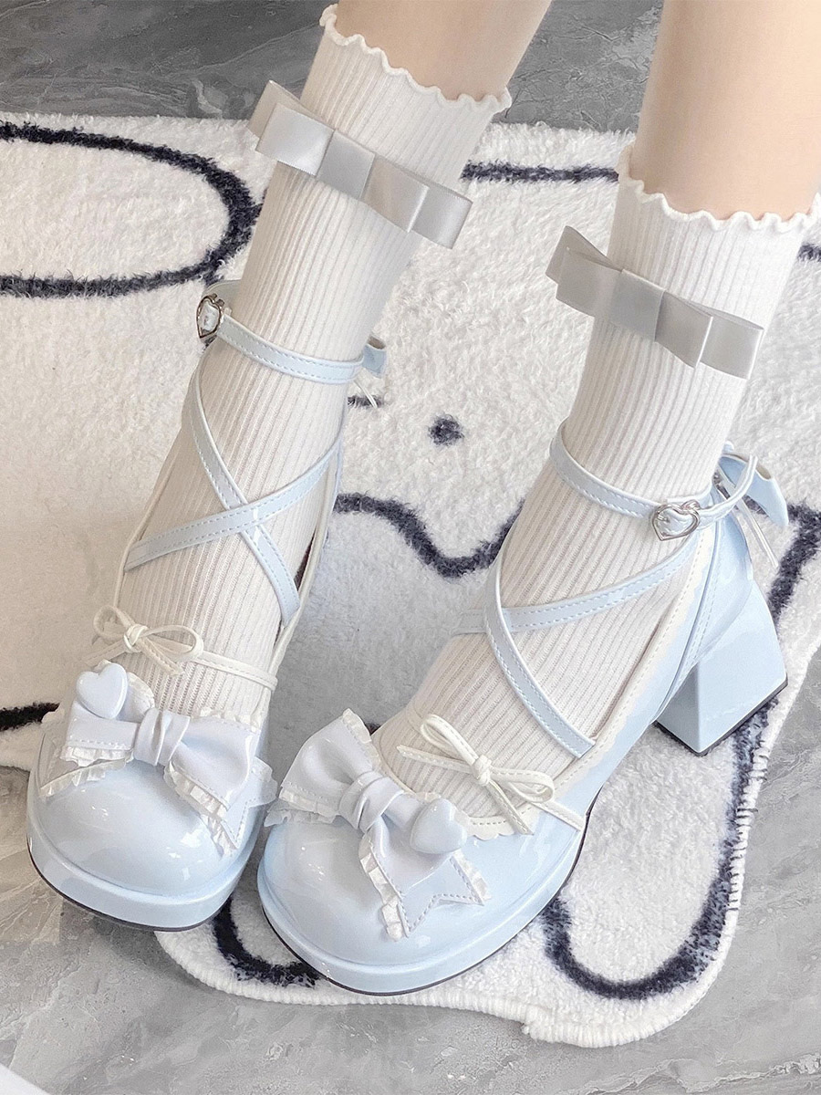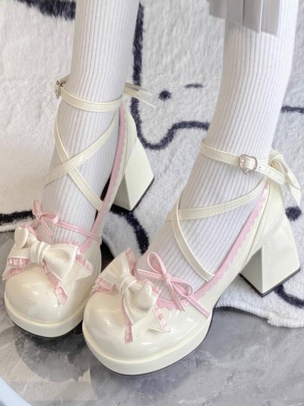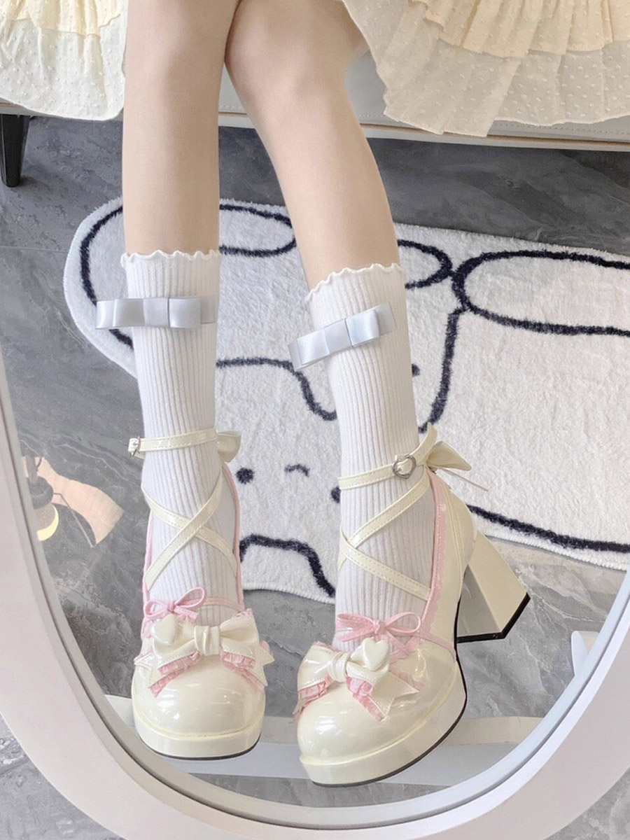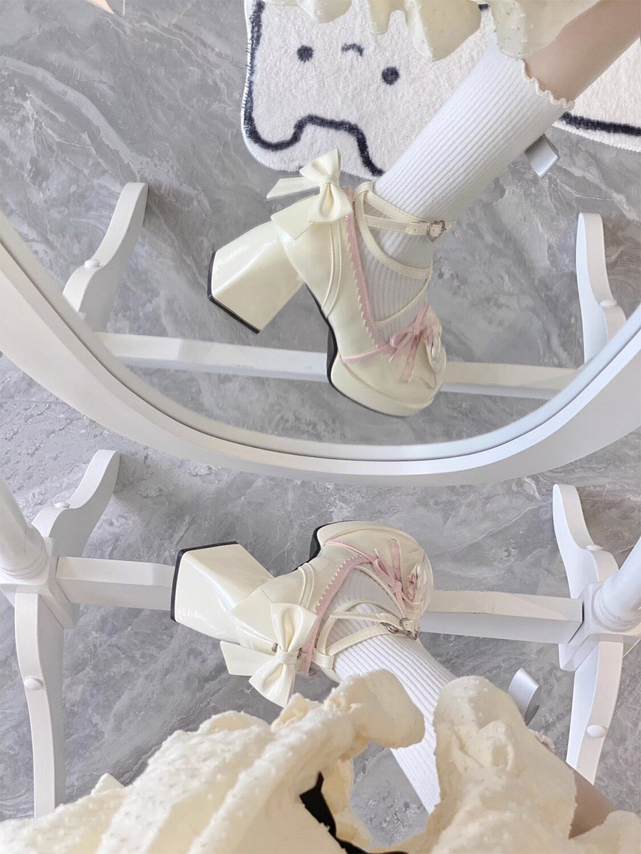 クラシックロリータシューズ エクリュ ホワイト リボン PUレザー フラットロリータパンプス