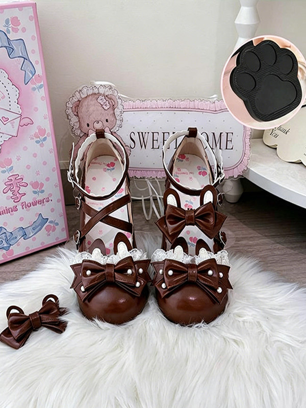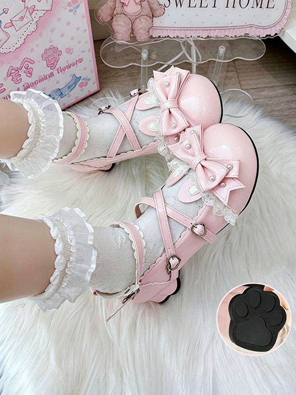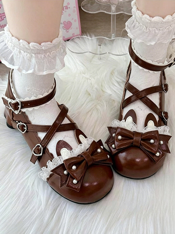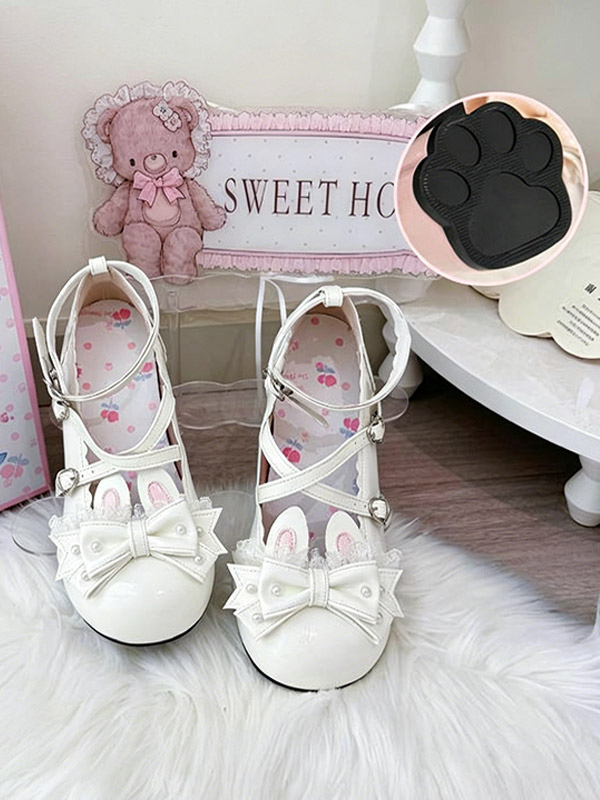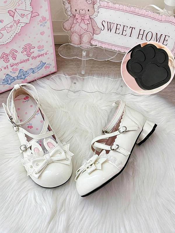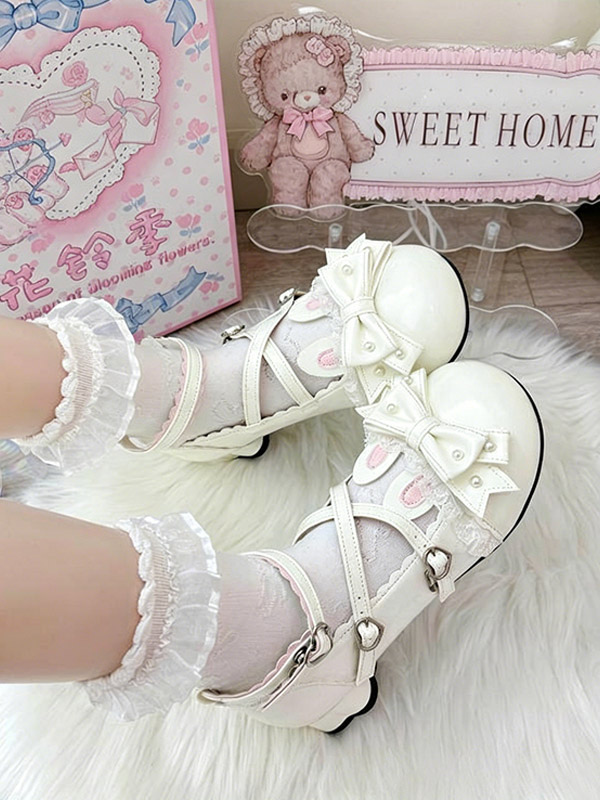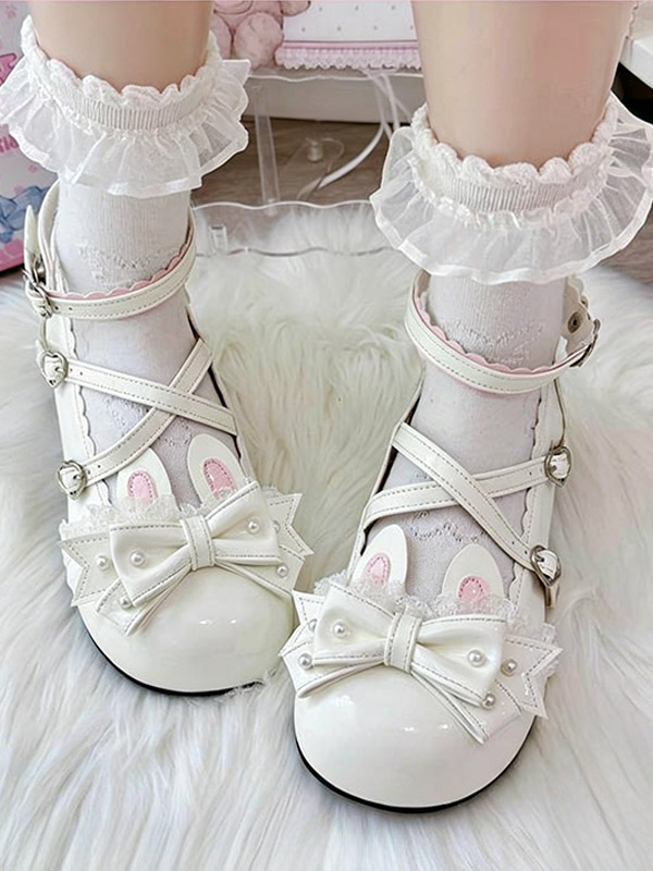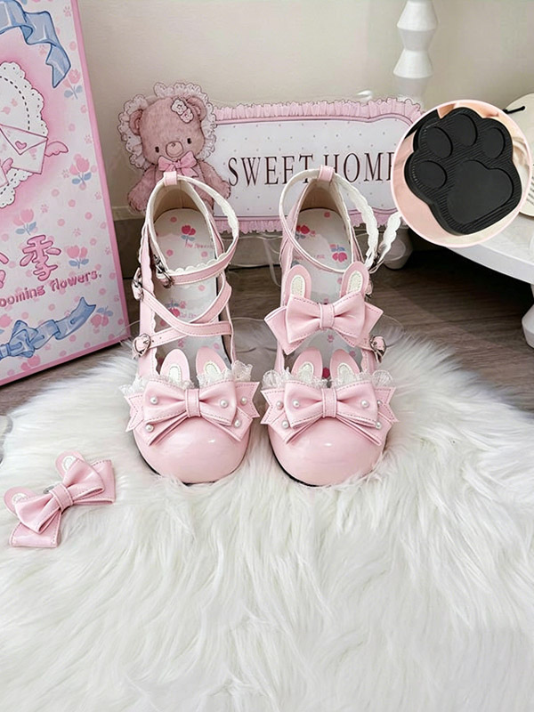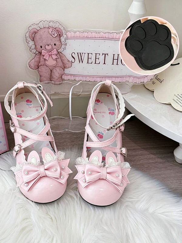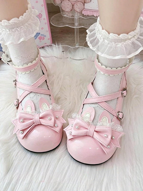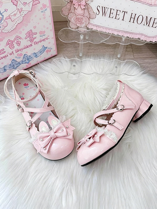 クラシックロリータシューズ ピンクのリボン バニーラビット PUレザー スウィートチャンキーヒール ロリータシューズ