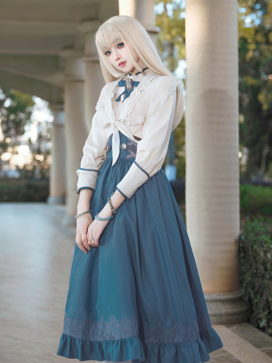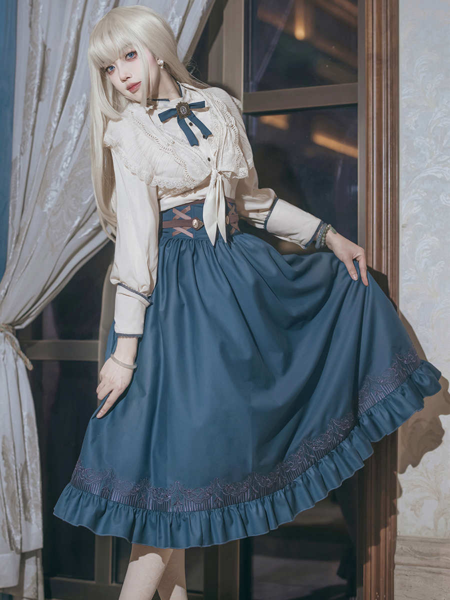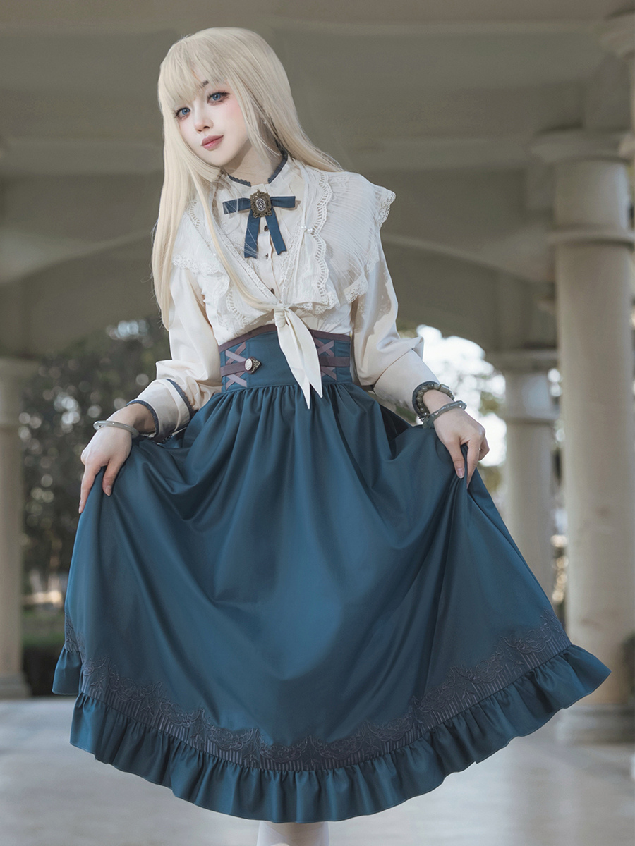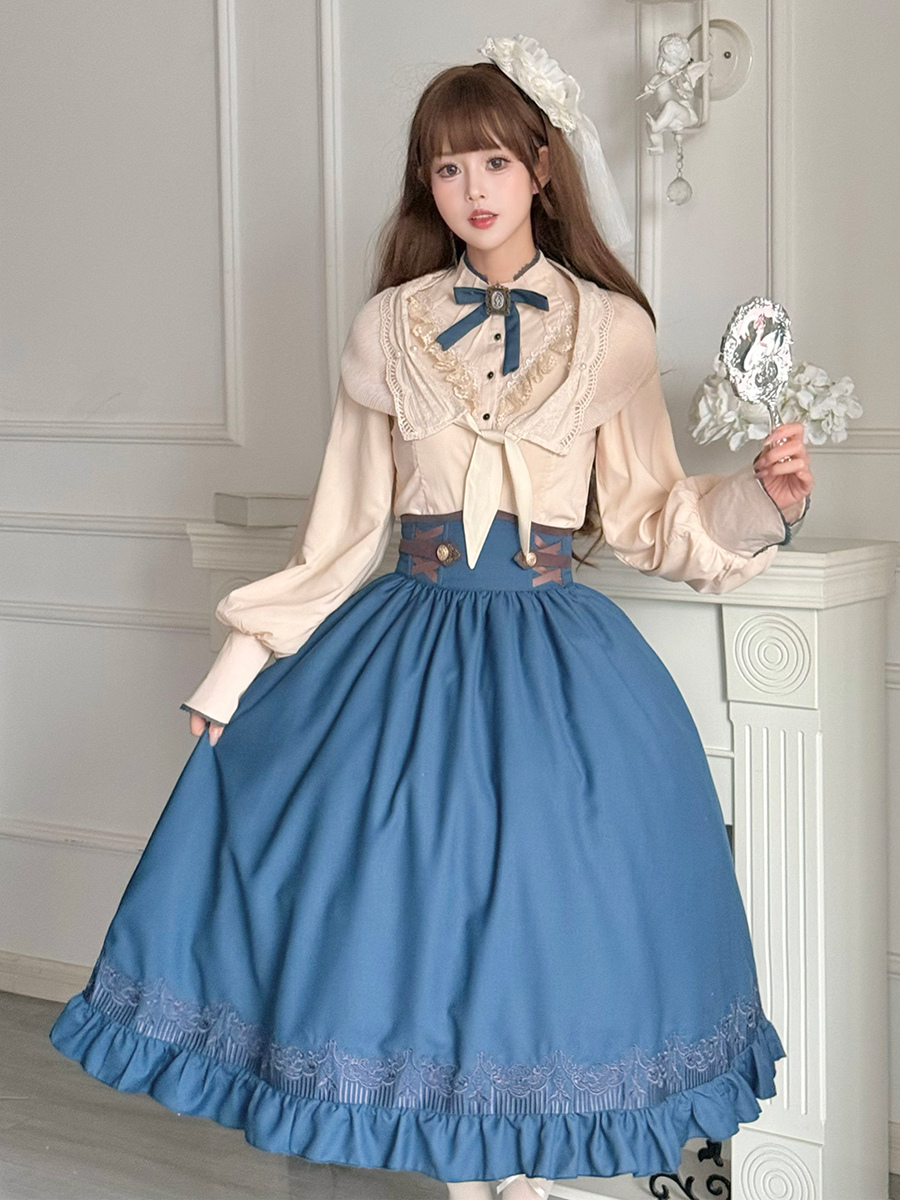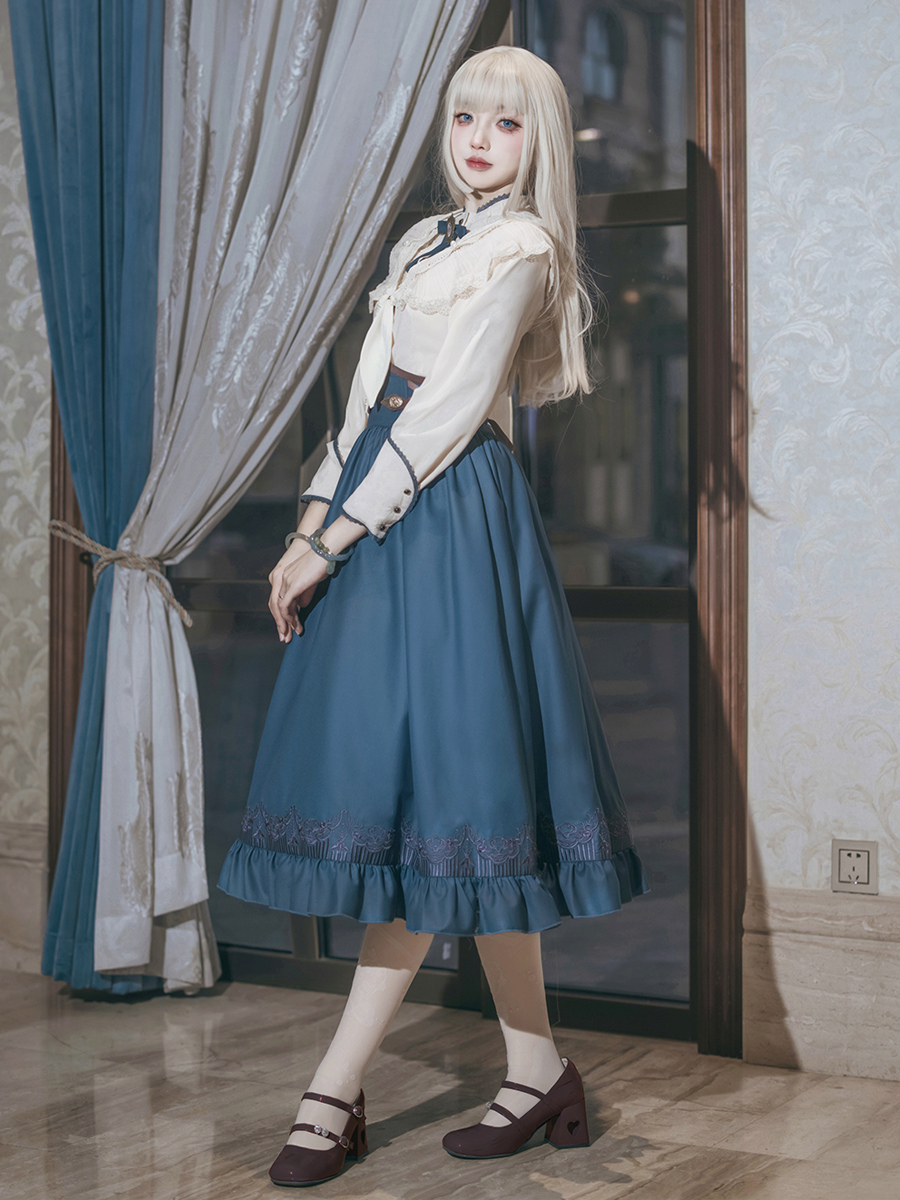 This Classical Lolita three-piece set includes a white lace blouse, a blue pleated skirt, and a delicate chiffon shawl, blending timeless elegance with soft, romantic details for a refined coordinate.