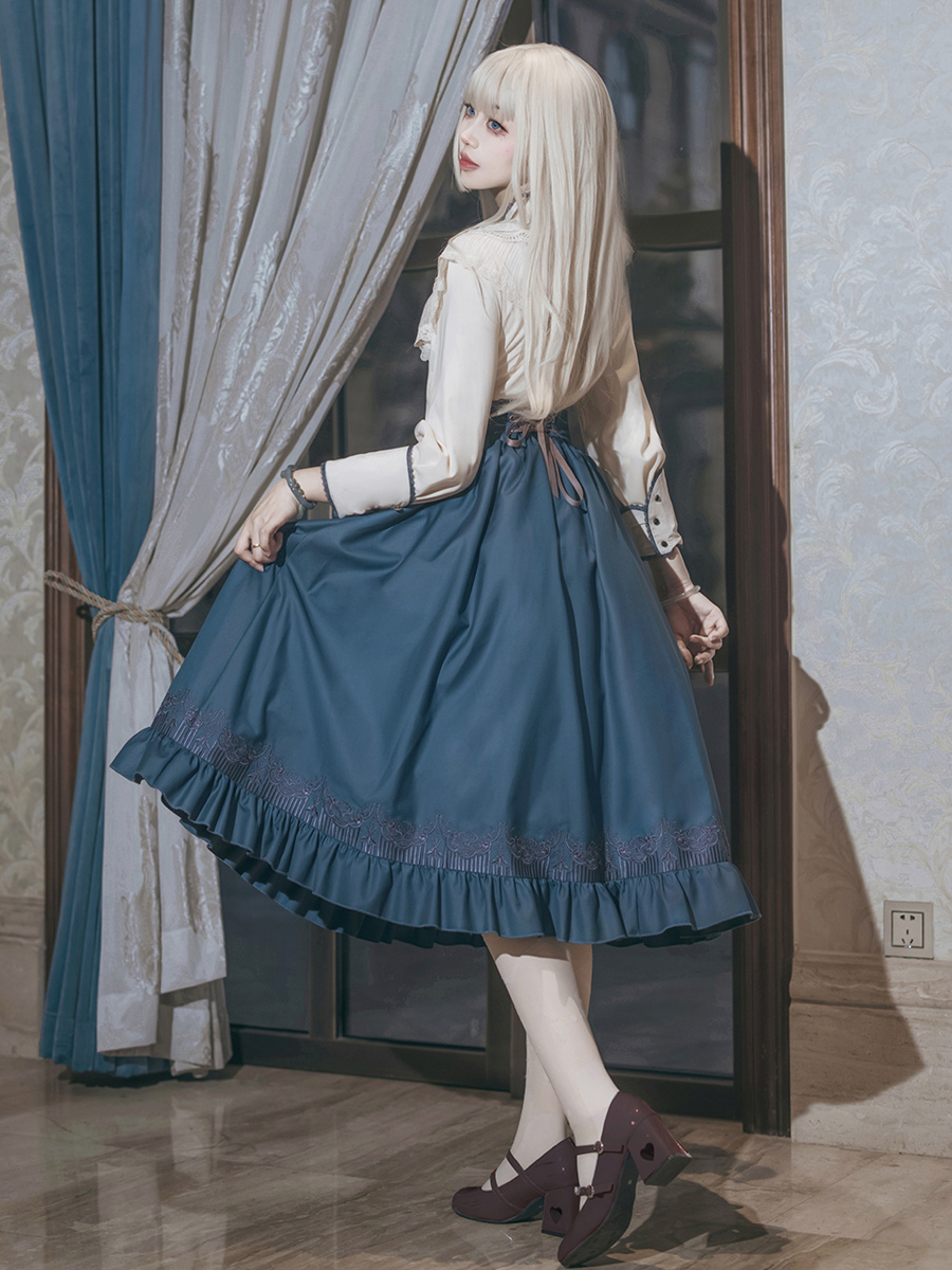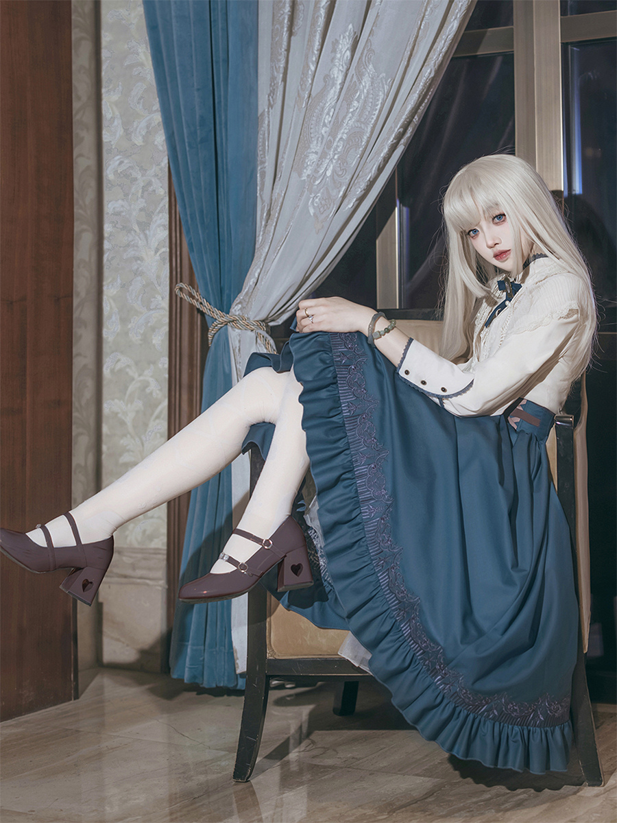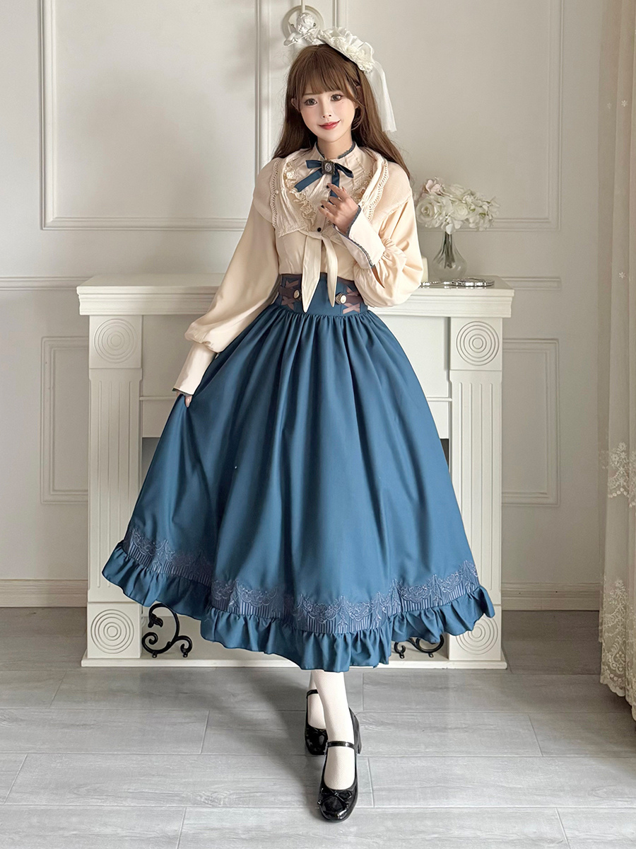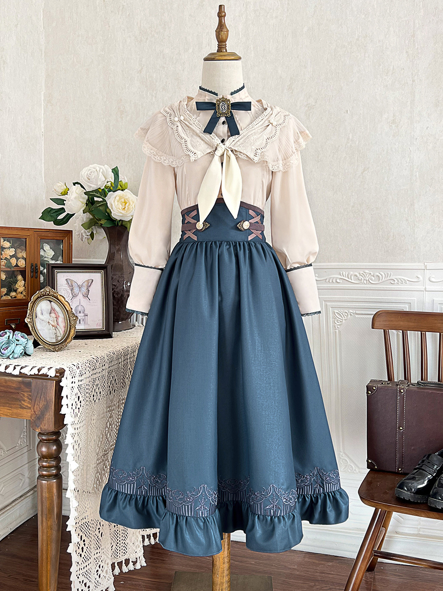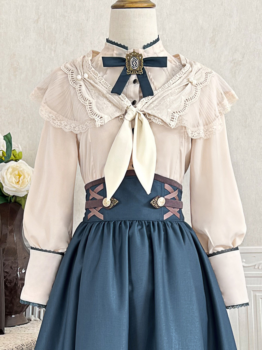 This Classical Lolita three-piece set includes a white lace blouse, a blue pleated skirt, and a delicate chiffon shawl, blending timeless elegance with soft, romantic details for a refined coordinate.