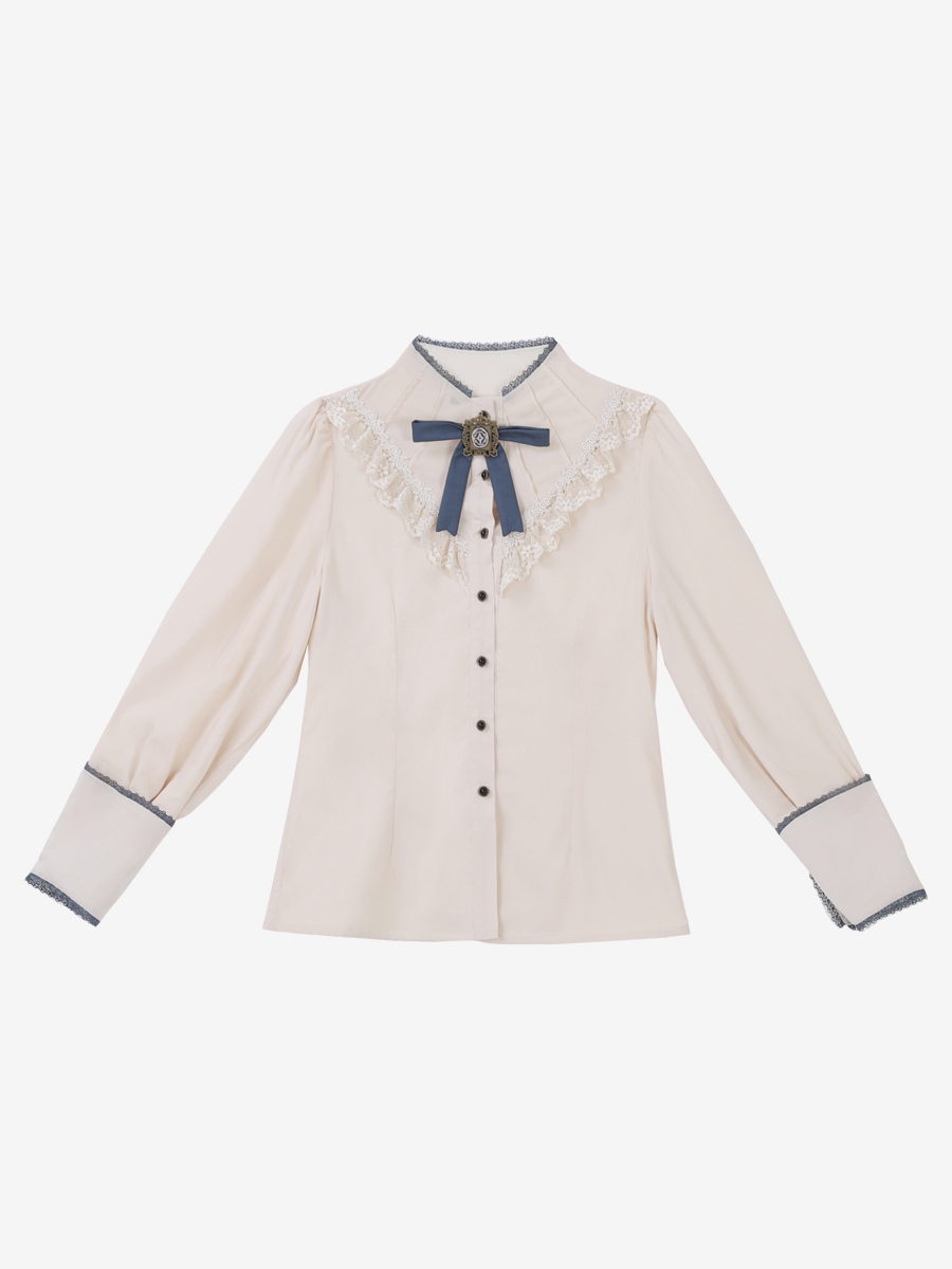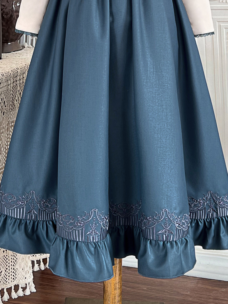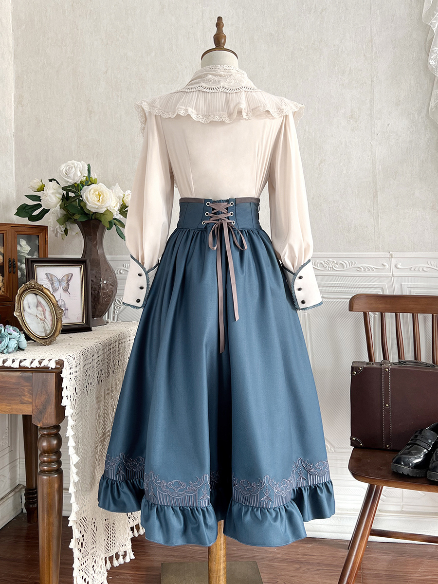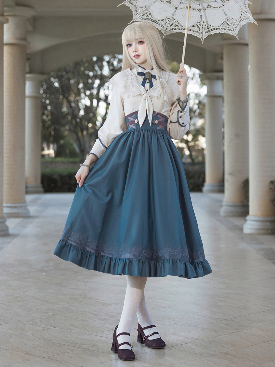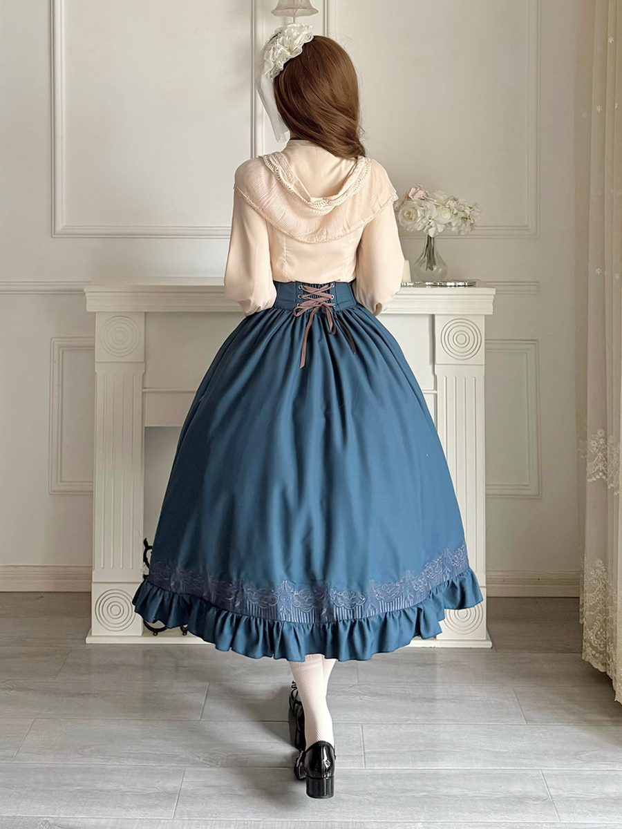 This Classical Lolita three-piece set includes a white lace blouse, a blue pleated skirt, and a delicate chiffon shawl, blending timeless elegance with soft, romantic details for a refined coordinate.