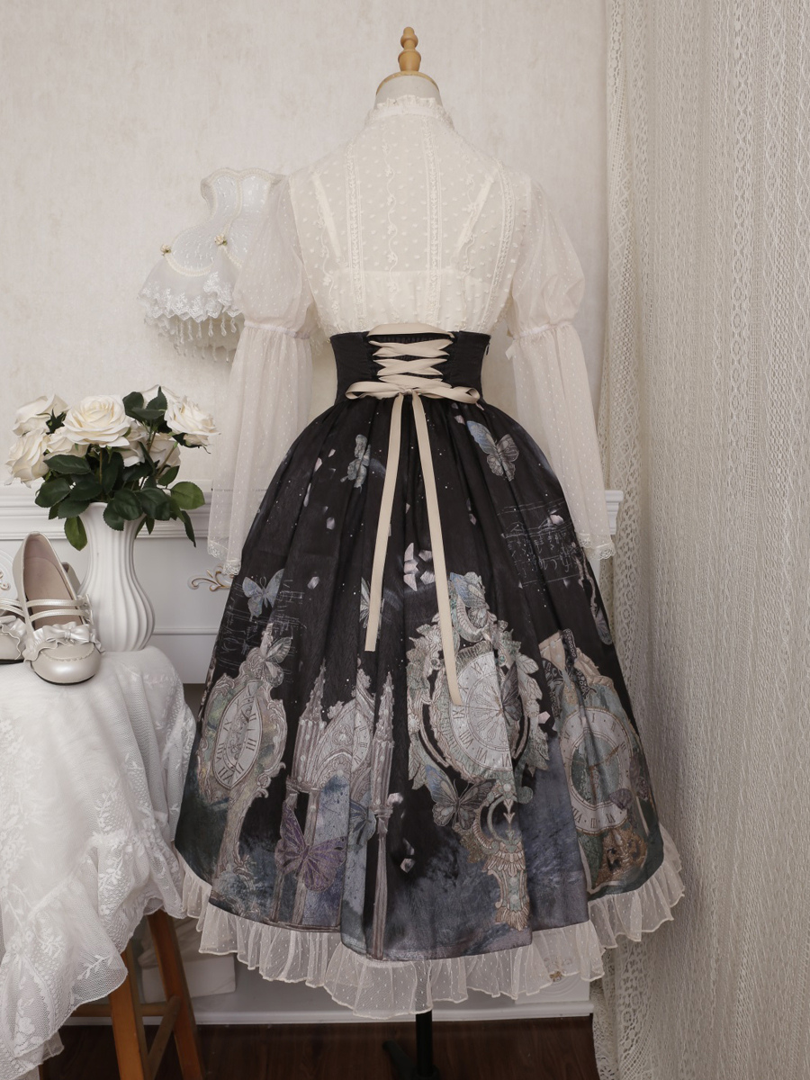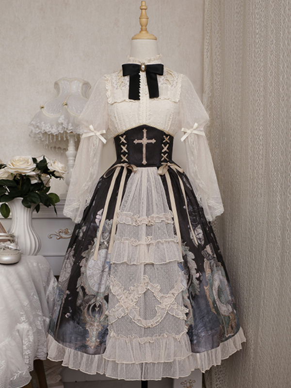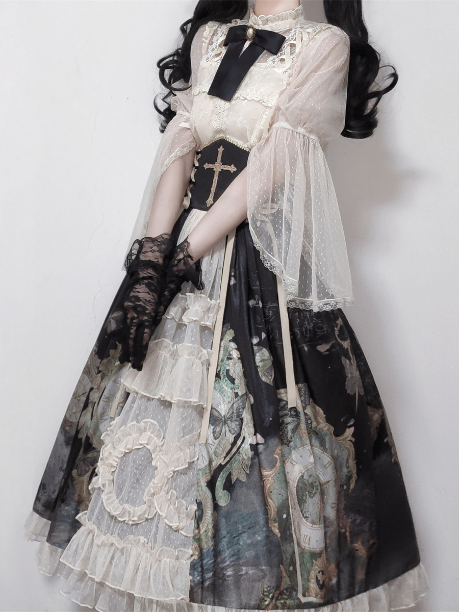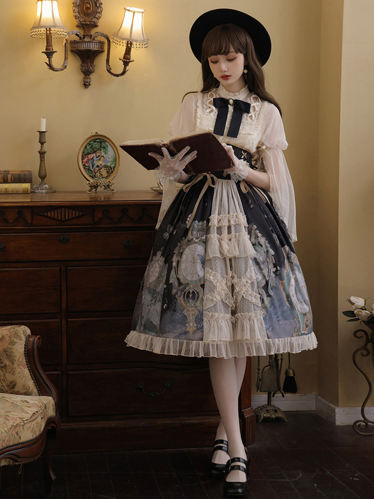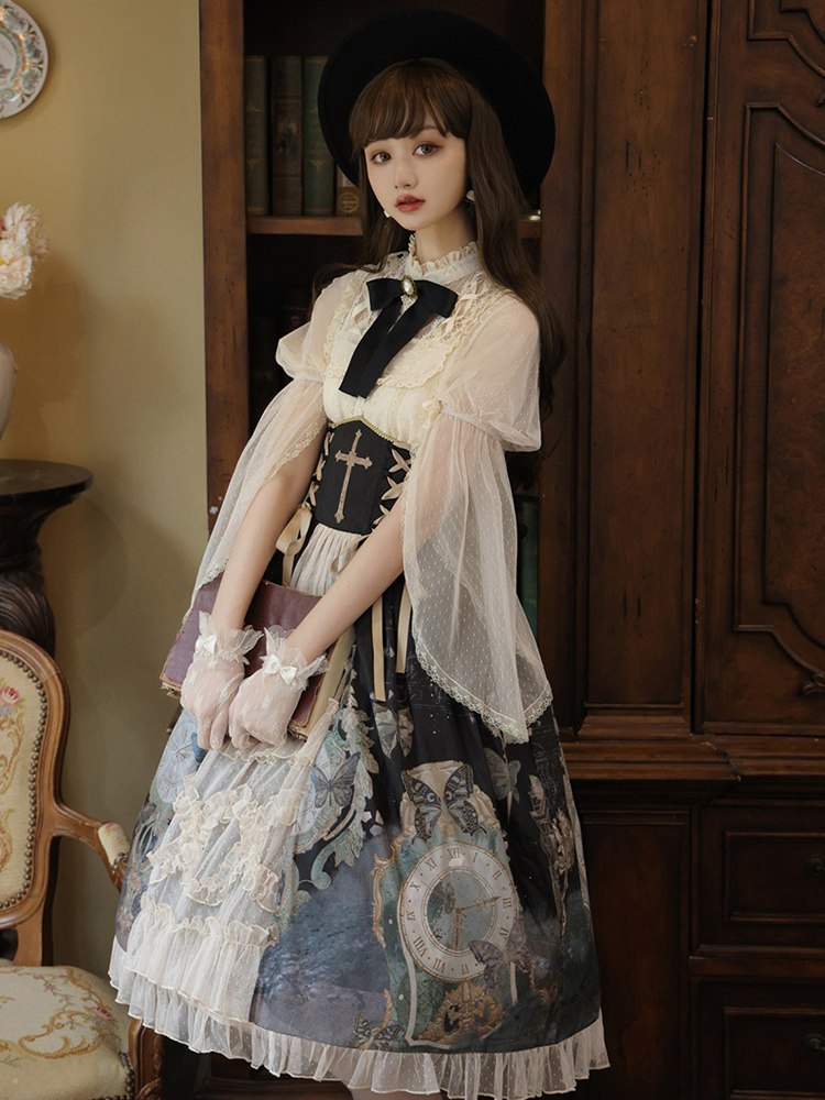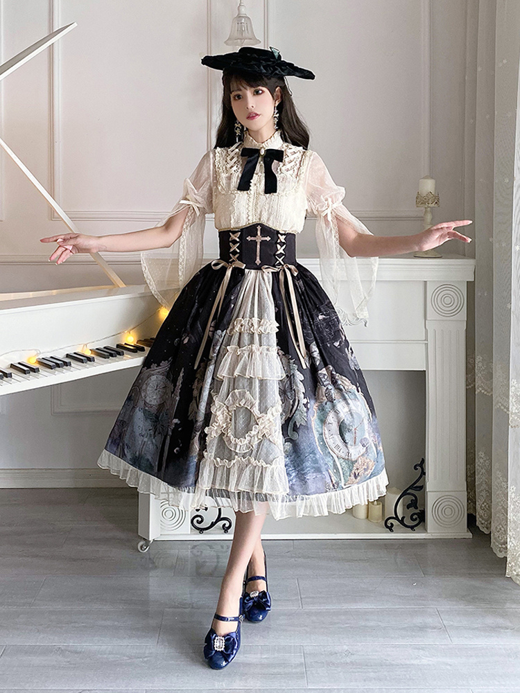 This Classical Lolita three-piece set features a corset waist skirt, a sheer blouse, and a delicate camisole undershirt, combining structured elegance with layered sophistication for a refined coordinate.