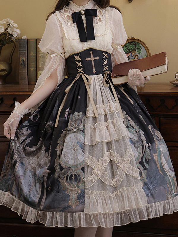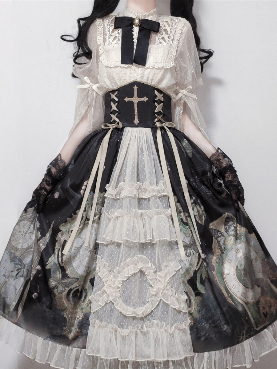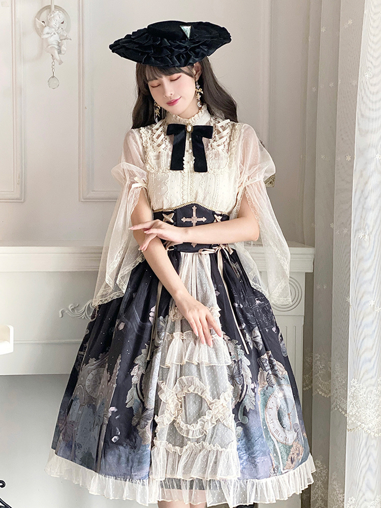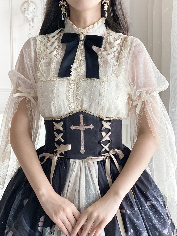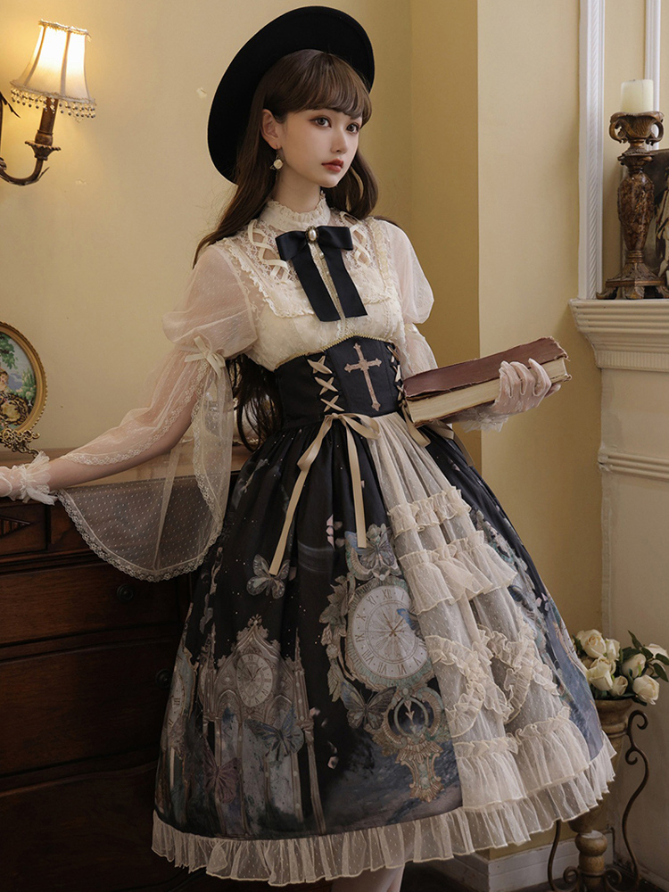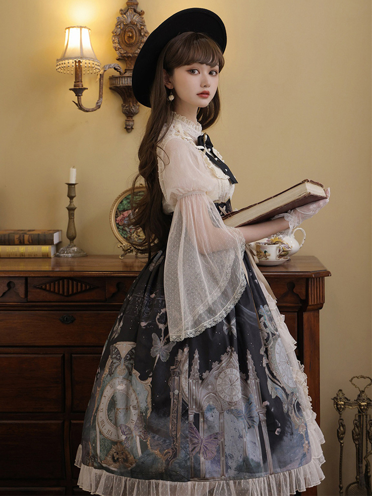 This Classical Lolita three-piece set features a corset waist skirt, a sheer blouse, and a delicate camisole undershirt, combining structured elegance with layered sophistication for a refined coordinate.
