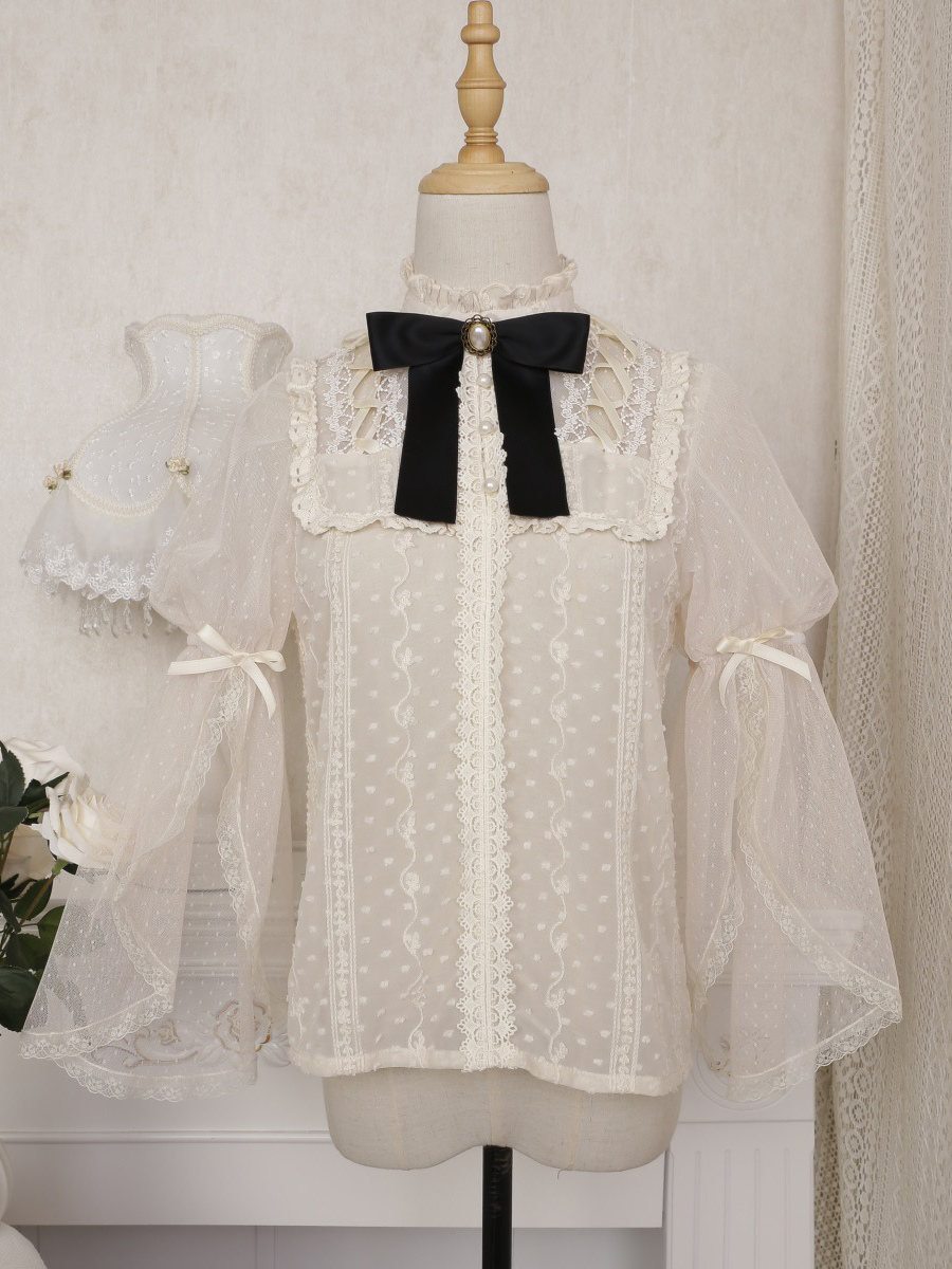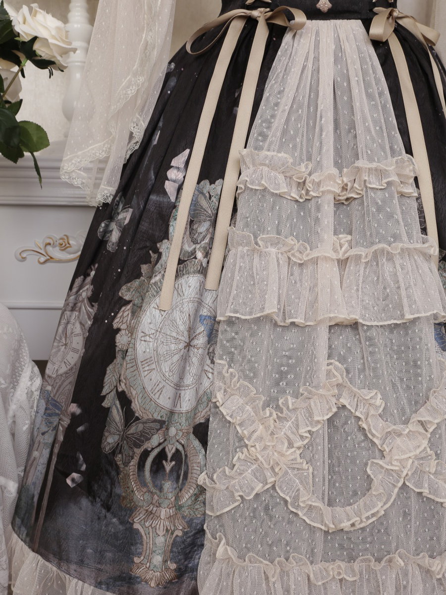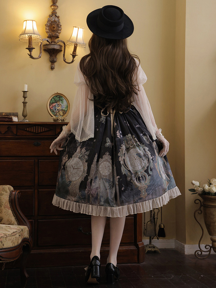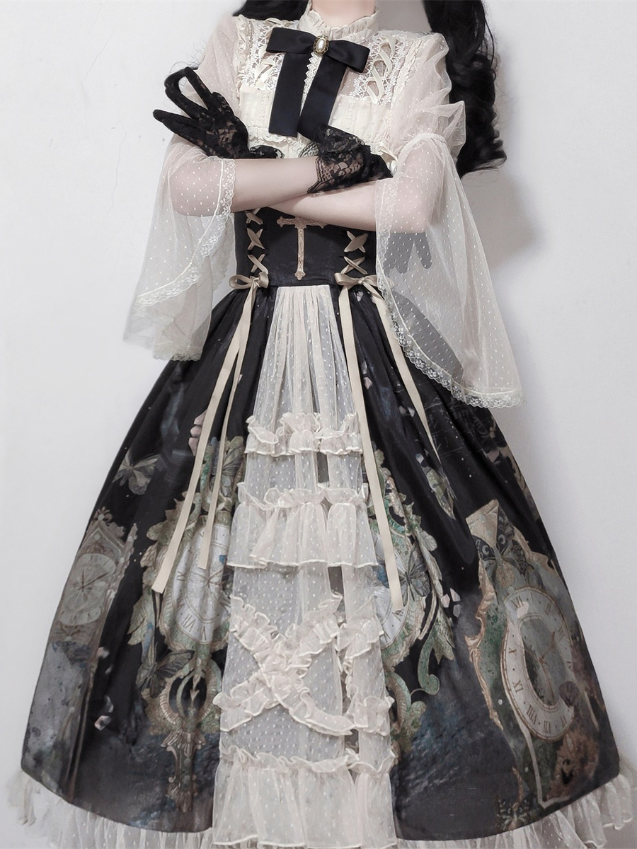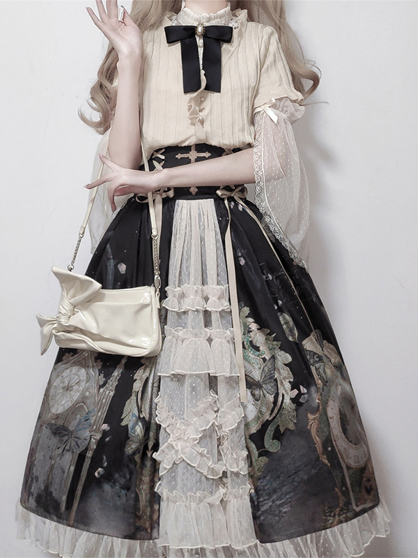 This Classical Lolita three-piece set features a corset waist skirt, a sheer blouse, and a delicate camisole undershirt, combining structured elegance with layered sophistication for a refined coordinate.