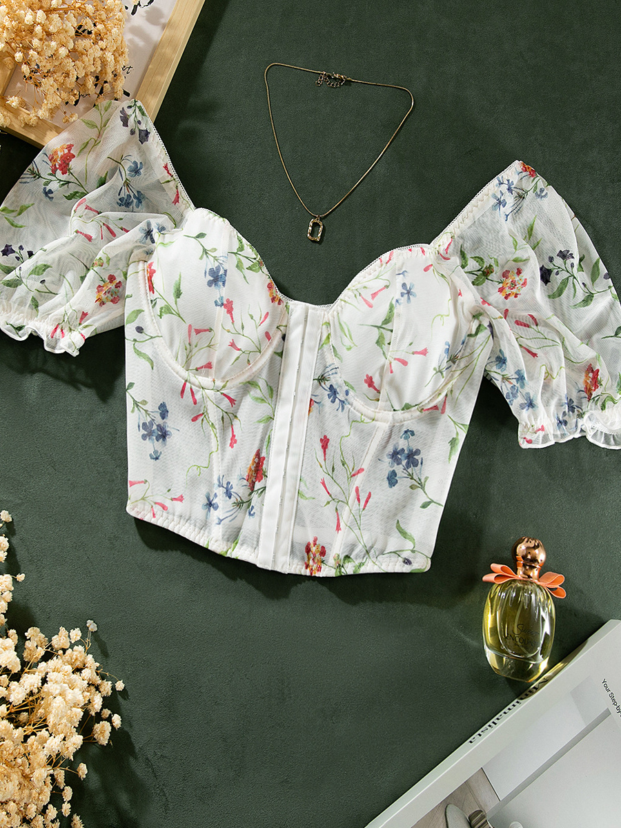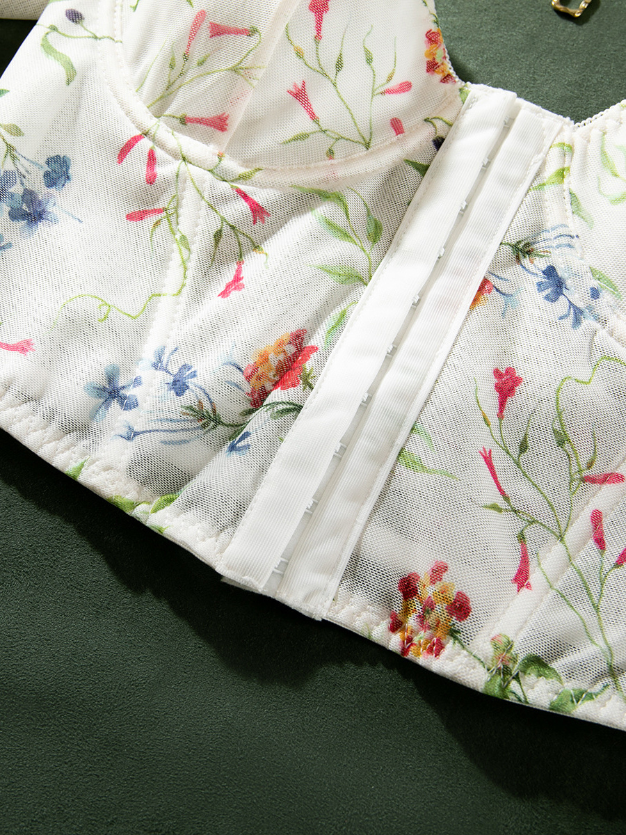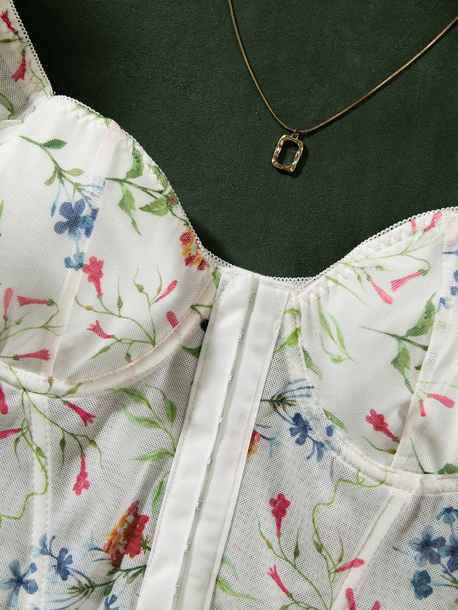 コルセット ホワイトフラワー 花柄プリント 半袖 デイリーカジュアルランジェリー