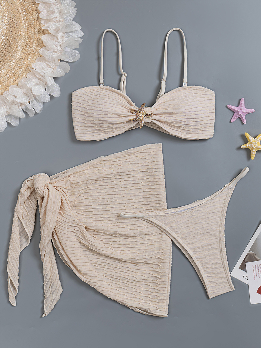 クリーム色の3点セット水着(女性用) - ゴールドのヒトデ柄のテクスチャードビキニとサロン風スカートカバーアップ - サマークルーズ2026