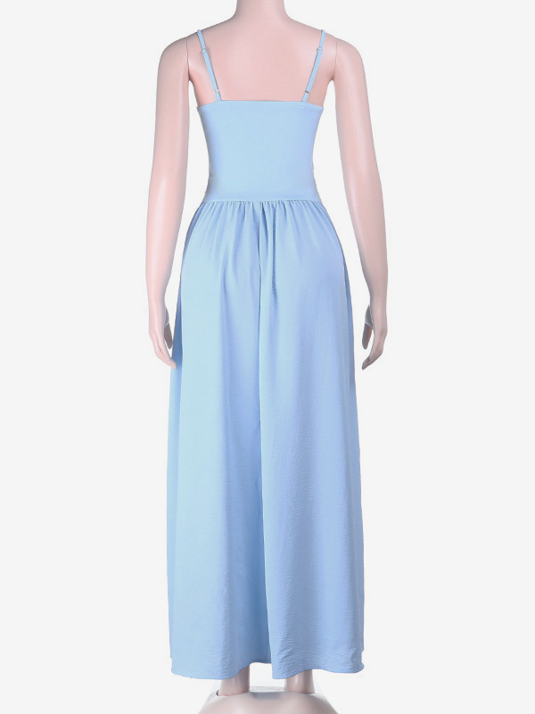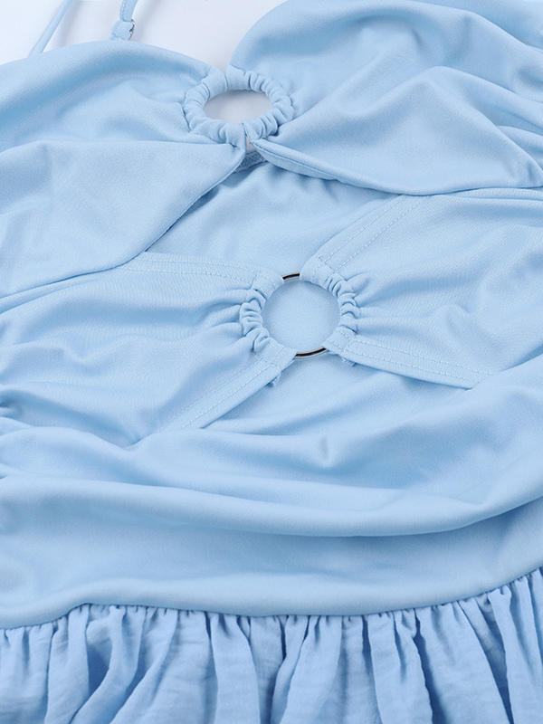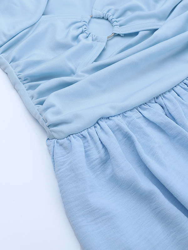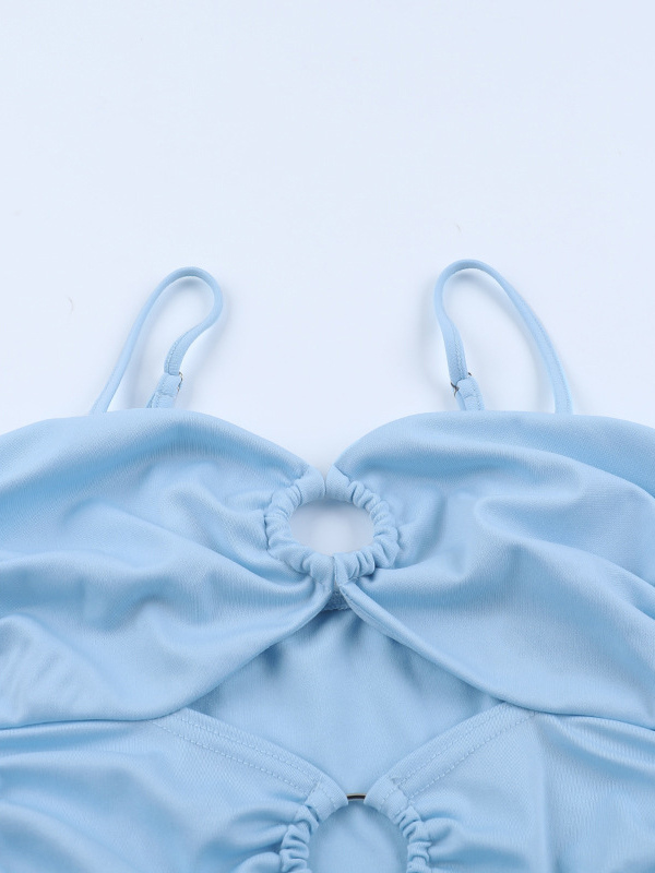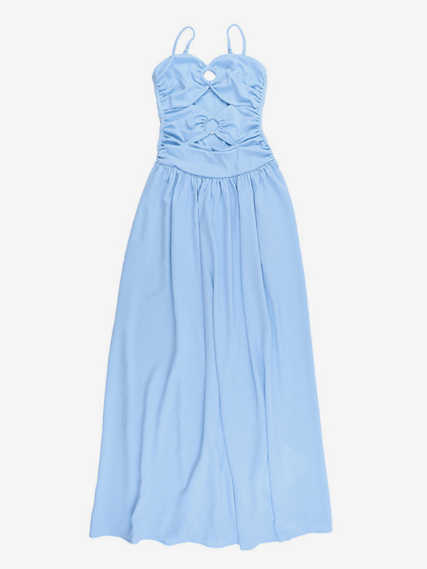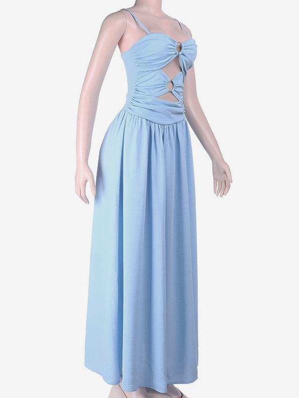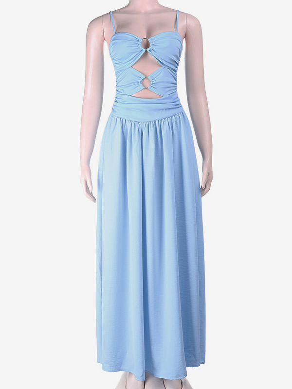 カットアウトマキシドレス(女性用) - ベビーブルー、セクシーなリングディテール、ギャザー入りスパゲッティストラップ - 2026年夏のビーチクルーズバケーション