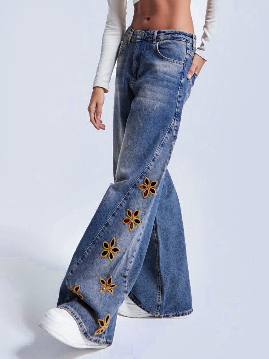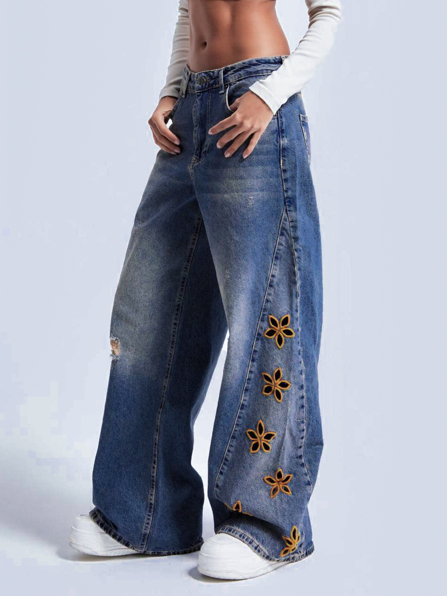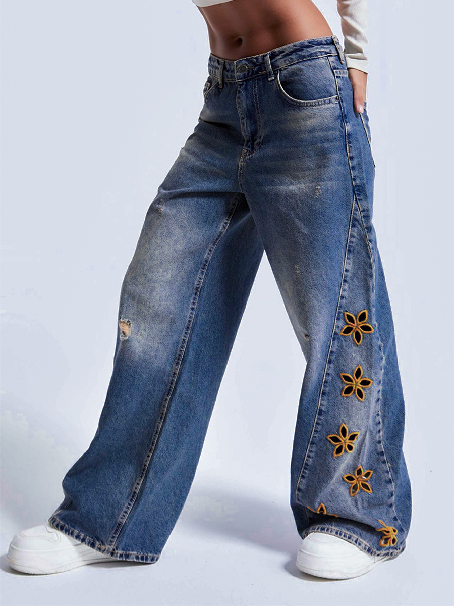 カットアウトフラワーワイドレッグジーンズ(レディース) - ミディアムウォッシュ ヴィンテージ風ダメージ加工 Y2Kパンツ - 2026年春祭りストリートウェア