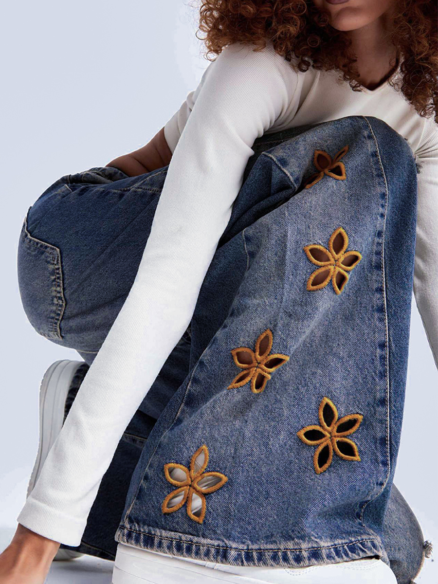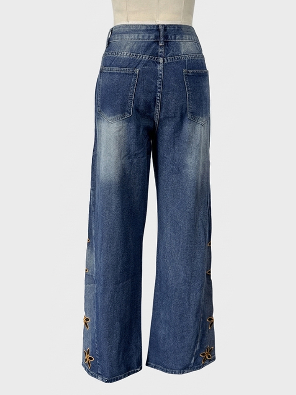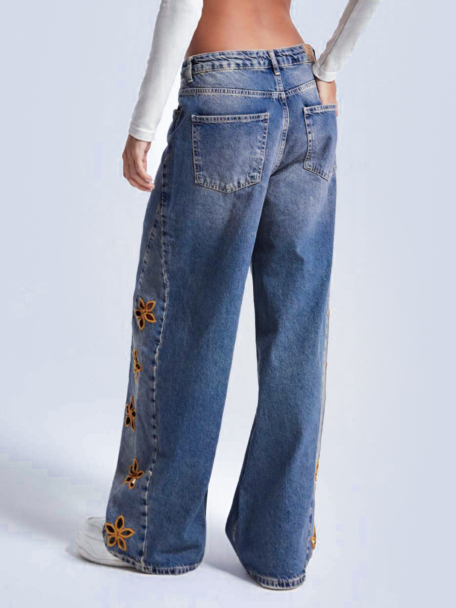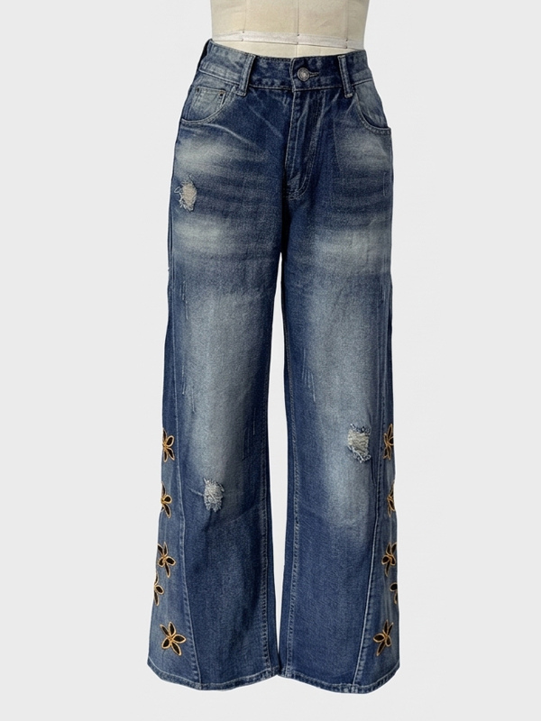 カットアウトフラワーワイドレッグジーンズ(レディース) - ミディアムウォッシュ ヴィンテージ風ダメージ加工 Y2Kパンツ - 2026年春祭りストリートウェア