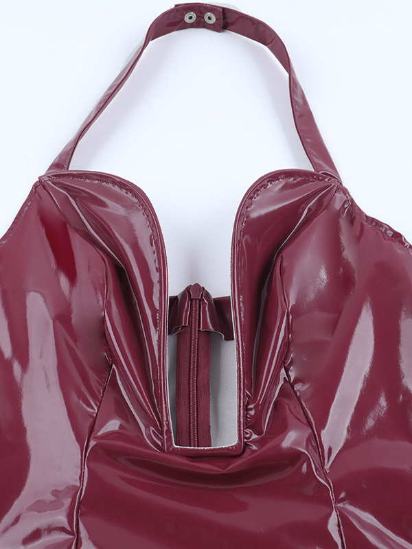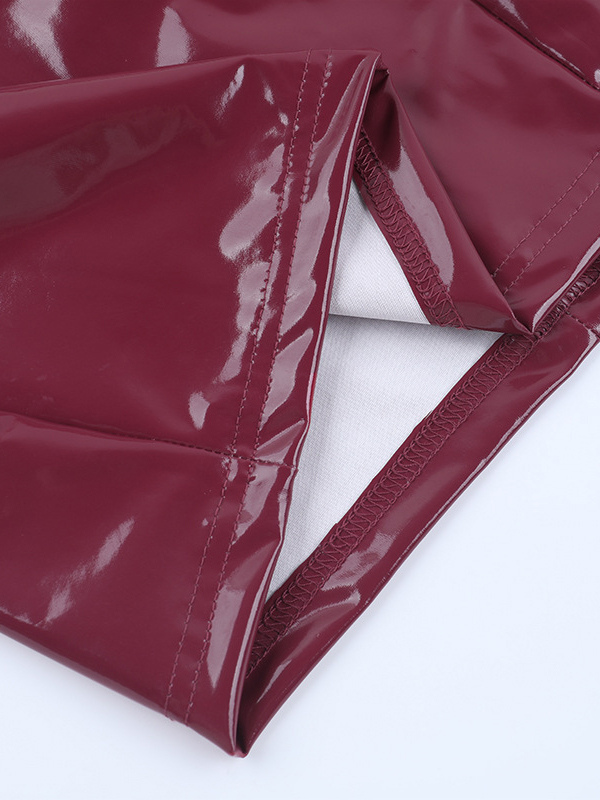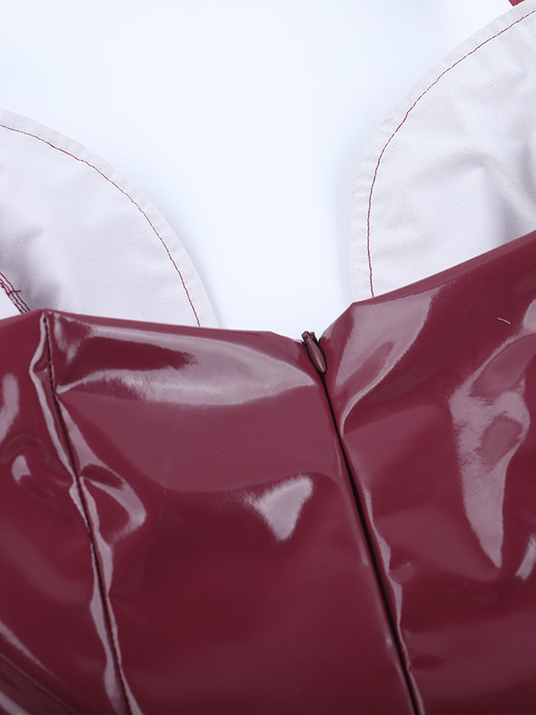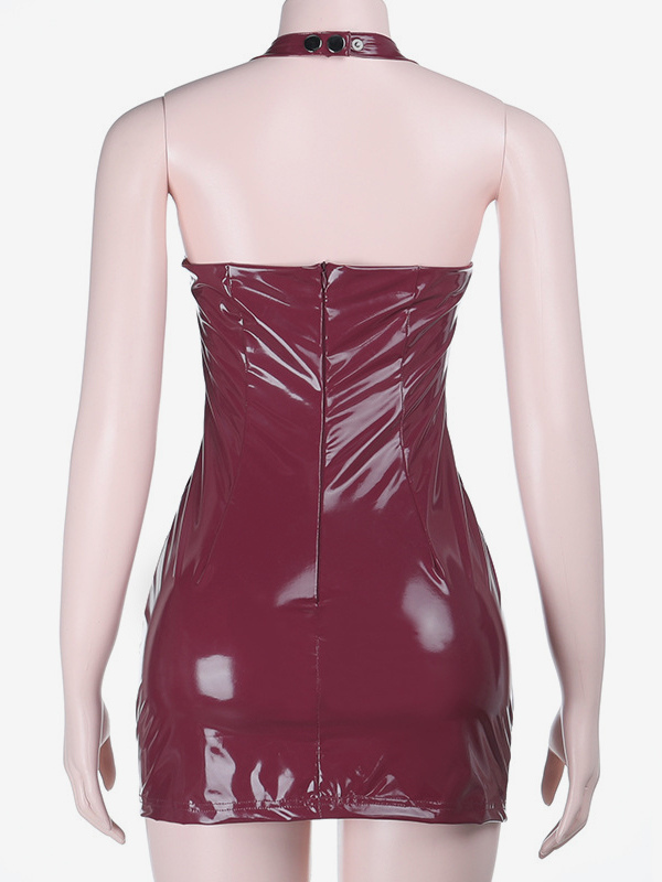 ダークレッドのフェイクレザー製レディースミニドレス - セクシーなディープVネックホルターネックボディコンドレス - ナイトアウトに最適なバディスタイルサマークラブウェア2026