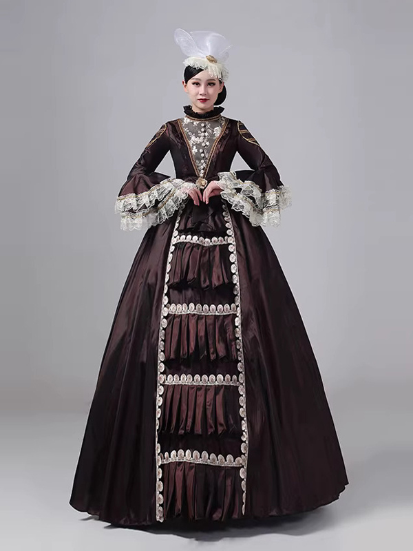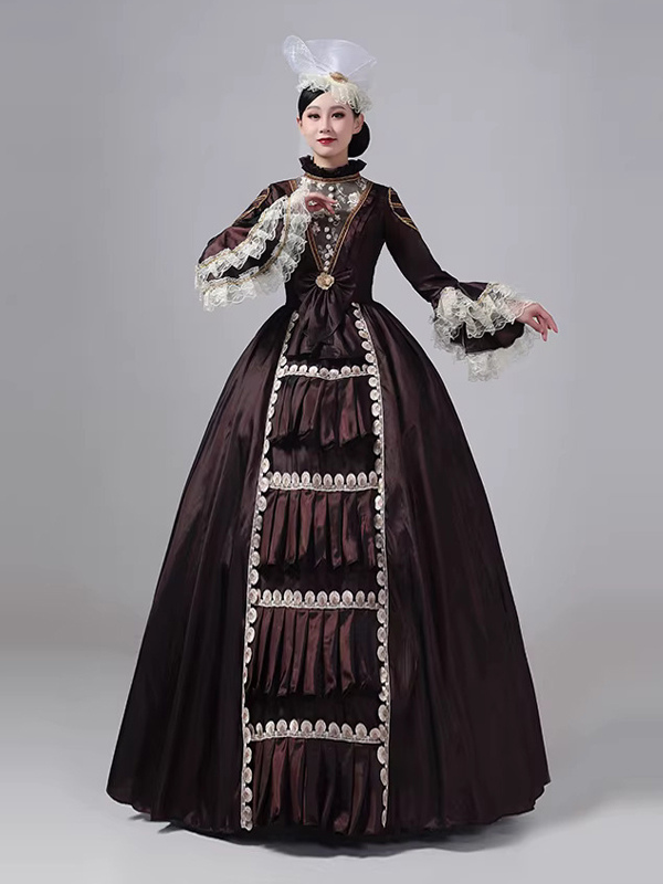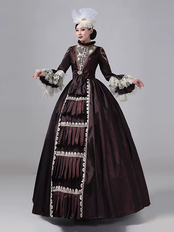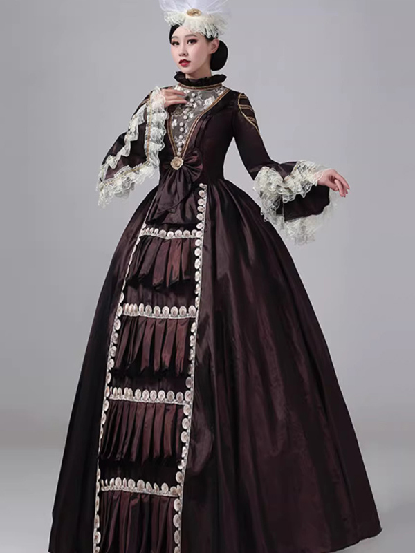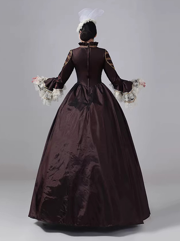 ディープブラウンのビクトリアンドレス、長袖、レース、ハイカラー、ボールレトロドレス
