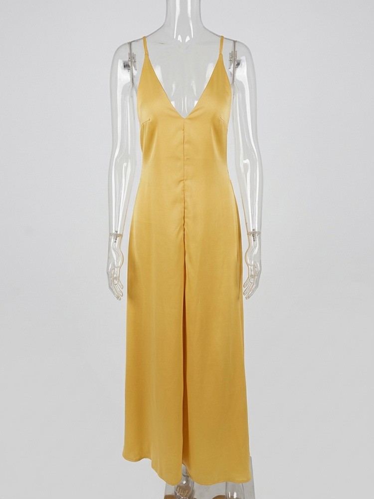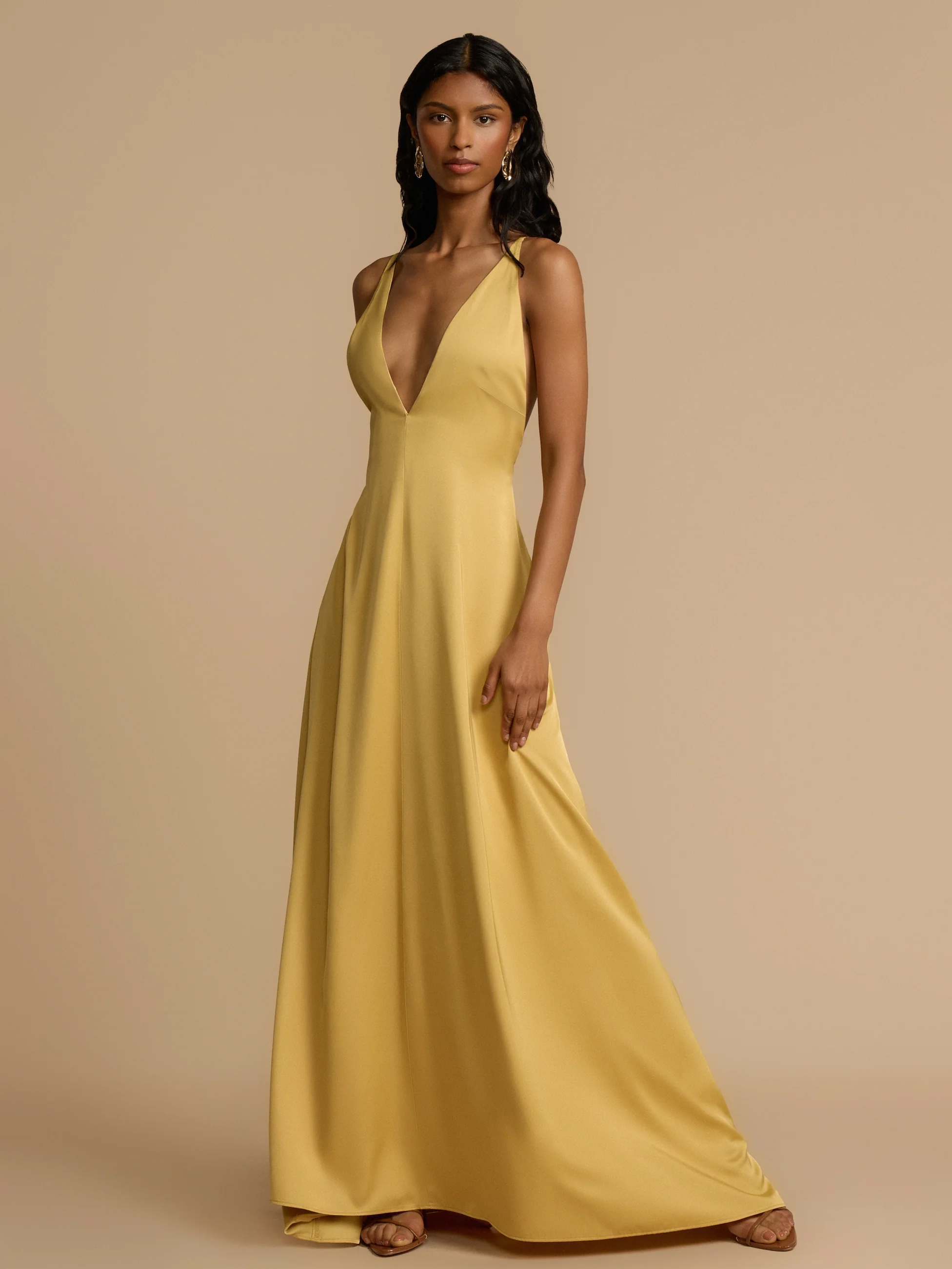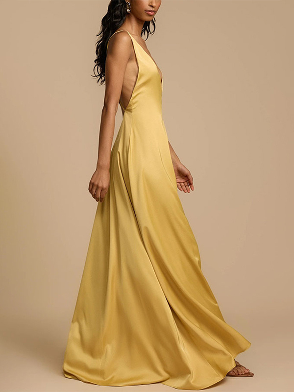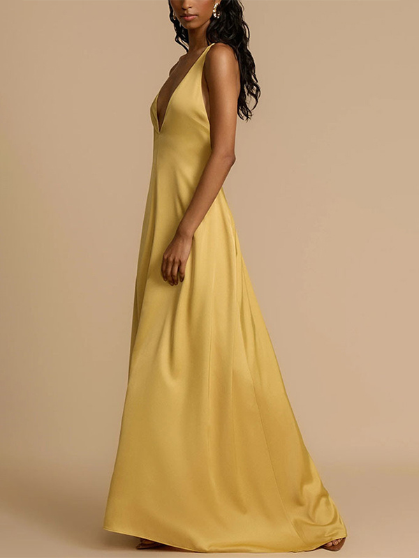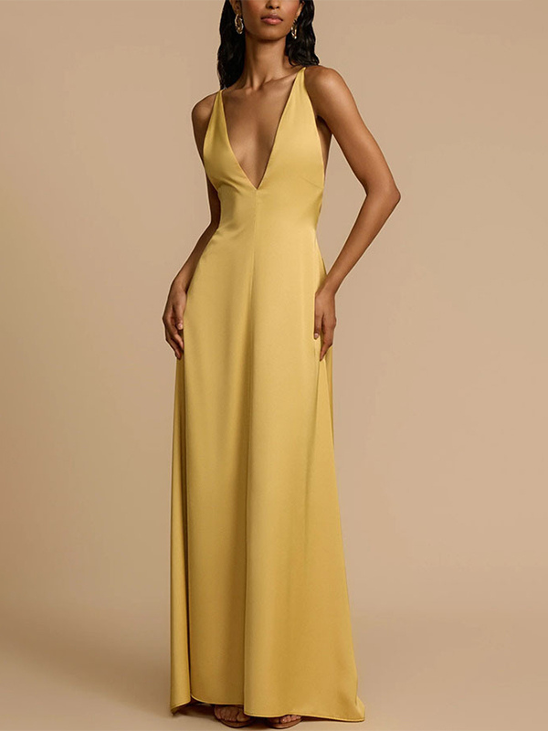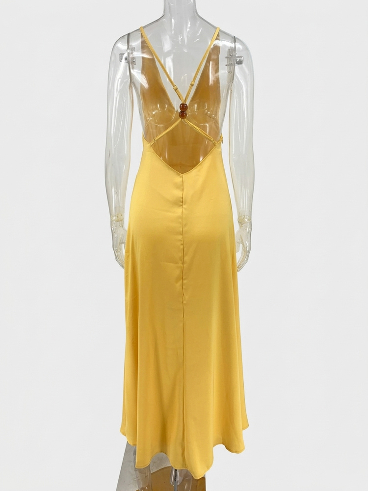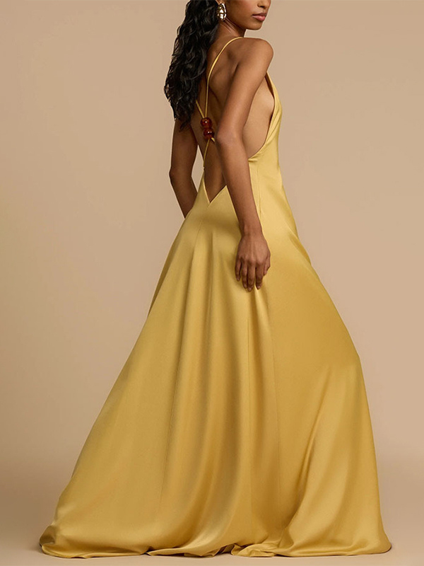 深いVネックの背中開きサテンマキシドレス(女性用) - イエローのボヘミアン風ウッドビーズイブニングガウン - 夏のビーチウェディングゲスト 2026