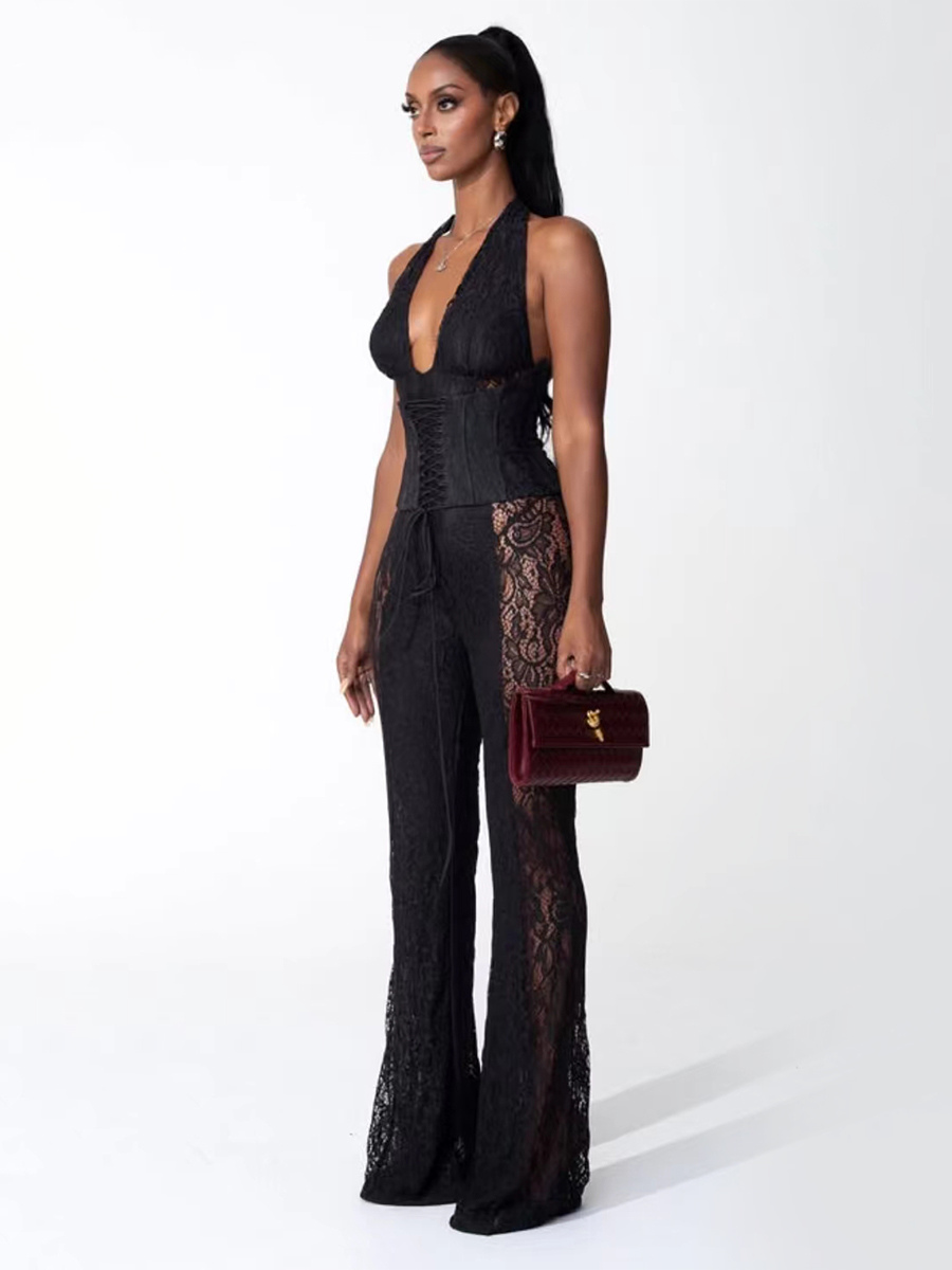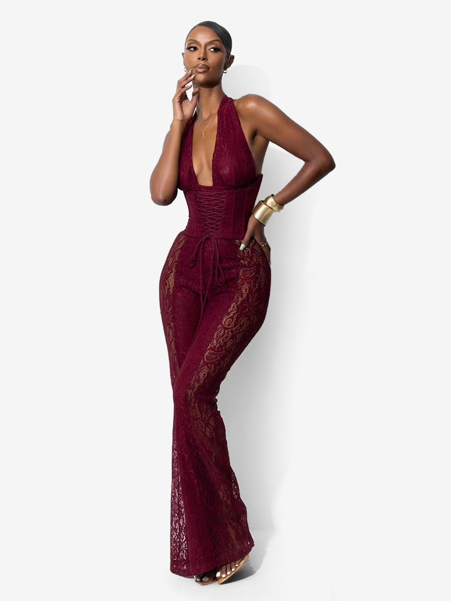 ディープVネックホルターネックレースアップコルセットレースパッチワークジャンプスーツ(レディース)2026