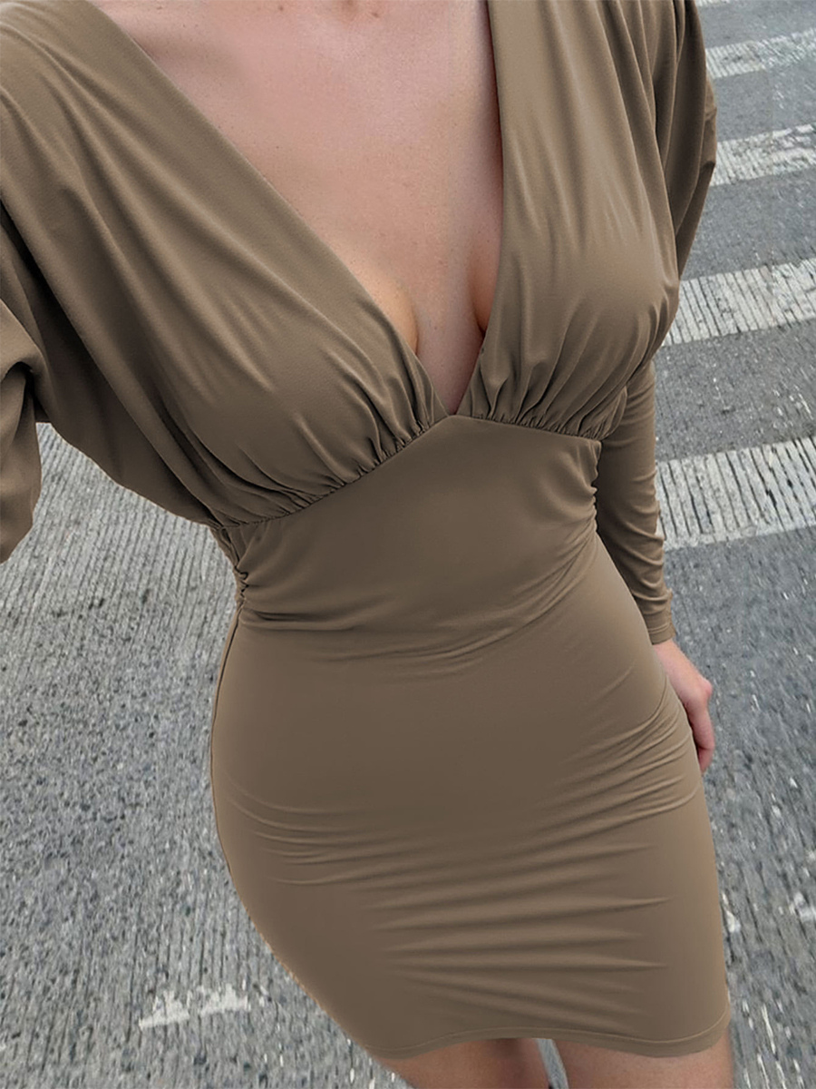 ディープVネック、ルーシュ入りロングスリーブ、ボディコンミニドレス(レディース)2026