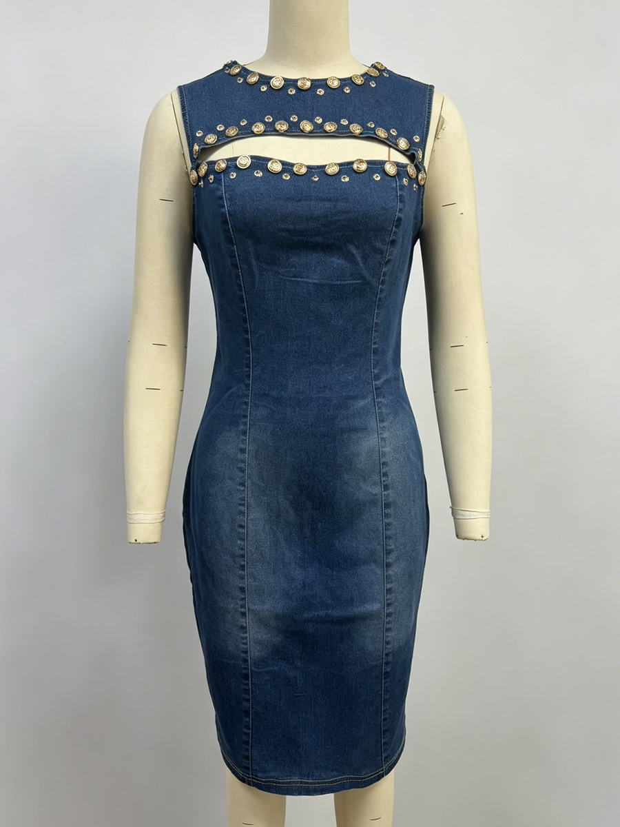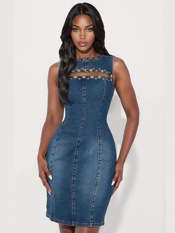 レディースデニムカットアウトボディコンドレス - ブルースタッズ付きノースリーブスリムフィットペンシルシースミディドレス - サマーパーティクラブウェア2026