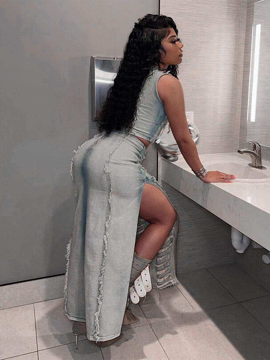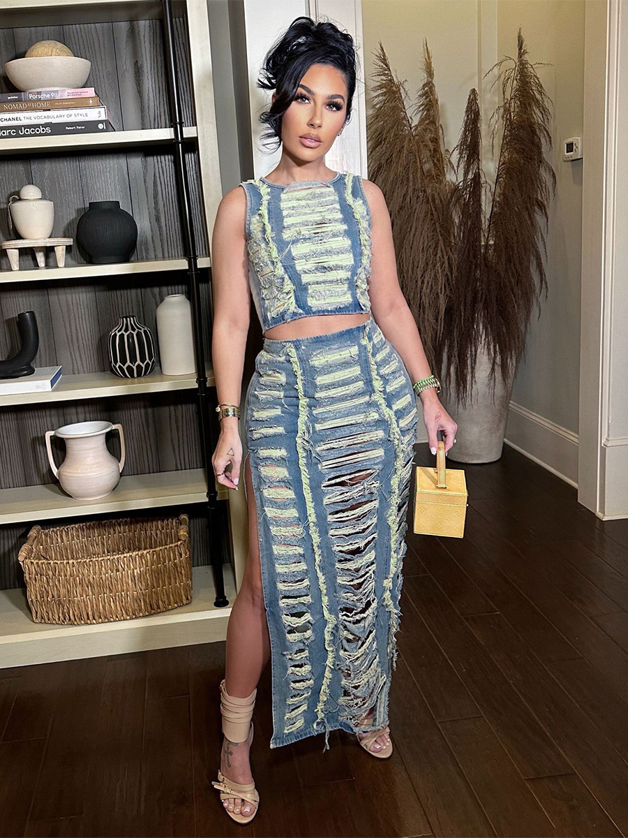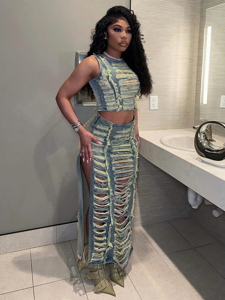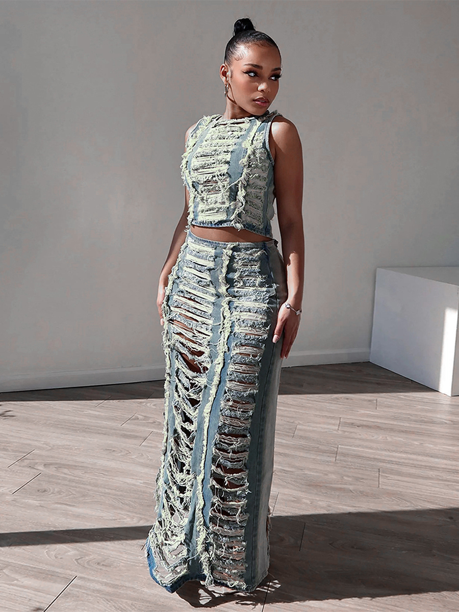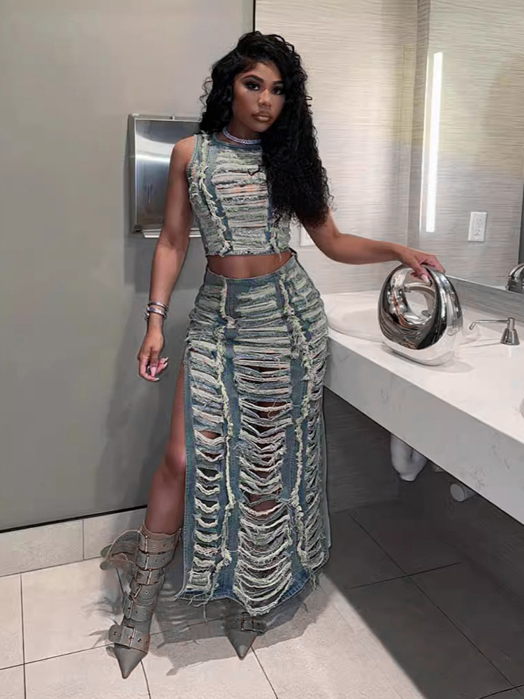 ダメージ加工デニム2点セット(レディース) - ヴィンテージウォッシュ加工、破れ加工、マキシ丈スリットスカートとクロップトップ - 夏のフェスティバルパーティーウェア 2026