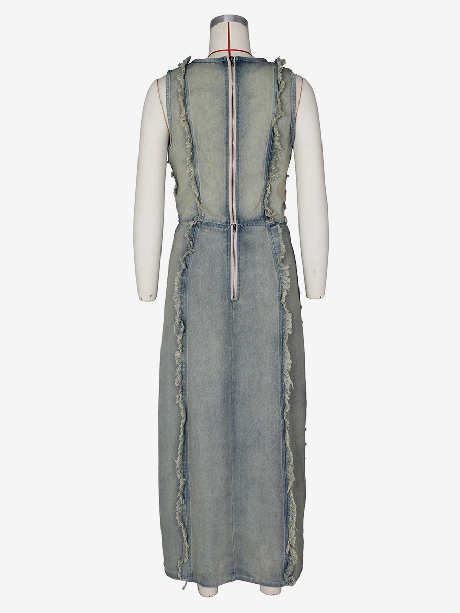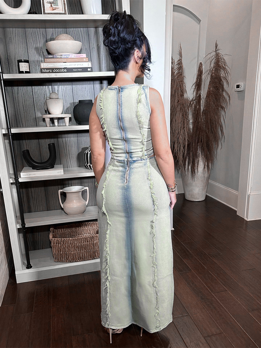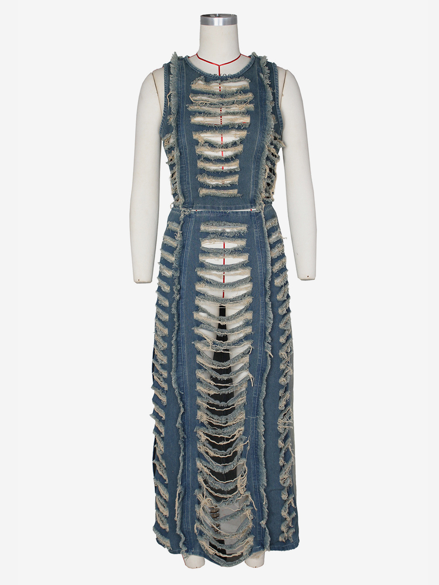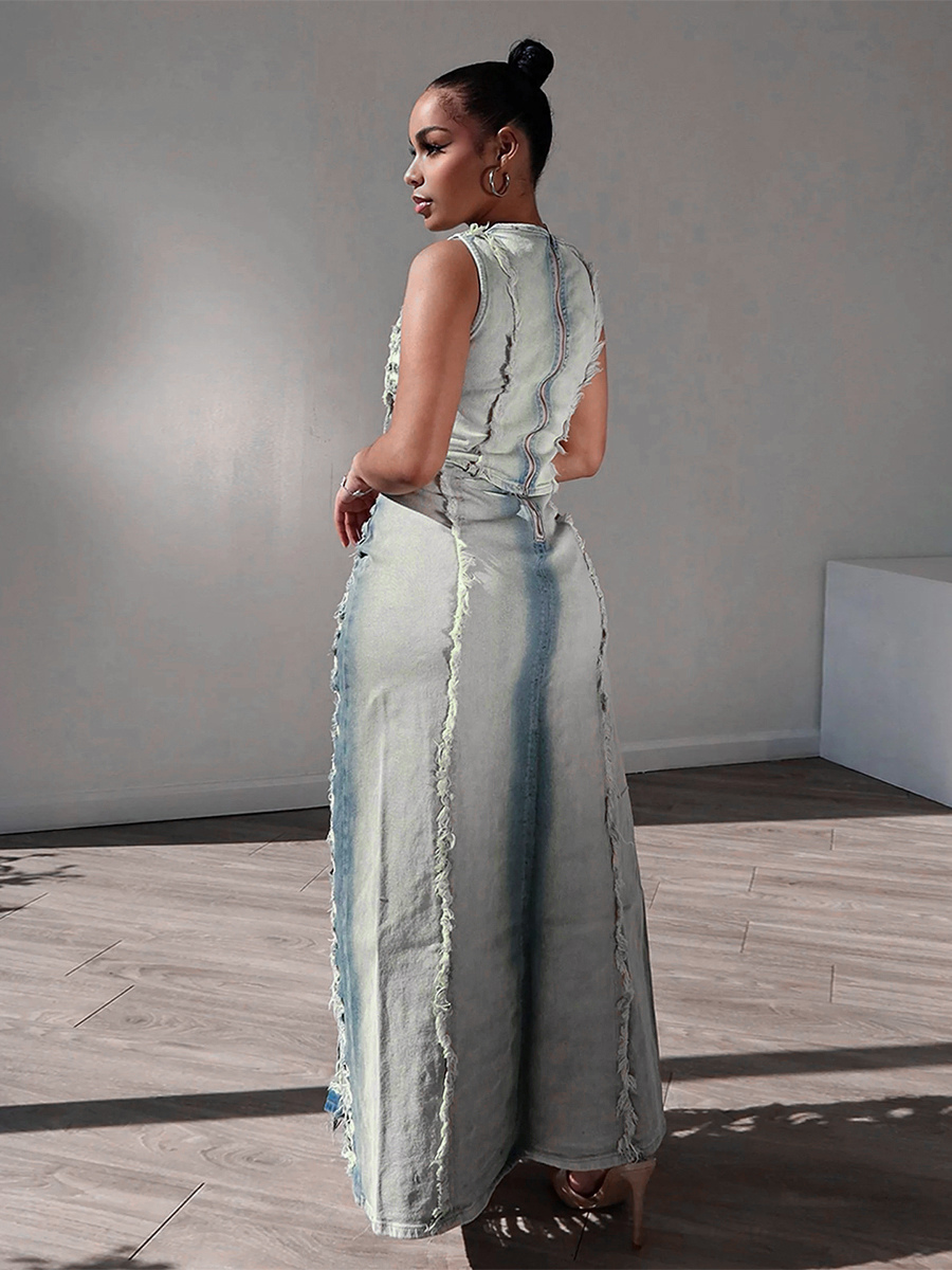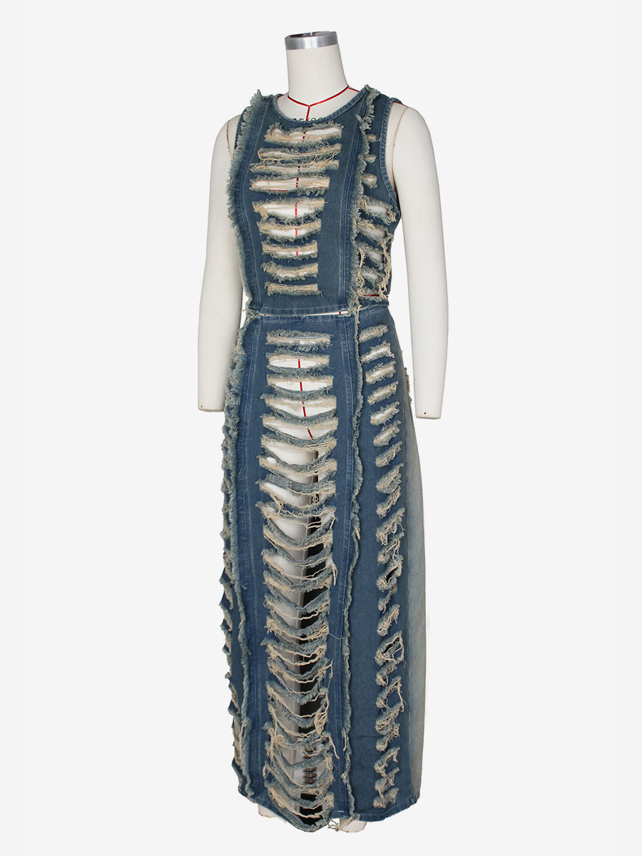 ダメージ加工デニム2点セット(レディース) - ヴィンテージウォッシュ加工、破れ加工、マキシ丈スリットスカートとクロップトップ - 夏のフェスティバルパーティーウェア 2026