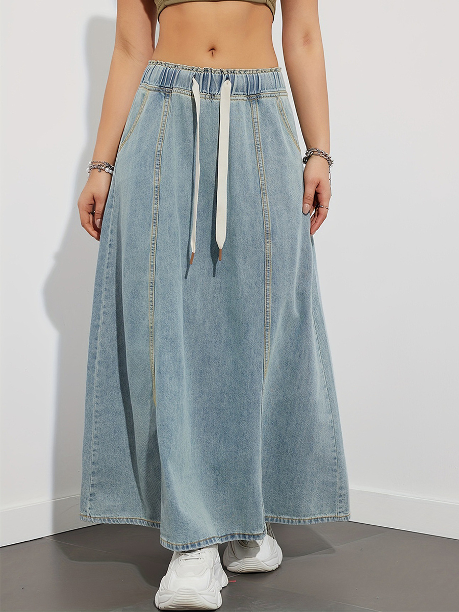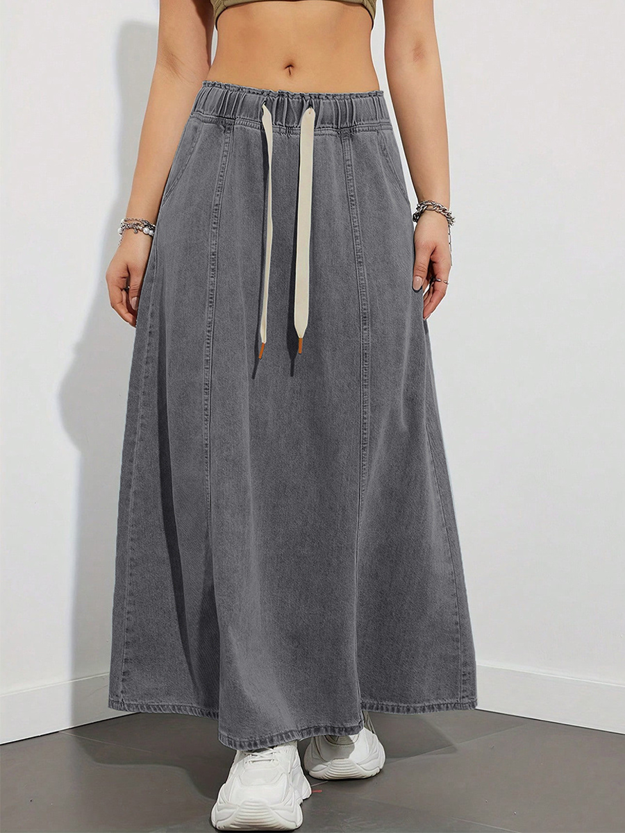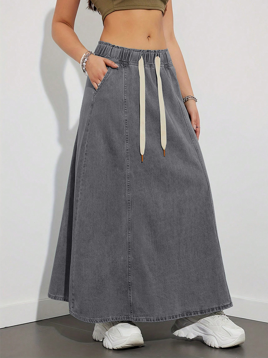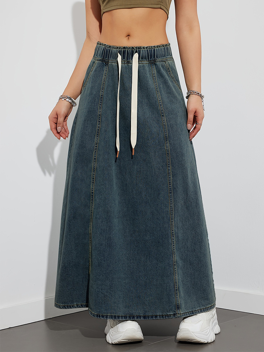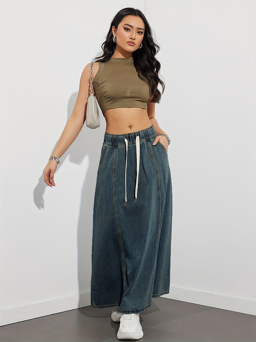 ドローストリングウエストデニムマキシスカート(レディース) - ポケット付きカジュアルAラインフレアロングスカート - 2026年春夏ホリデー