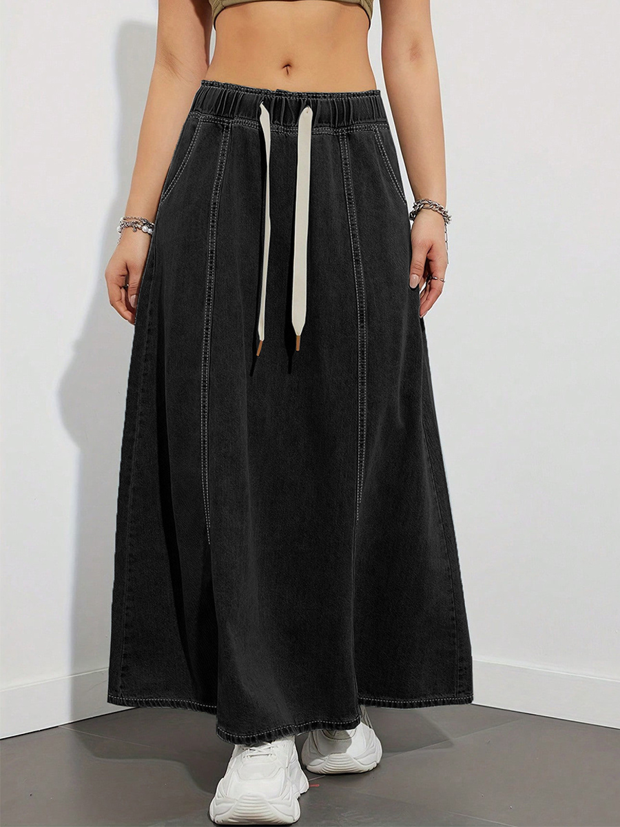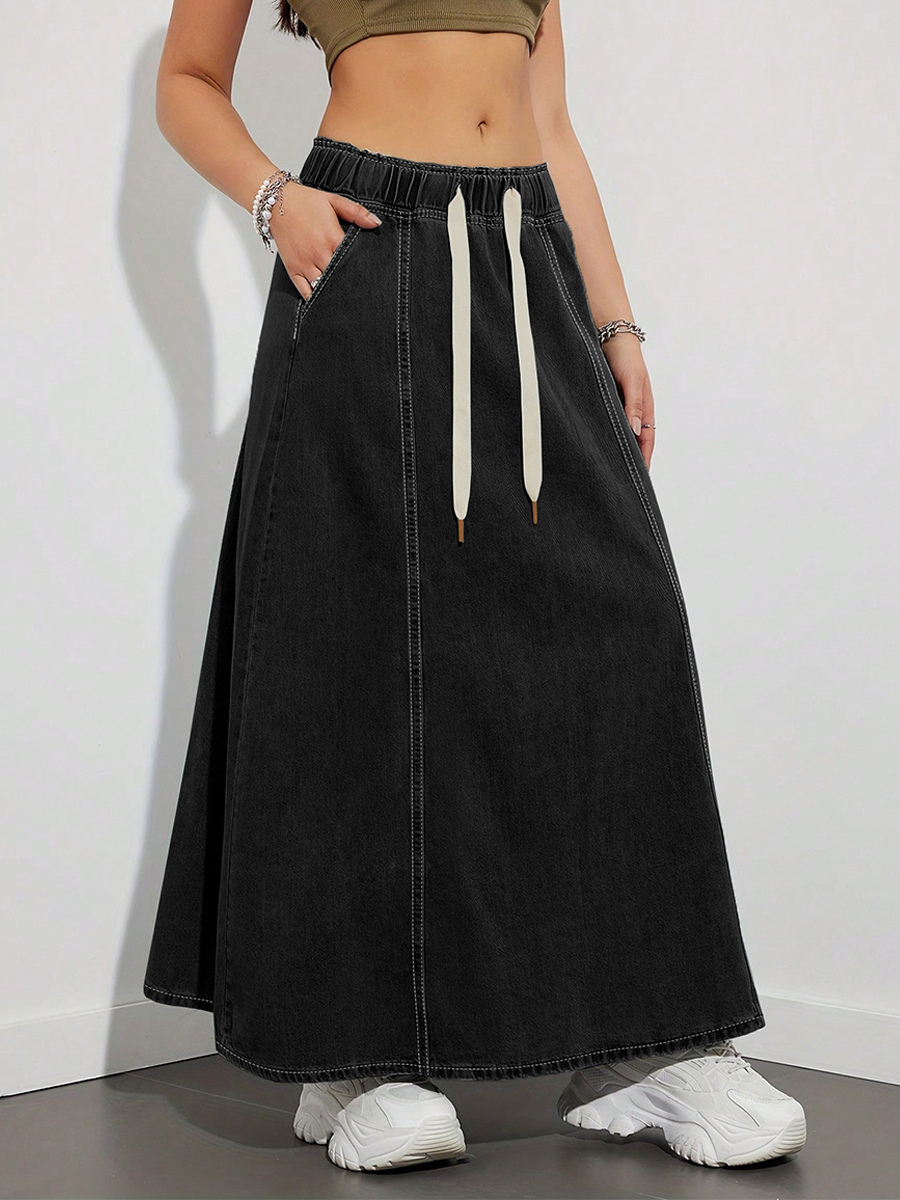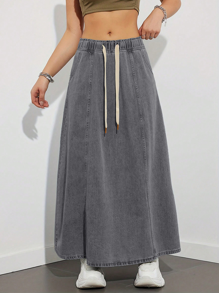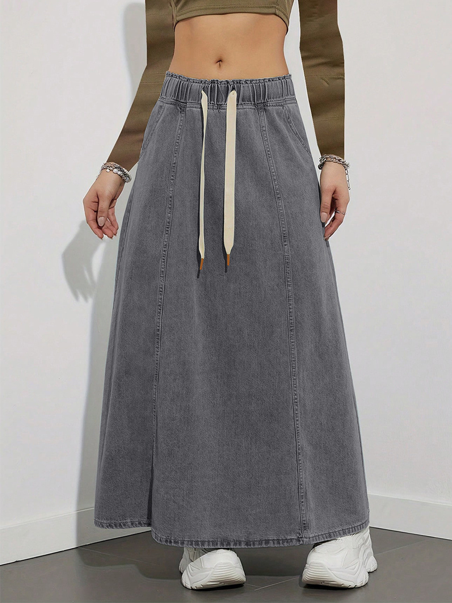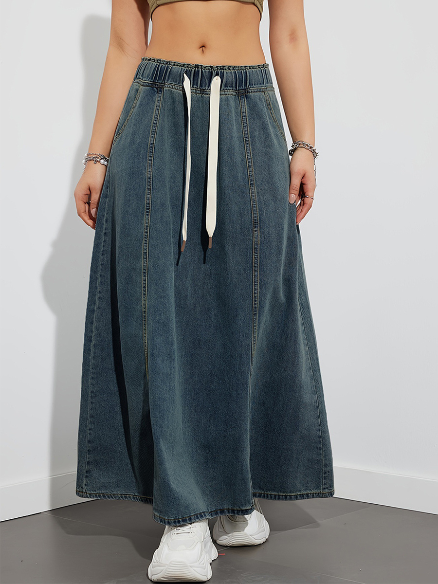ドローストリングウエストデニムマキシスカート(レディース) - ポケット付きカジュアルAラインフレアロングスカート - 2026年春夏ホリデー