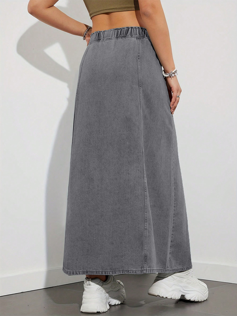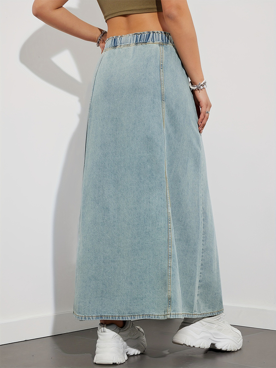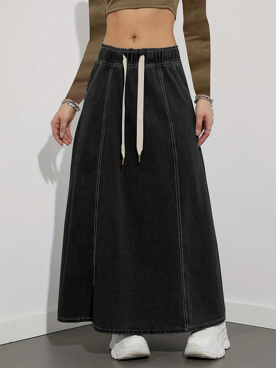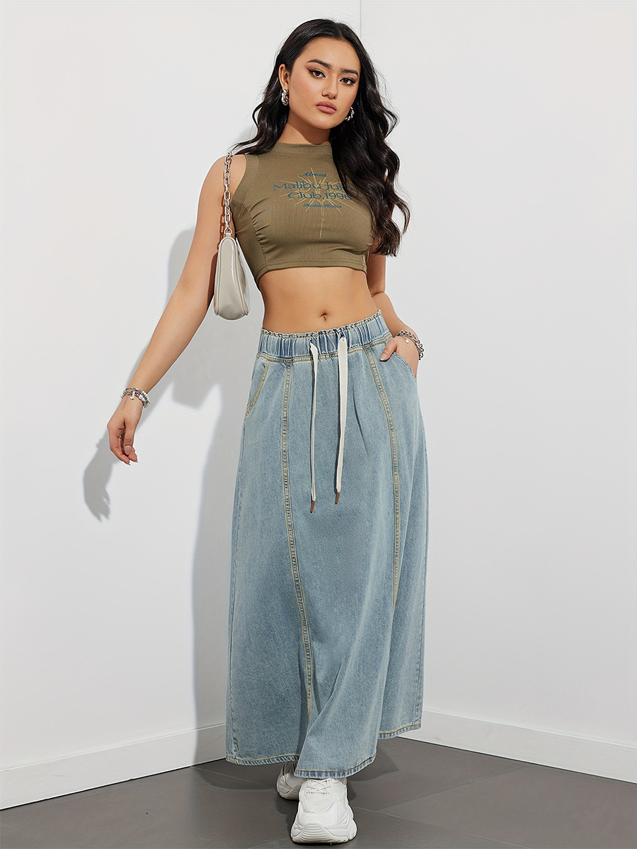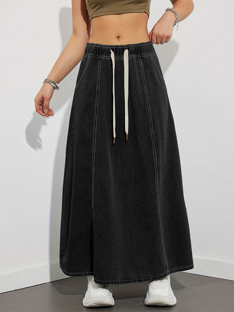 ドローストリングウエストデニムマキシスカート(レディース) - ポケット付きカジュアルAラインフレアロングスカート - 2026年春夏ホリデー