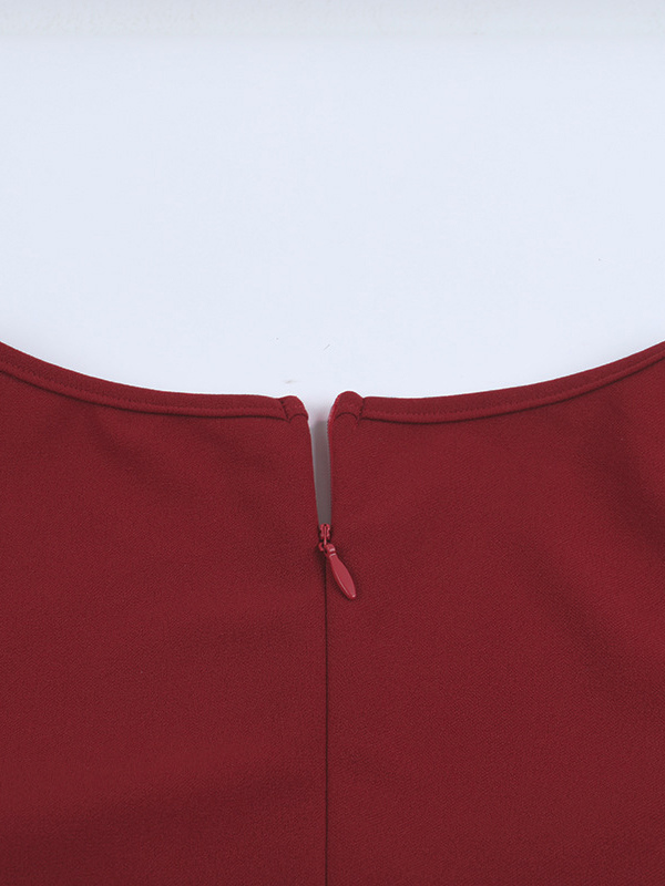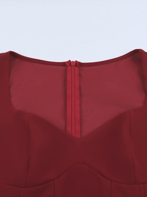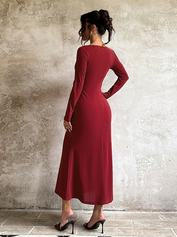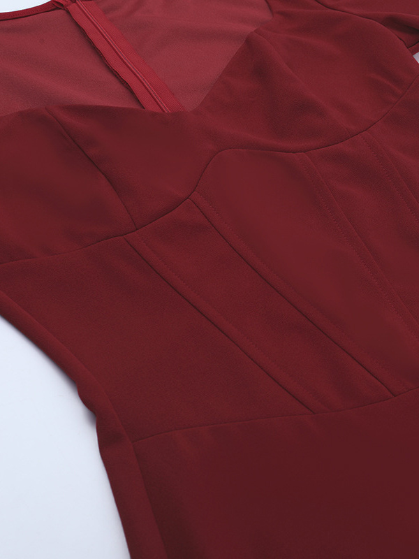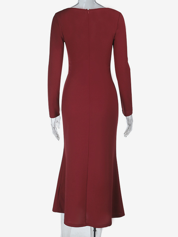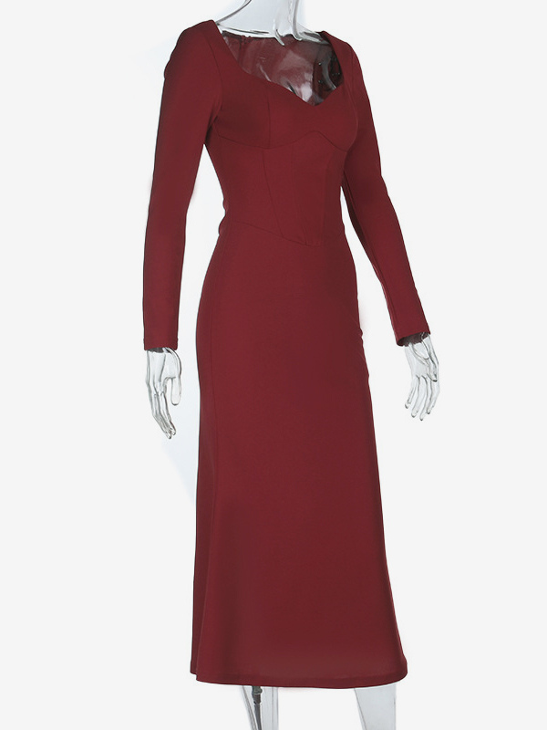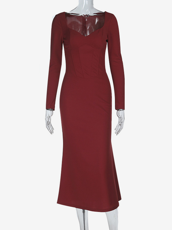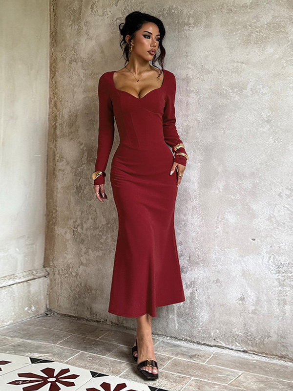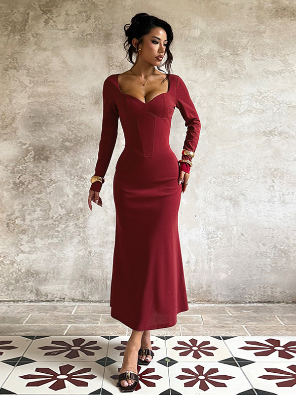 エレガントなバーガンディのボディコンドレス(女性用) - ヴィンテージ風コルセットウエスト、長袖ロングドレス - 2026年春のパーティードレス