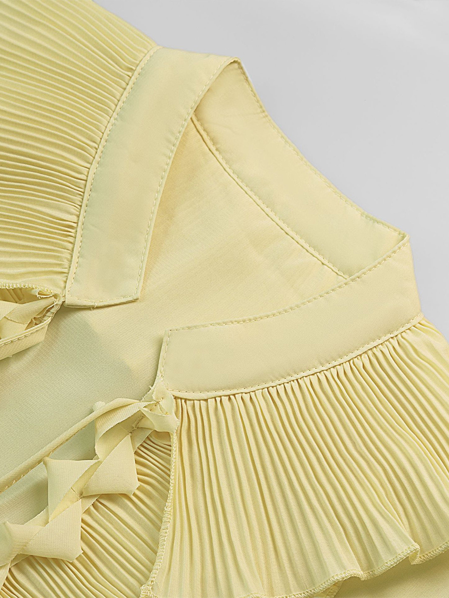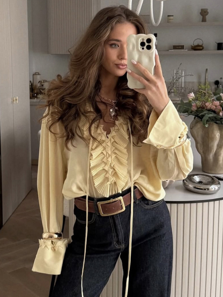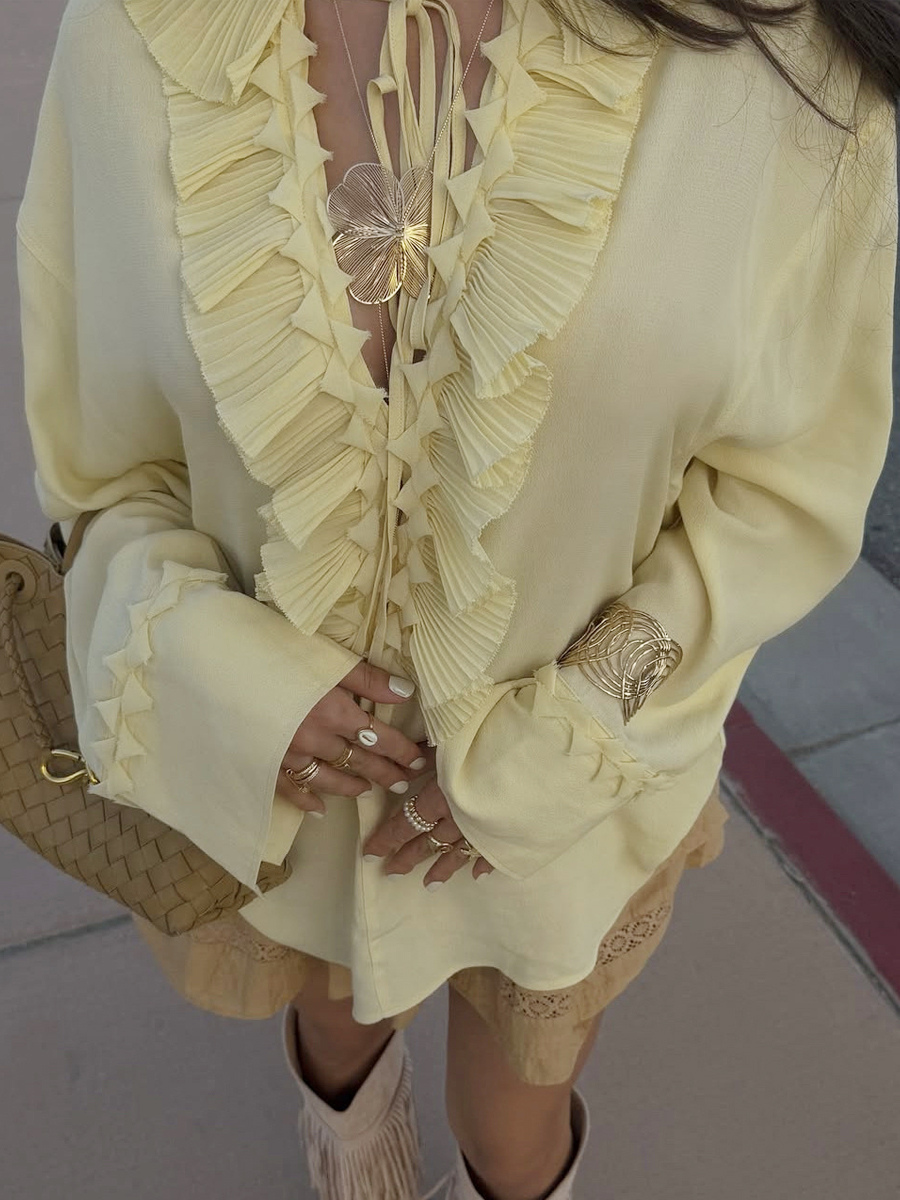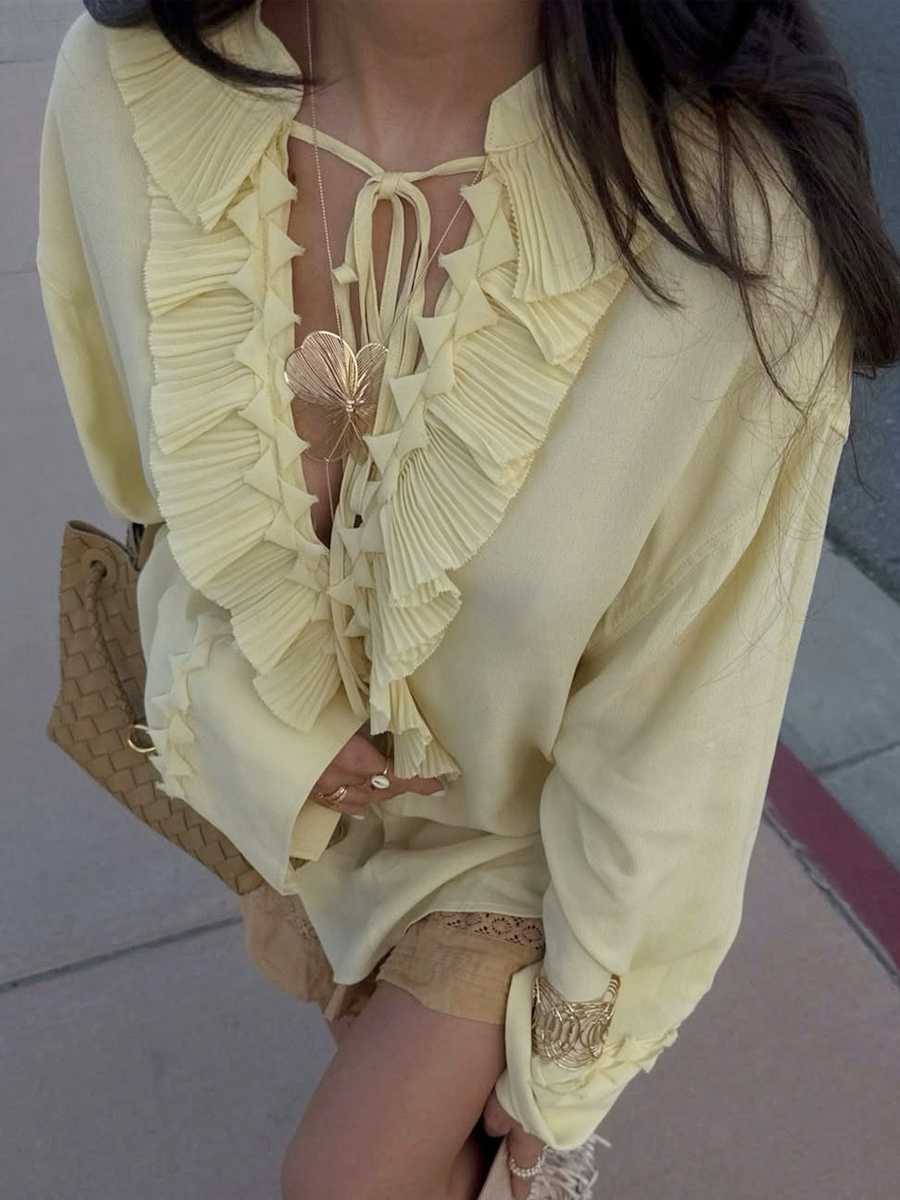 エレガントな淡い黄色のフリルVネックブラウス(オーバーサイズフィット)2025年レディース