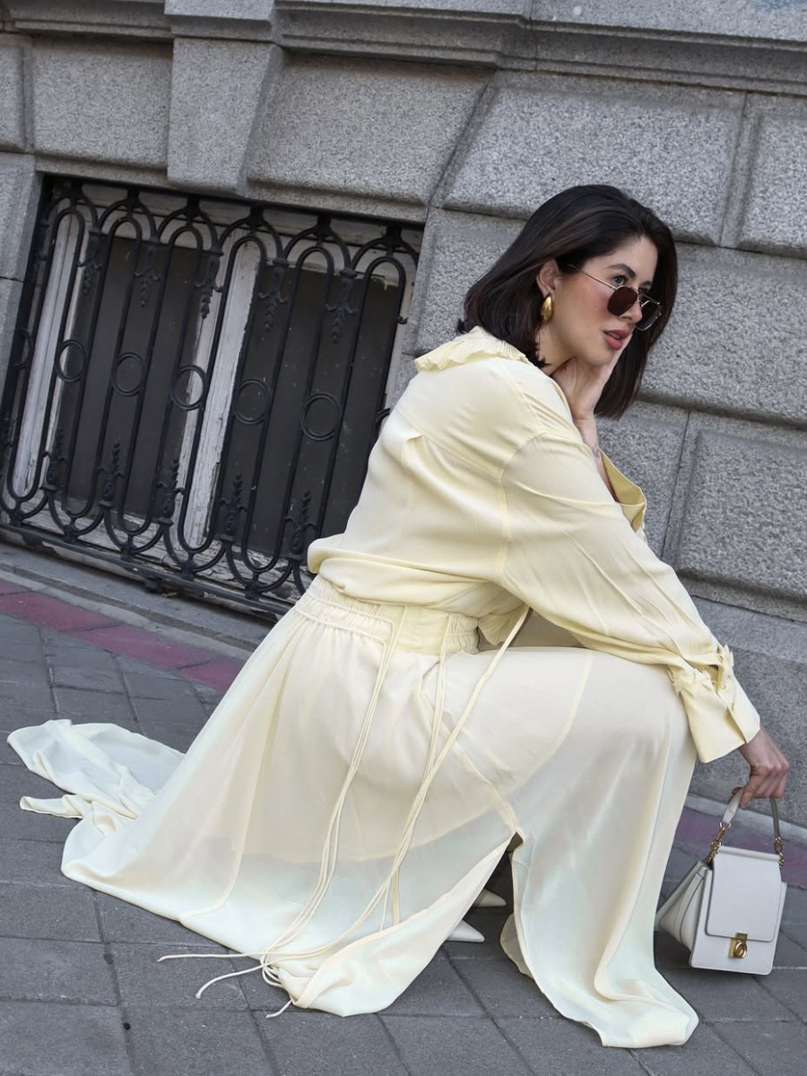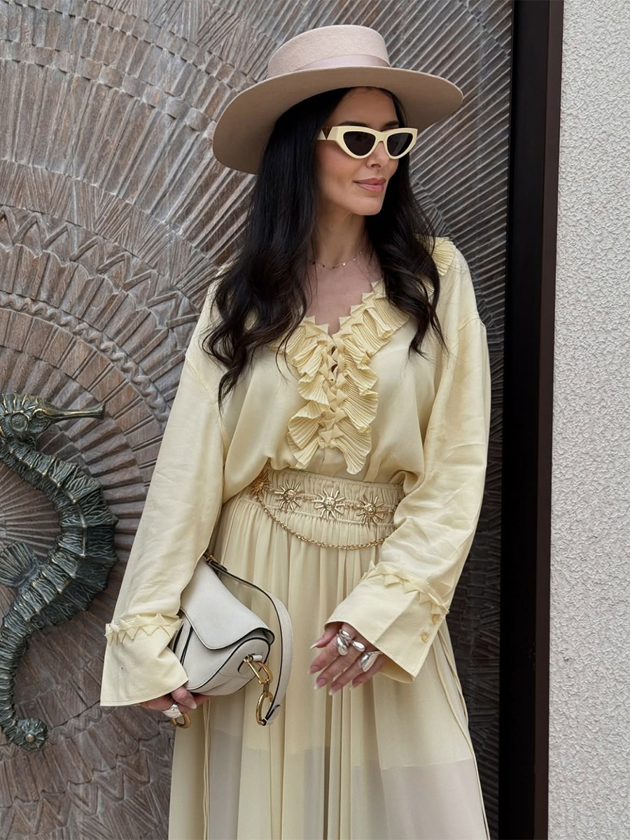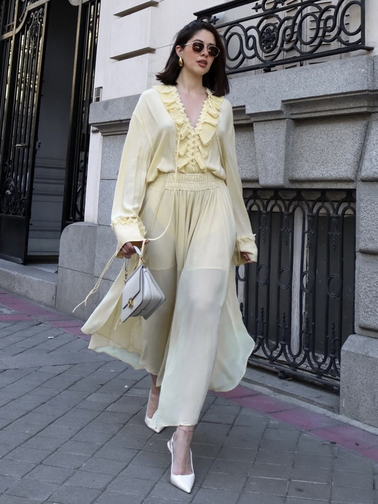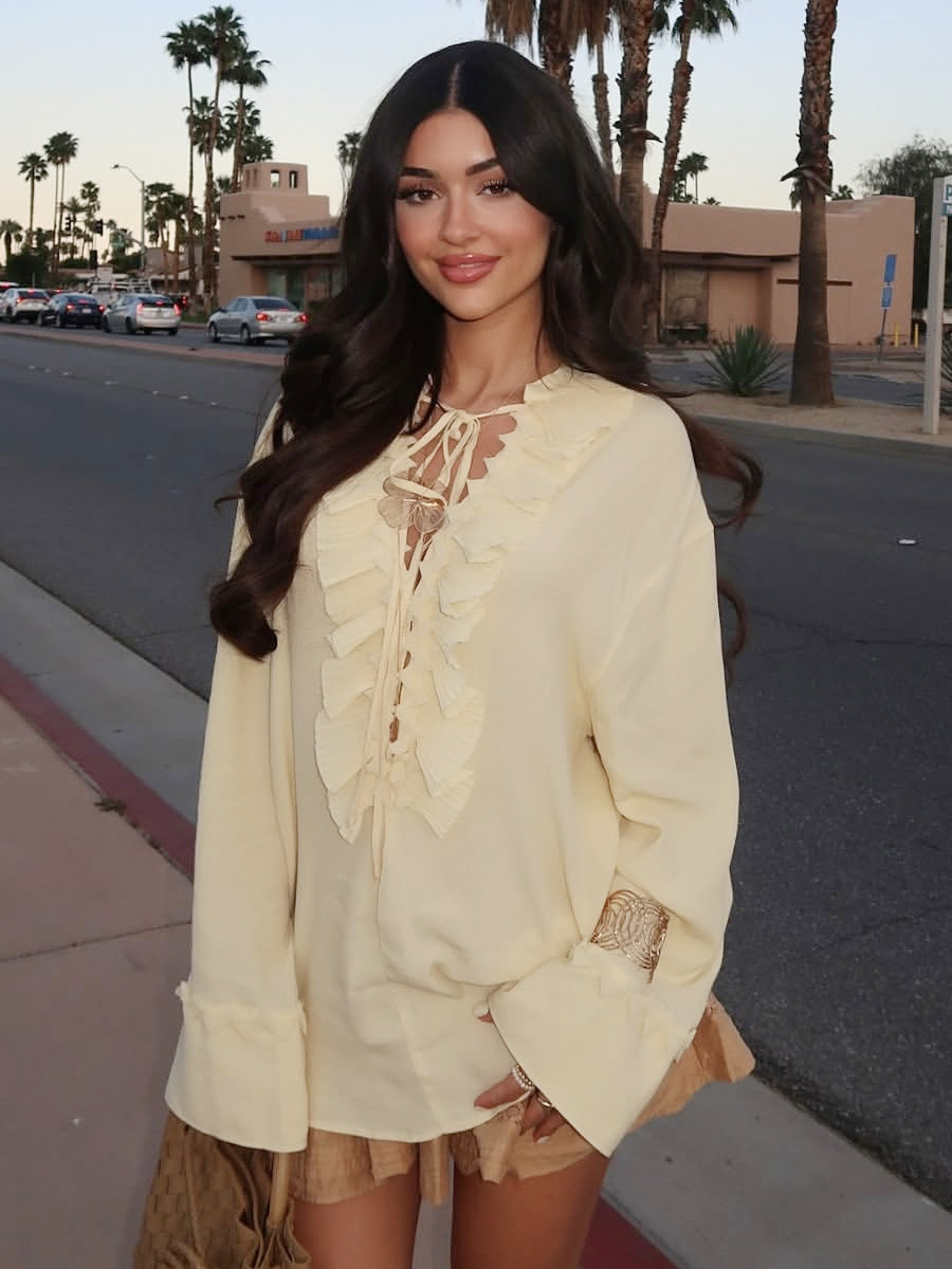 エレガントな淡い黄色のフリルVネックブラウス(オーバーサイズフィット)2025年レディース