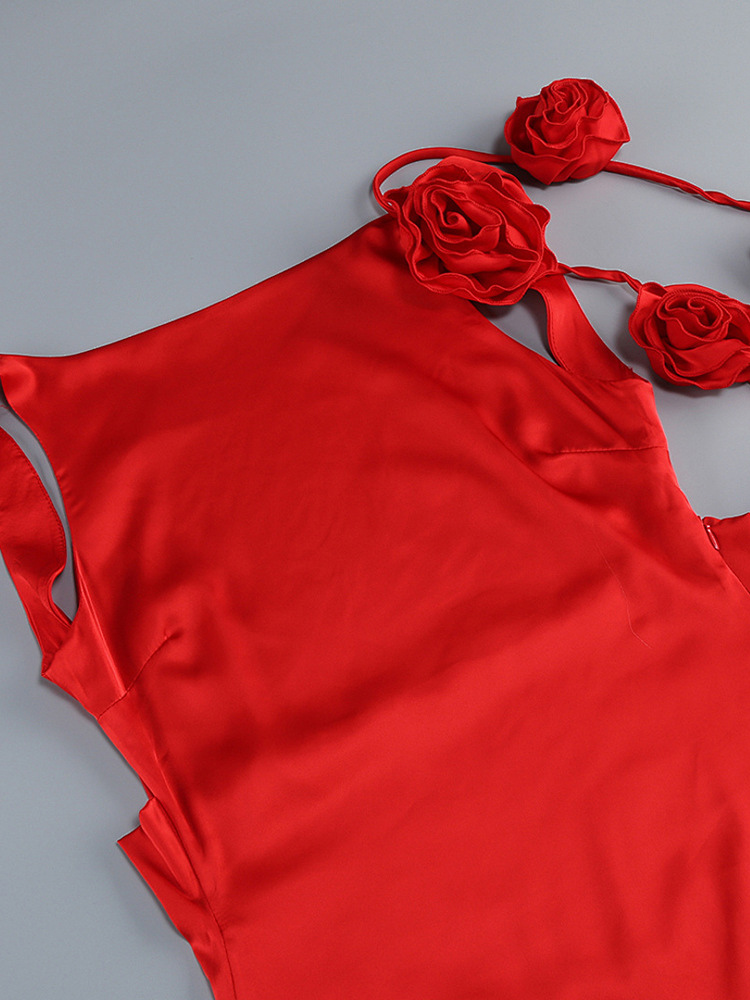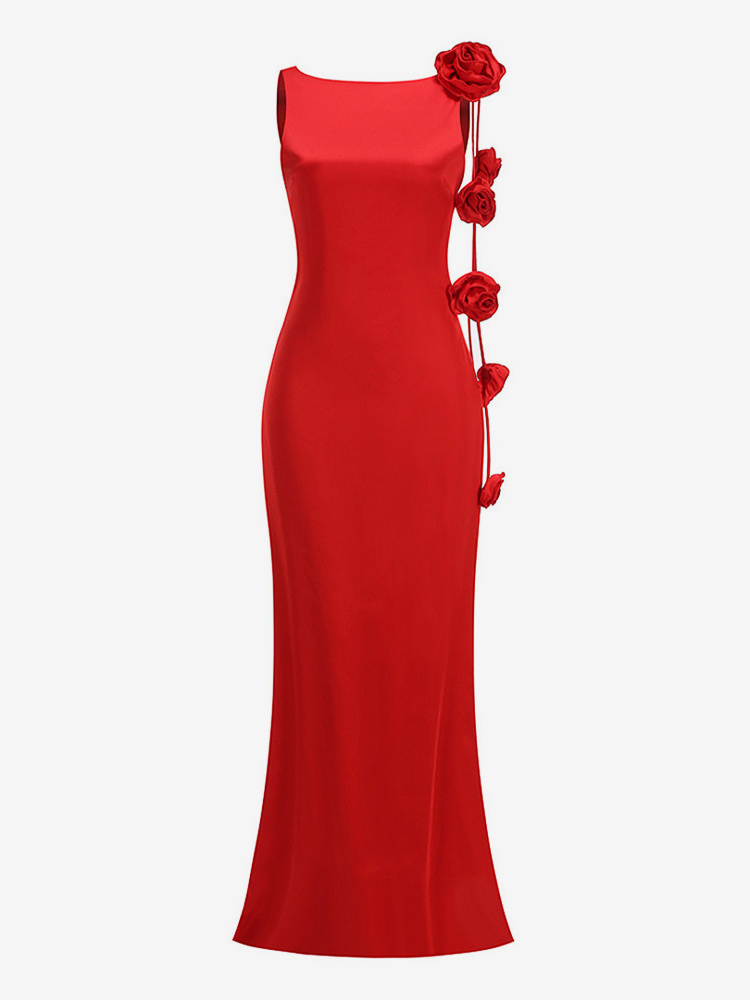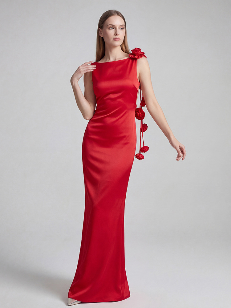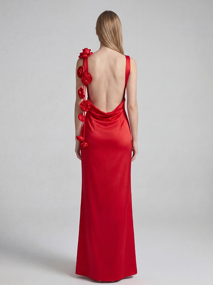 エレガントなロゼットマキシイブニングドレス(女性用) - 赤いサテンの背中開きボディコンロングガウン、3Dフラワー付き - 2026年夏のプロムパーティー