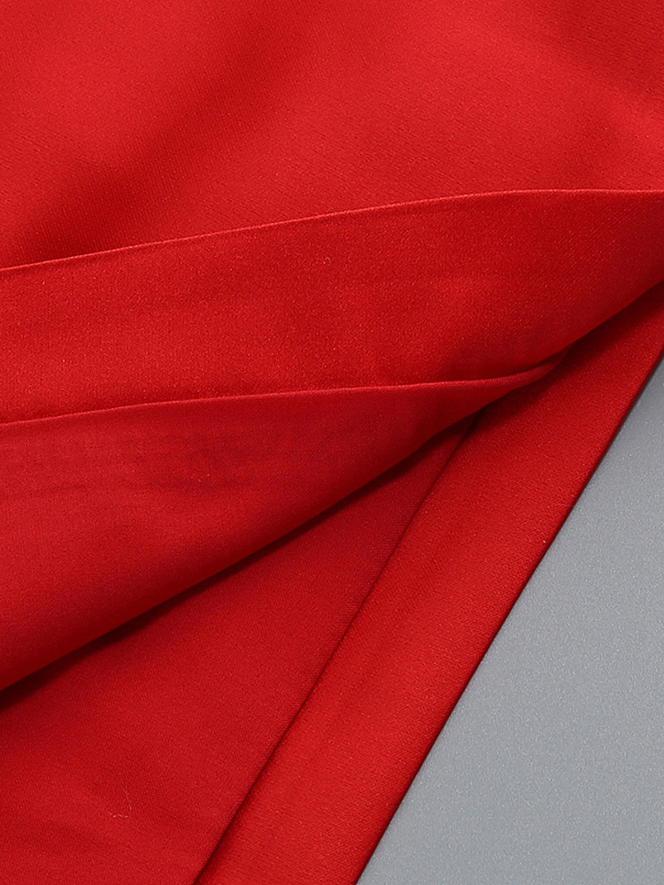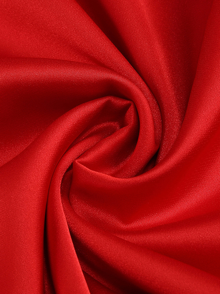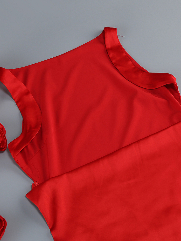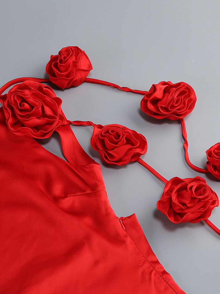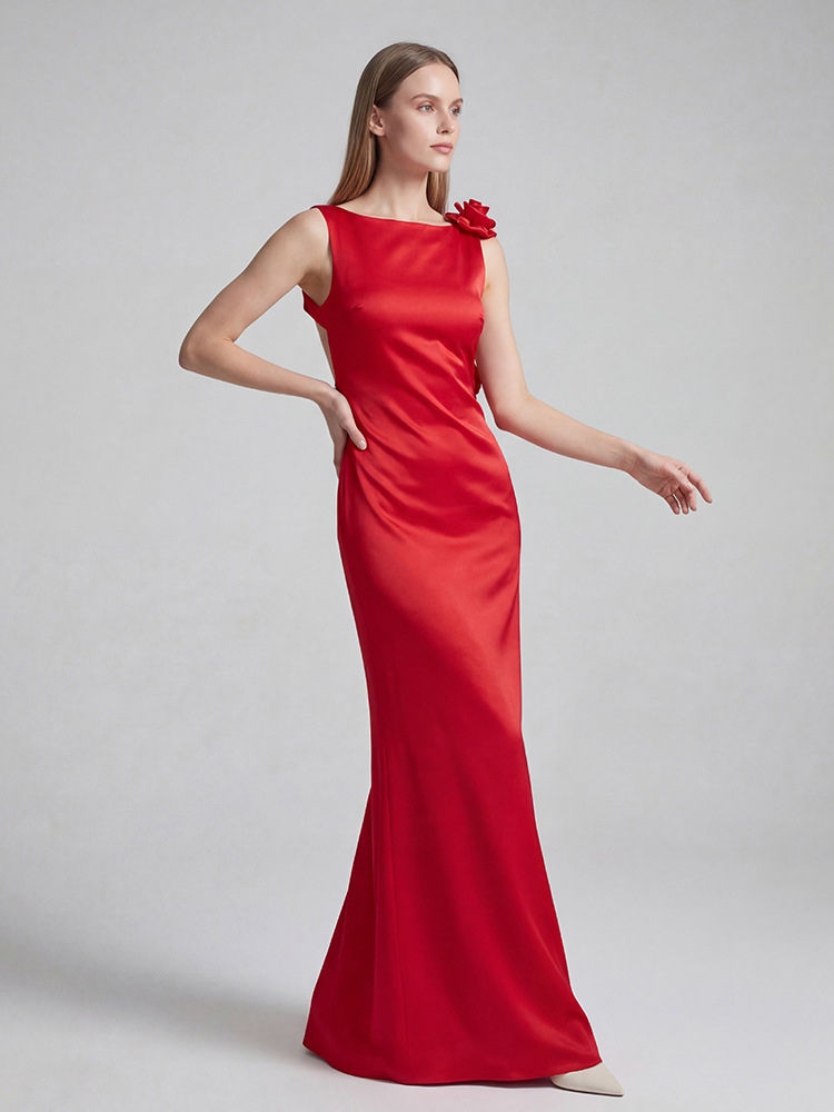 エレガントなロゼットマキシイブニングドレス(女性用) - 赤いサテンの背中開きボディコンロングガウン、3Dフラワー付き - 2026年夏のプロムパーティー