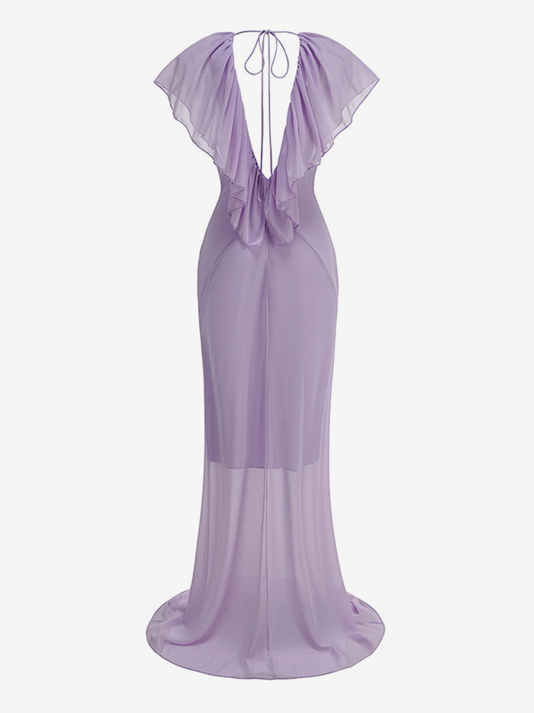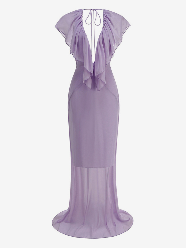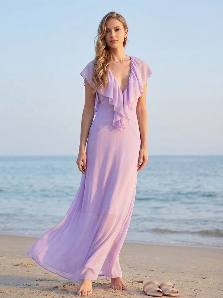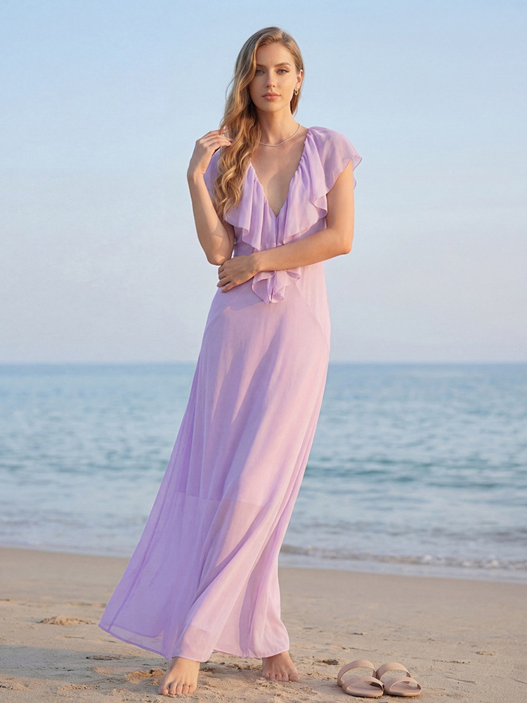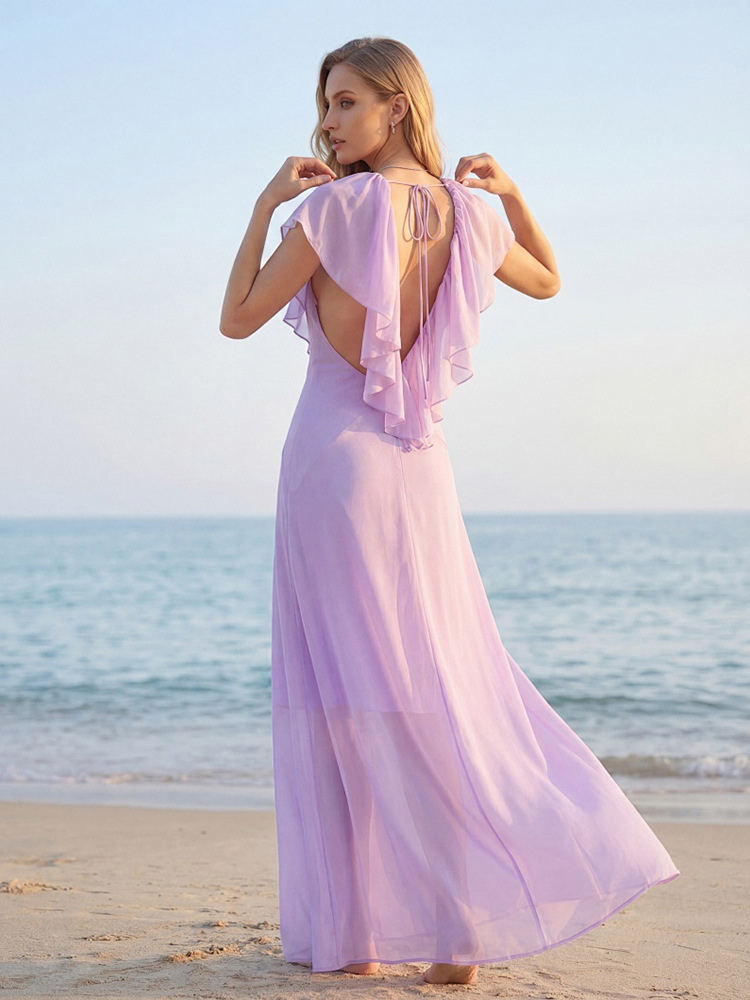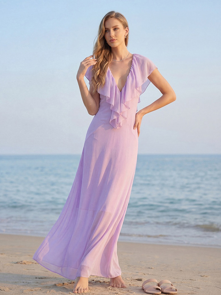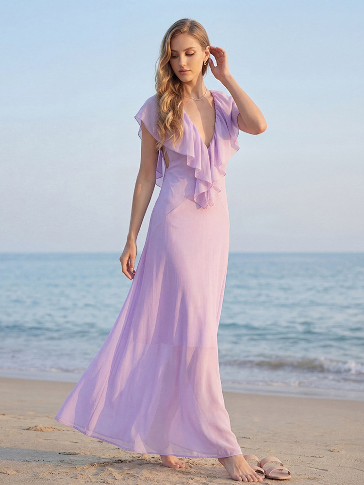 エレガントなフリル付きVネックシフォンマキシドレス(レディース) - ラベンダーカラーのボヘミアン風バックレスAラインサマードレス - 夏のビーチウェディングゲスト向け 2026