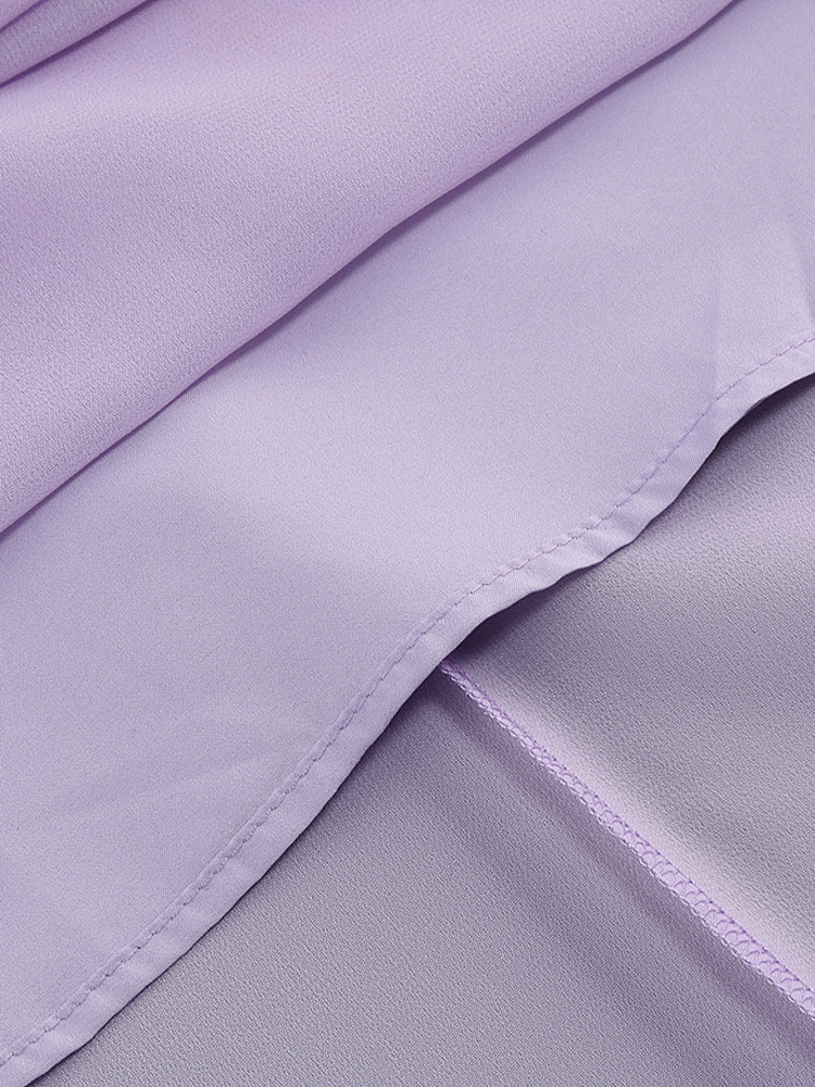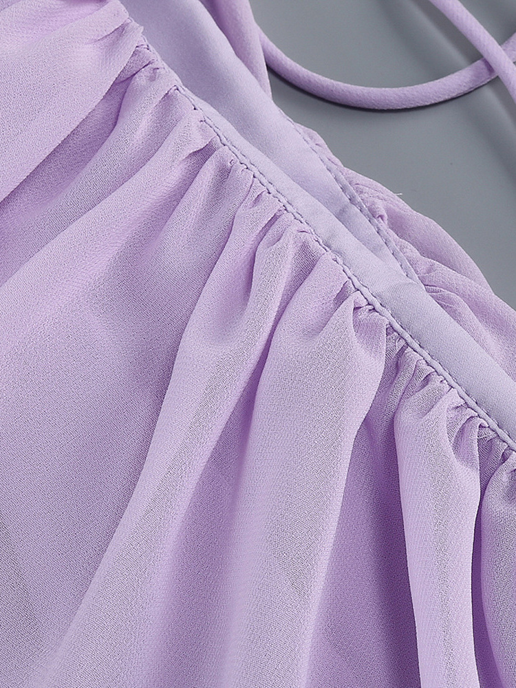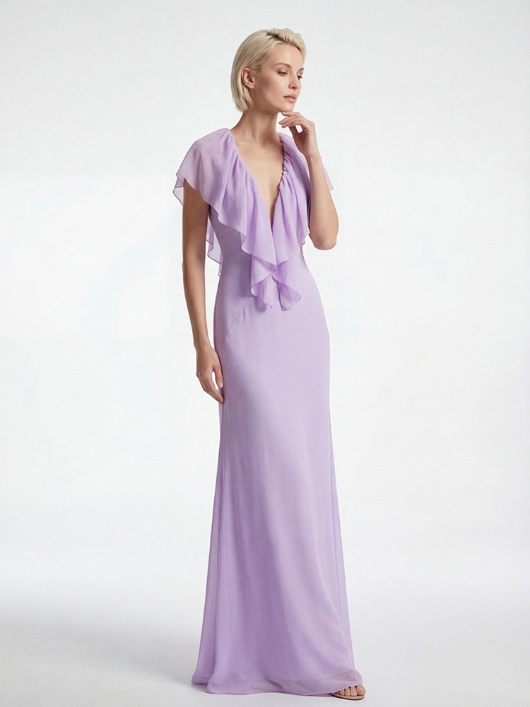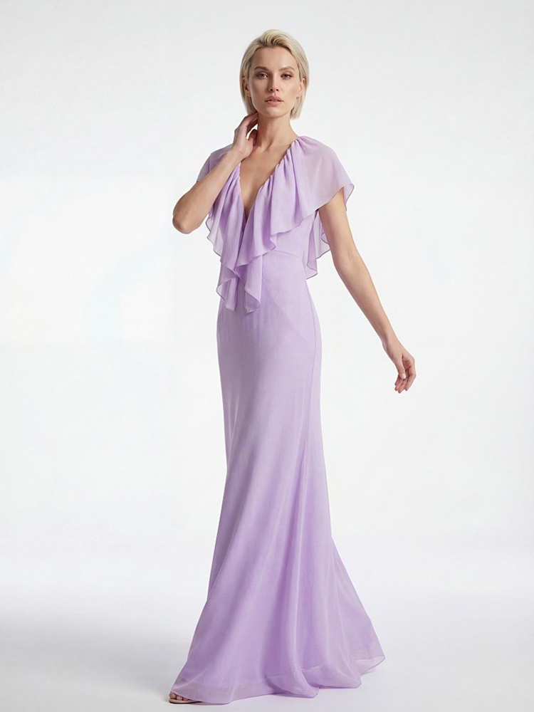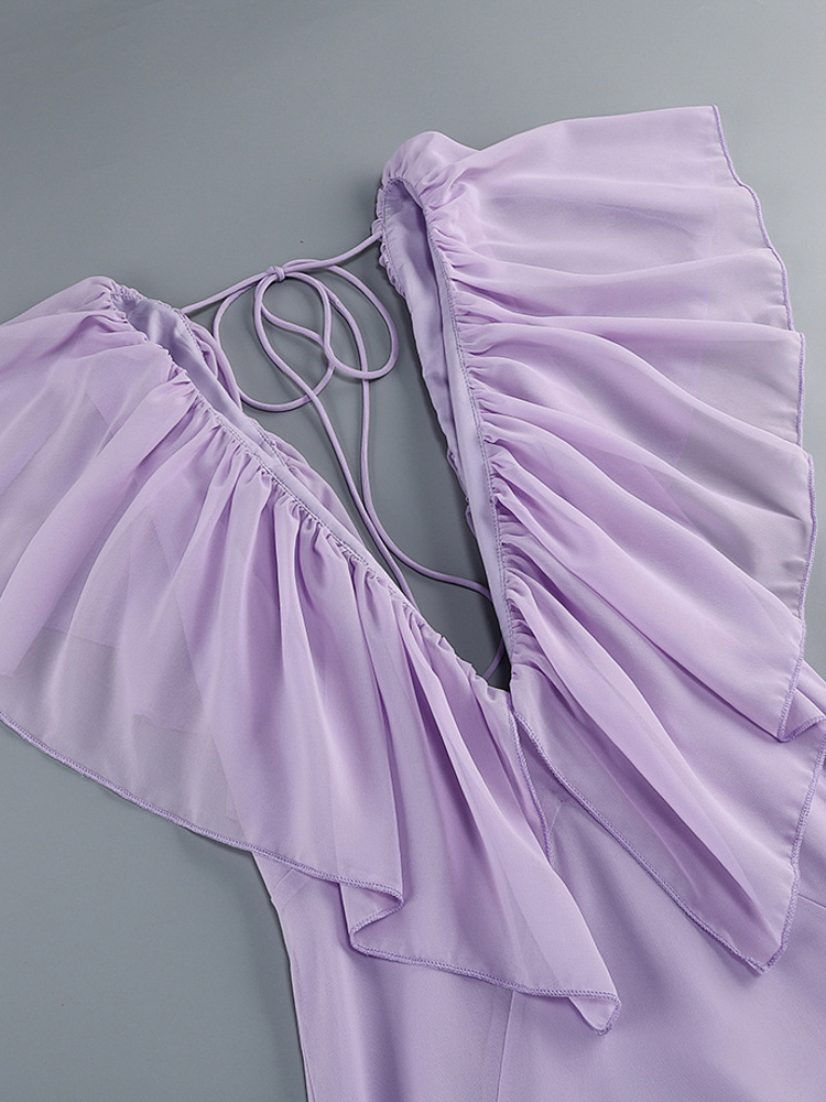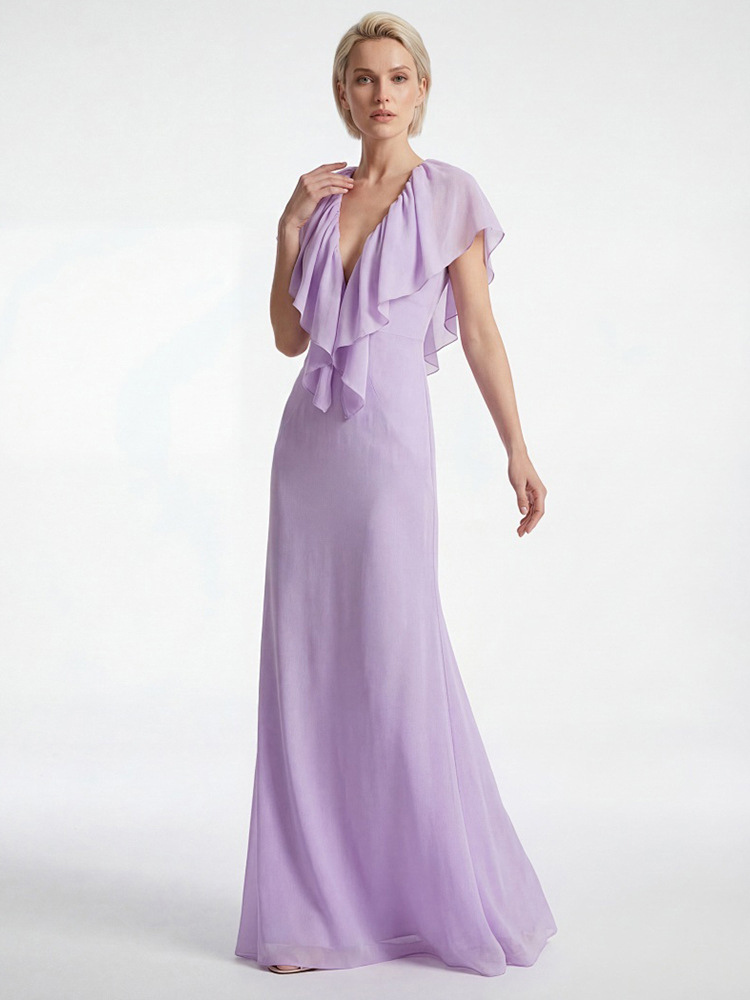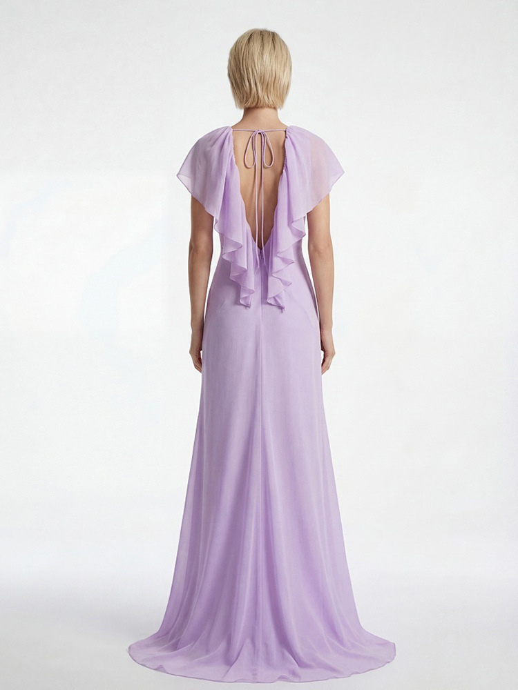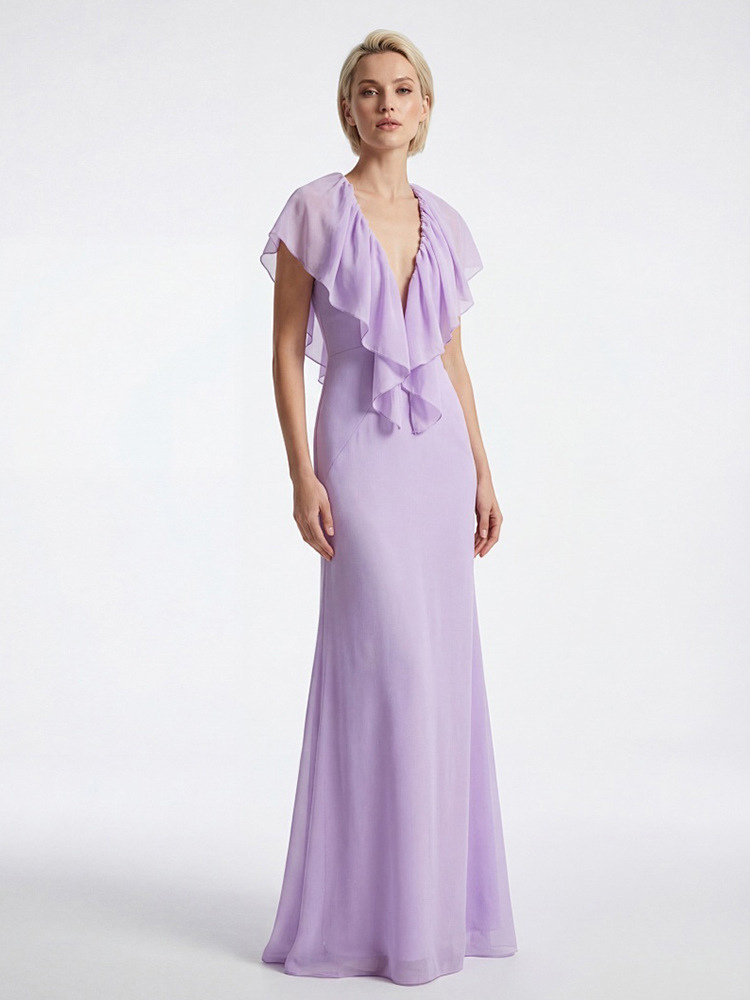 エレガントなフリル付きVネックシフォンマキシドレス(レディース) - ラベンダーカラーのボヘミアン風バックレスAラインサマードレス - 夏のビーチウェディングゲスト向け 2026