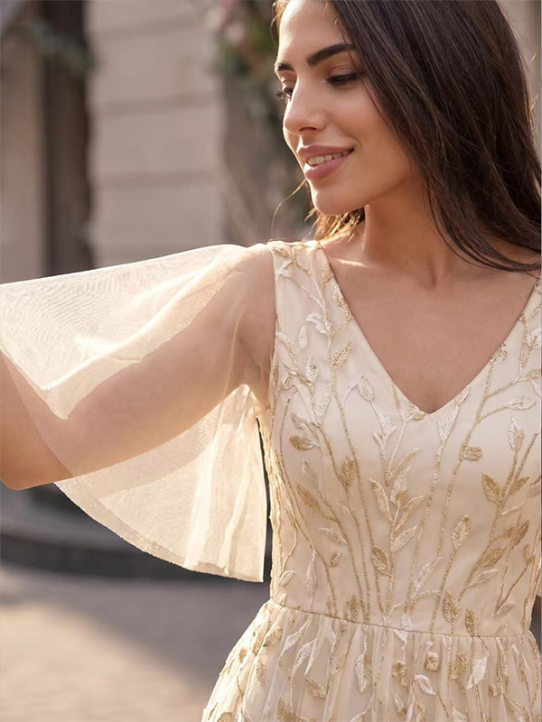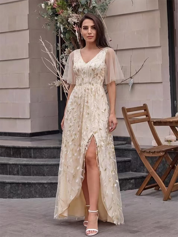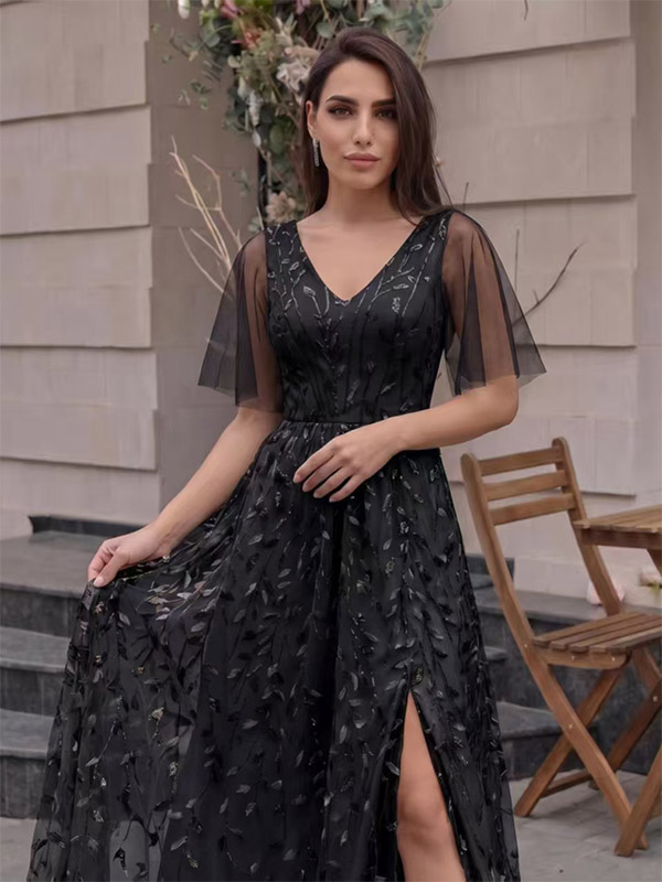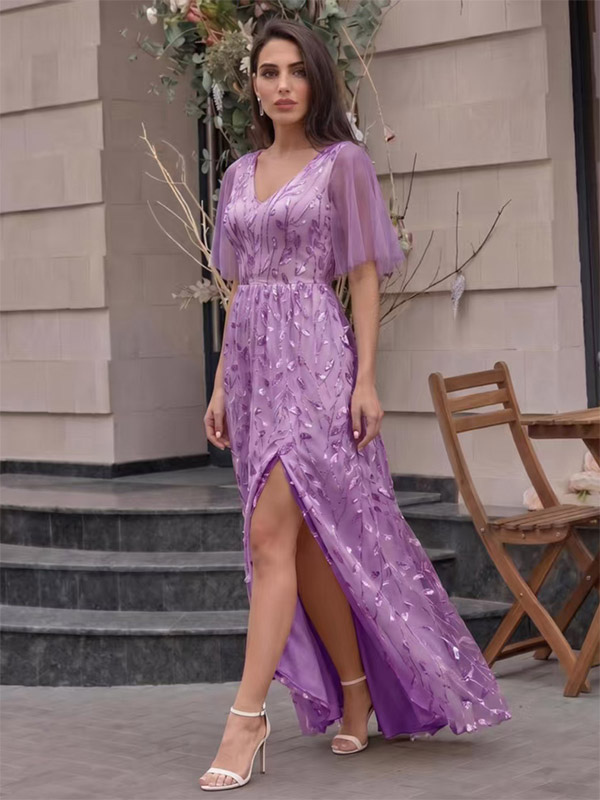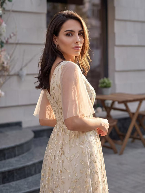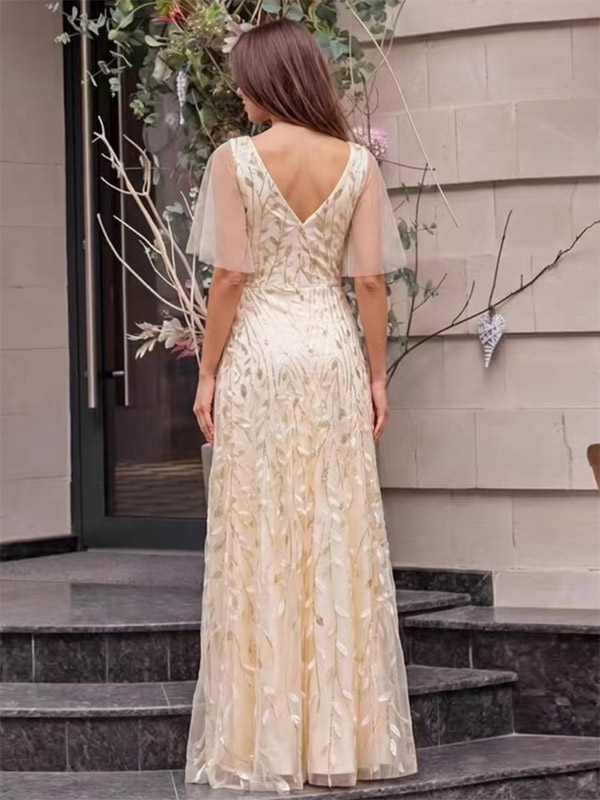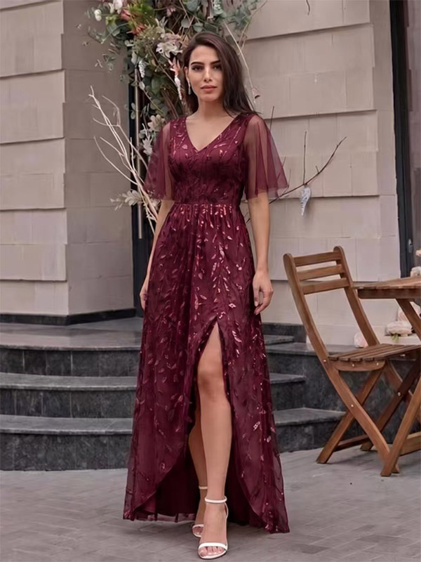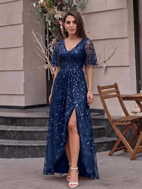 イブニングドレス Aライン Vネック スパンコール フロア丈 フォーマル パーティードレス